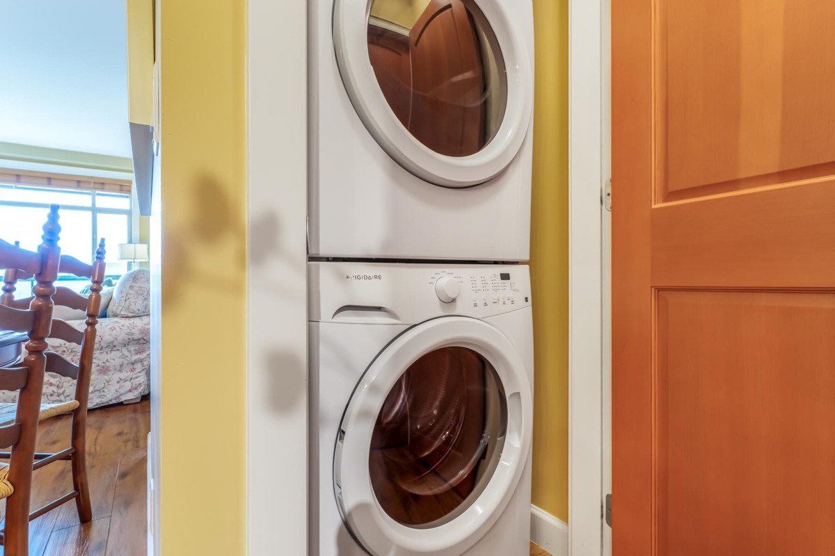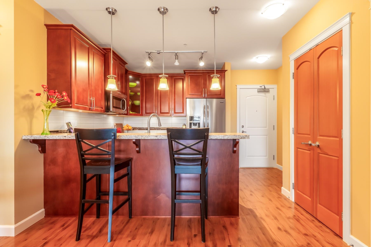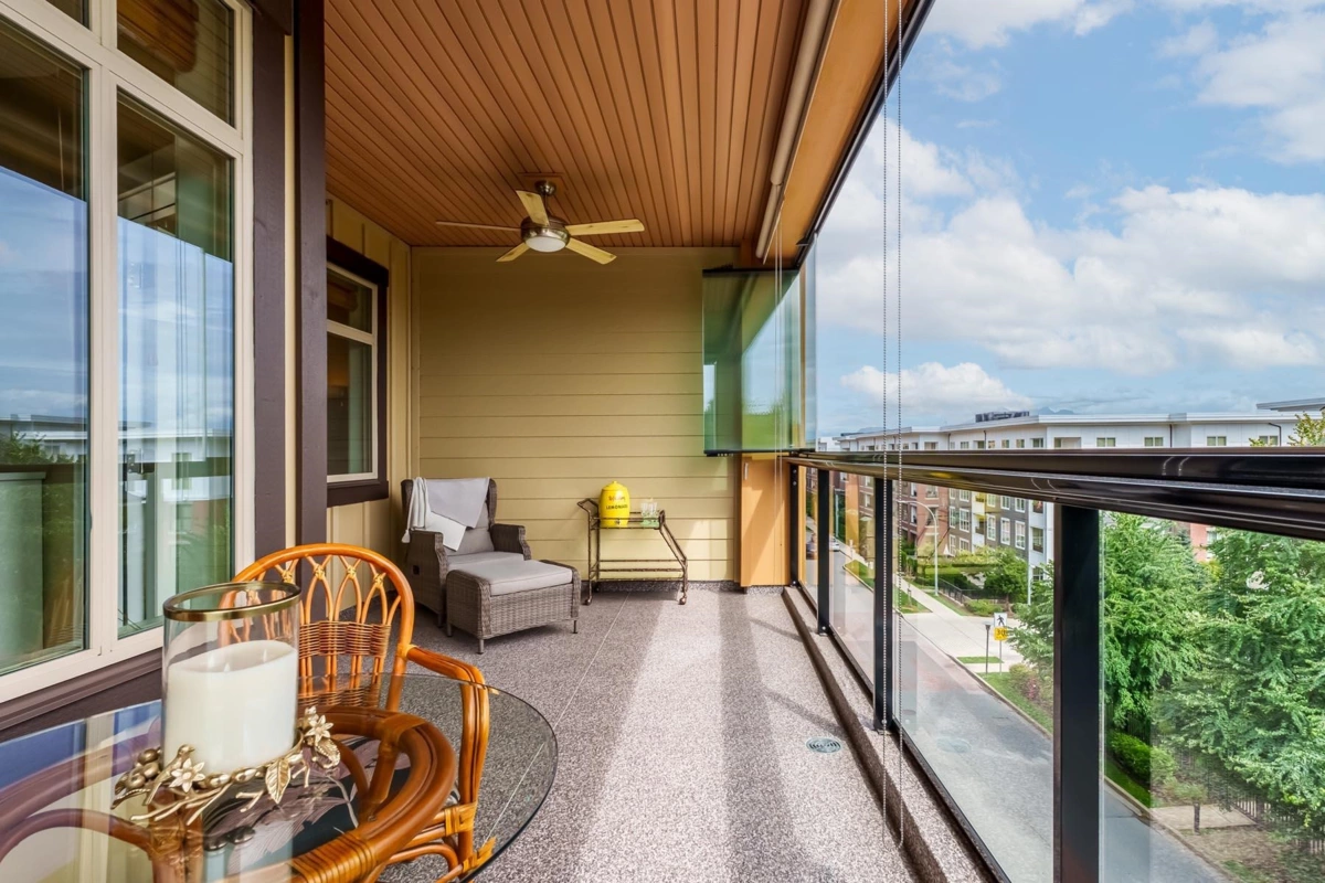 This stunning Willoughby Heights home offers a thoughtfully designed 2-BED + DEN on the quiet side of the building with exceptional features. The open dining & living area flows from the elegant cherry wood kitchen to a RARE covered, east facing balcony with bifold glass doors, adding 211 SF of usable living space. The primary bedroom includes a linen closet, W/I closet with mirrored doors & a safe. Extras: gym, versatile den (office, nursery, studio), pantry with electrical (2nd office?), ample storage, & 2 parking spots across from each other—one with private storage. Highly functional layout, premium finishings in a prime location. Don't miss out!