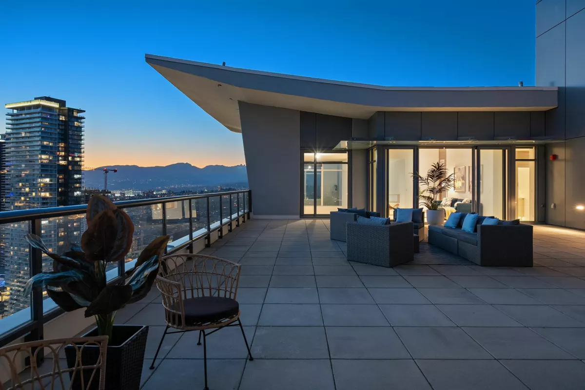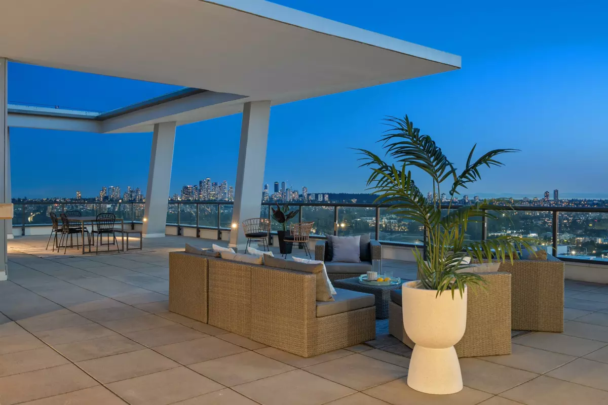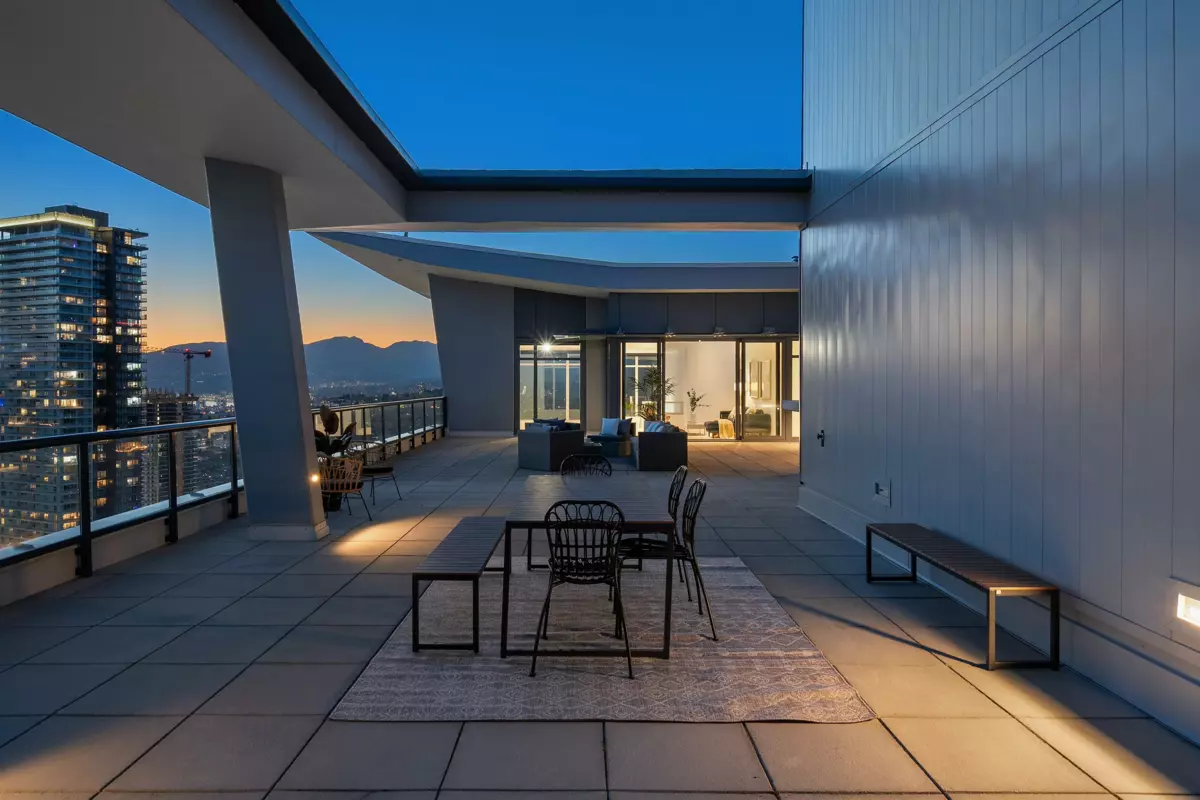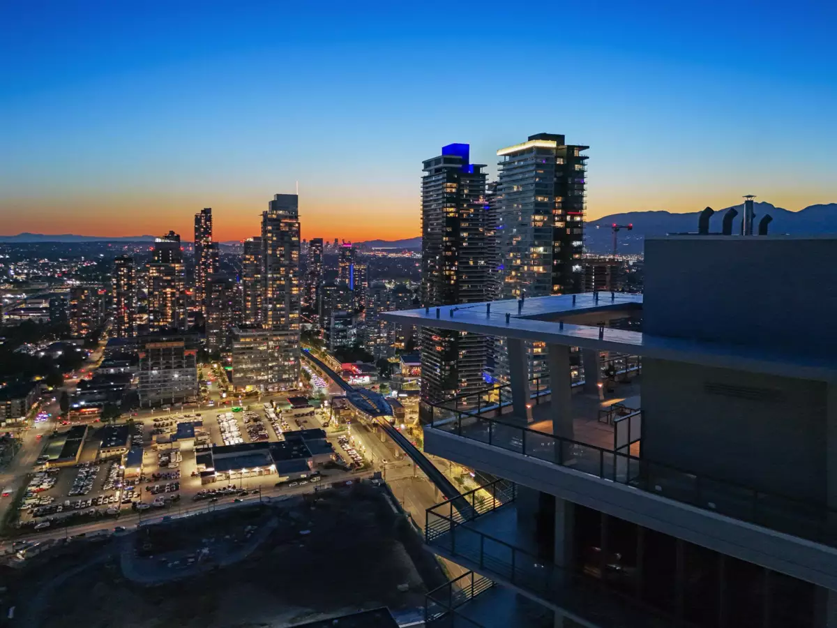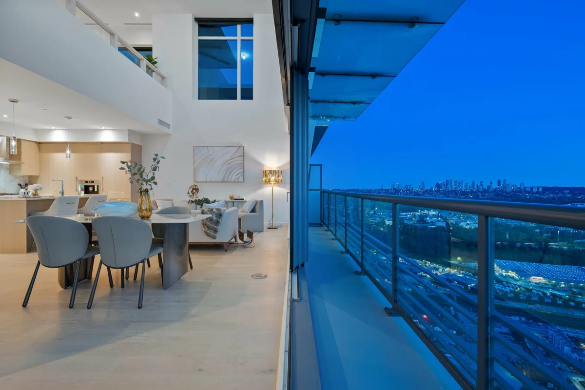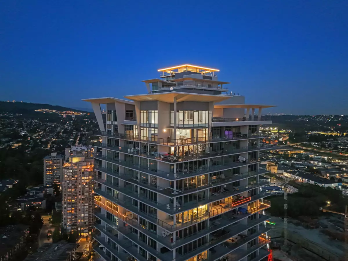 Discover luxury living in this stunning two-level penthouse by Concord Brentwood. Featuring three bedrooms, two living areas, and soaring ceilings, this home offers modern urban elegance. Floor-to-ceiling windows flood the space with natural light, framing breathtaking city and mountain views. The open-concept layout boasts hardwood floors, marble countertops, premium and appliances. Central A/C and heating ensure year-round comfort, while motorized blinds add convenience.Seamless indoor-outdoor living awaits with retractable balcony doors. The highlight? A 2,600 sq. ft. private rooftop terrace with a built-in BBQ, perfect for entertaining. A private two-car garage completes this rare offering. Act fast—this opportunity won’t last! Open House Nov 29 11:00 AM -1:00 PM !