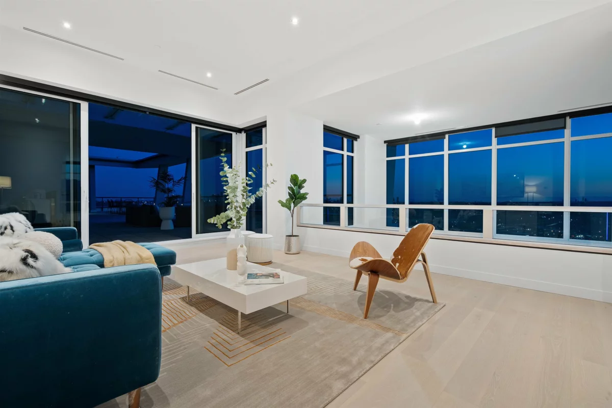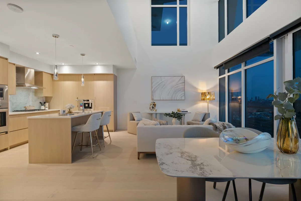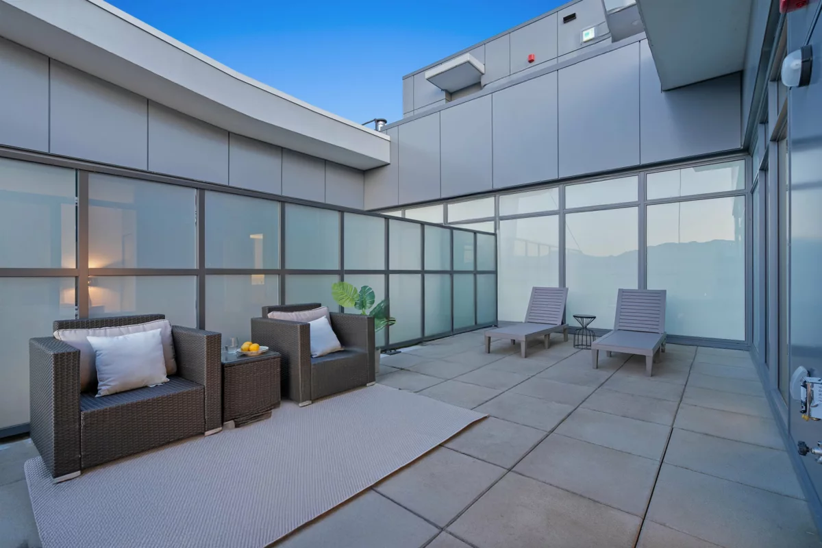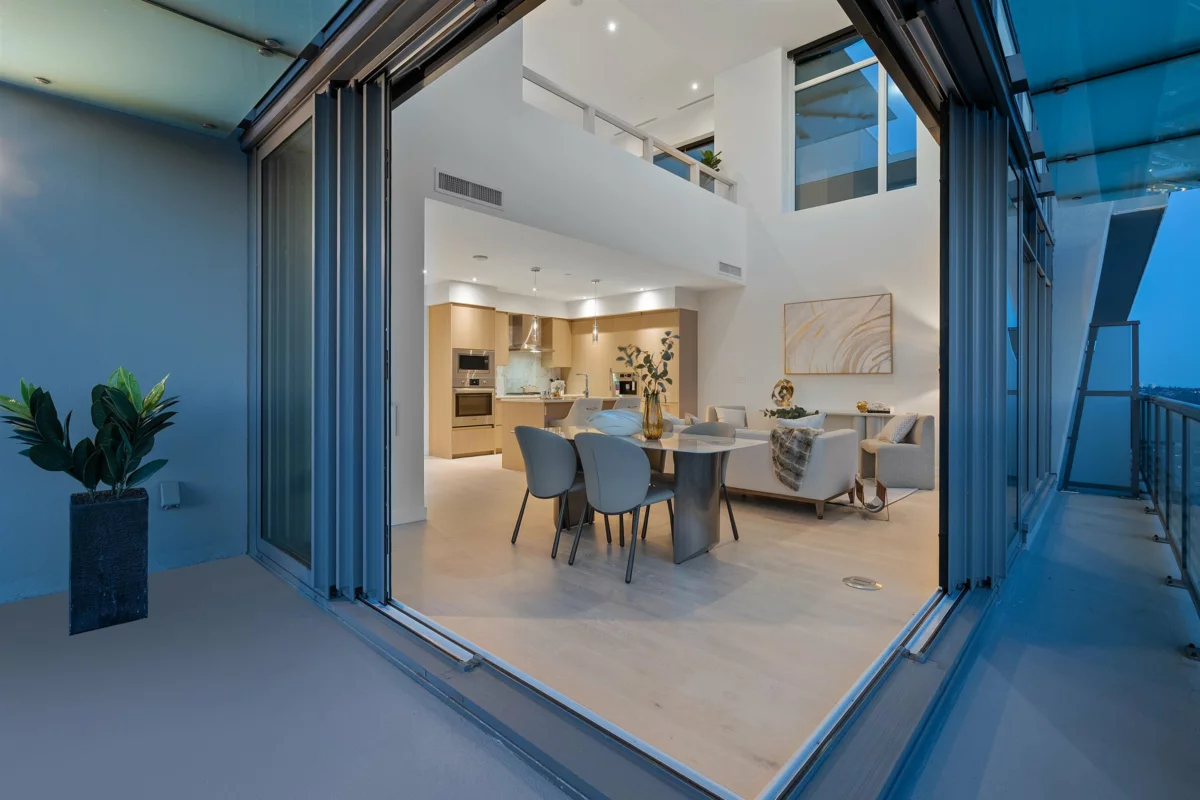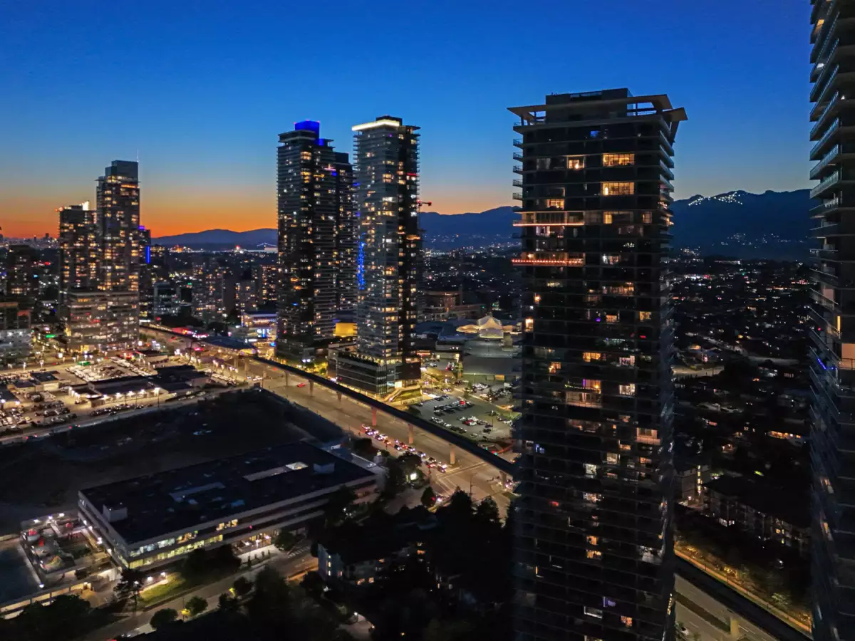 Discover luxury living in this stunning two-level penthouse by Concord Brentwood. Featuring three bedrooms, two living areas, and soaring ceilings, this home offers modern urban elegance. Floor-to-ceiling windows flood the space with natural light, framing breathtaking city and mountain views. The open-concept layout boasts hardwood floors, marble countertops, premium and appliances. Central A/C and heating ensure year-round comfort, while motorized blinds add convenience.Seamless indoor-outdoor living awaits with retractable balcony doors. The highlight? A 2,600 sq. ft. private rooftop terrace with a built-in BBQ, perfect for entertaining. A private two-car garage completes this rare offering. Act fast—this opportunity won’t last! Open House Nov 29 11:00 AM -1:00 PM !