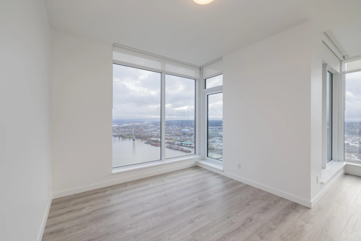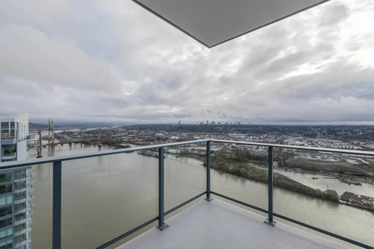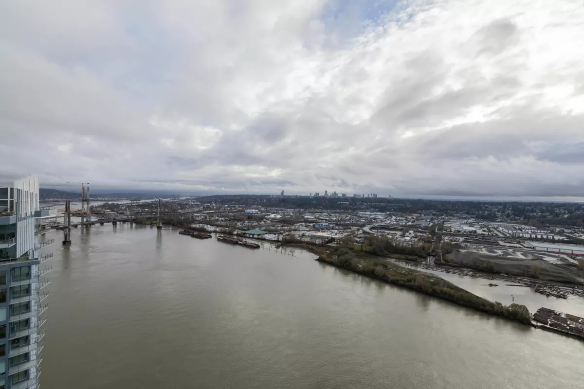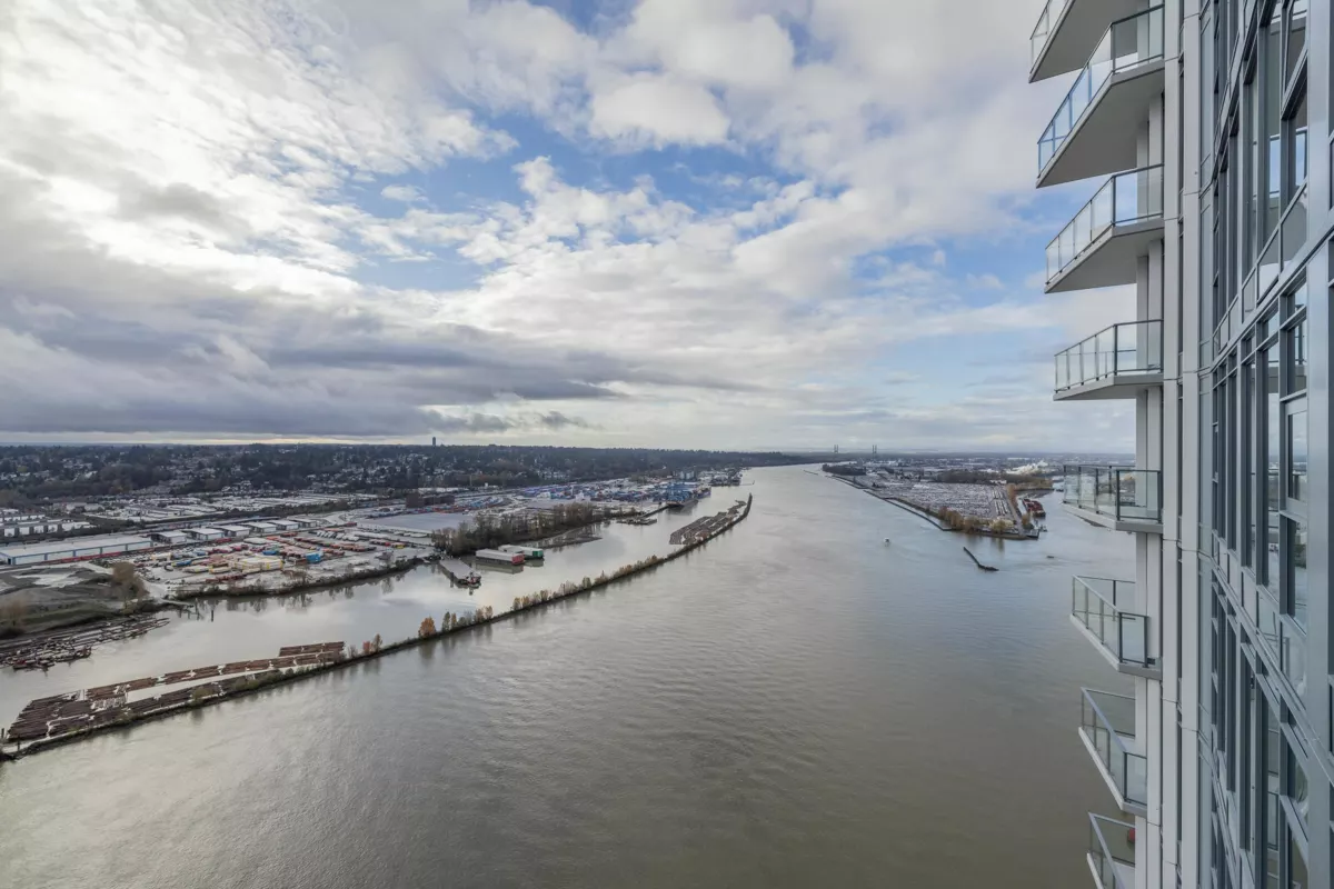 Welcome to the Sky Collection at Pier West, New Westminster’s signature waterfront address. This two bedroom plus den spans 1,277 square feet with unobstructed southern views over the Fraser River. Floor to ceiling windows flood the open plan with light, and a chef’s kitchen anchors the space with ample cabinetry, a gas range, and a double door fridge. The den works as a proper office, the bedrooms are well separated, and the primary includes a generous closet and ensuite. Building amenities include a full gym, sauna, and a comfortable social room. Two parking and a storage locker are included. Step outside to the boardwalk, local shops, cafes, and riverside trails. Elevated, easy living on the water, part of the exclusive Sky Collection.