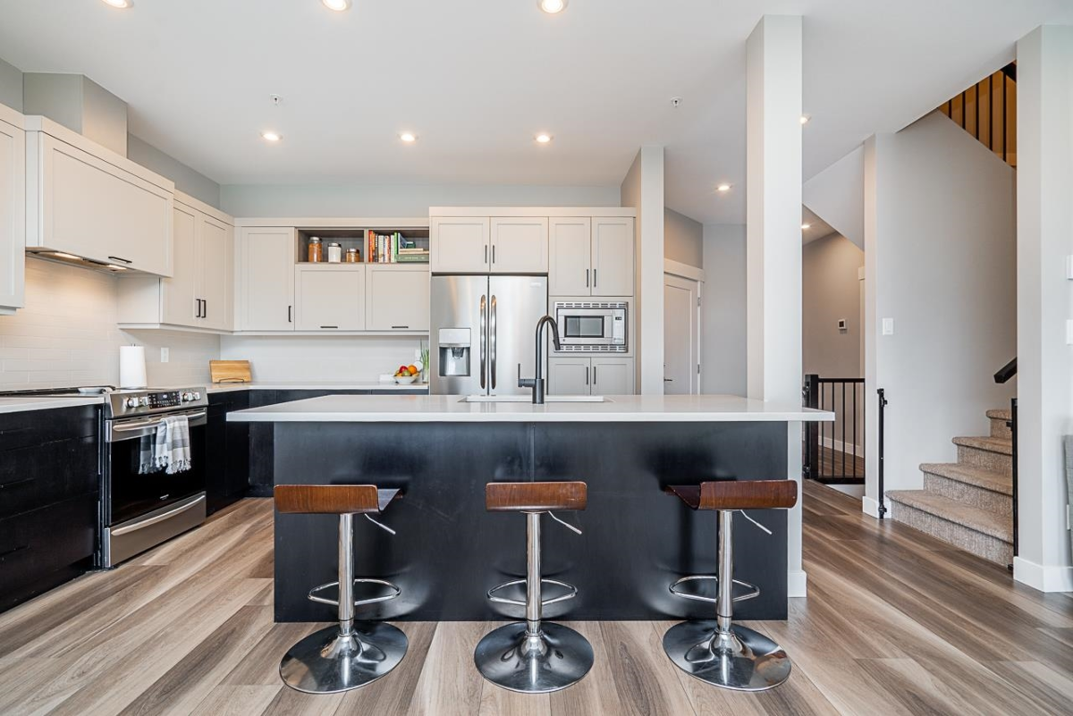 Welcome to Water’s Edge! This beautiful 4-bedroom, 4-bathroom, three level townhouse with beautiful views of the Fraser River is not to be missed! Open-concept kitchen & living room area with stainless steel appliances, quartz countertops is perfect for hosting, with access to the deck with custom sun shades. This townhouse features 3 bedrooms up, with a beautiful primary suite boasting a large walk-in closet, ensuite with soaker tub and shower, and has its own private deck to enjoy the amazing views. Downstairs enjoy a large Rec Room, and additional 4th bedroom, along with a large storage room, and a fully fenced patio area on the basement floor, perfect for kids or pets. This home comes complete with a double side-by-side garage, A/C. Call to book your private showing today!