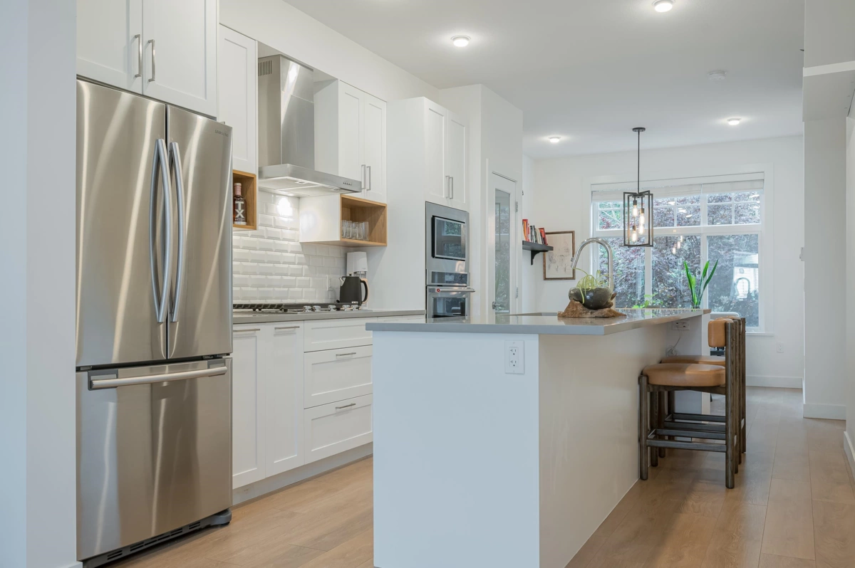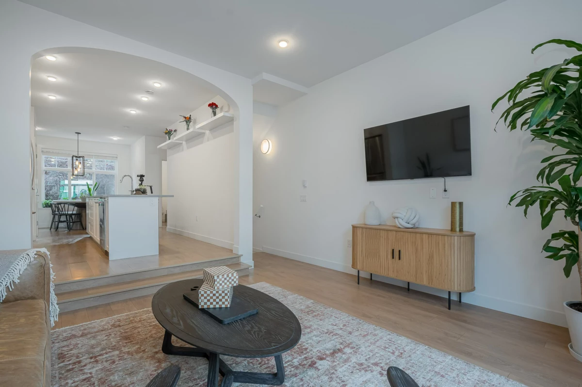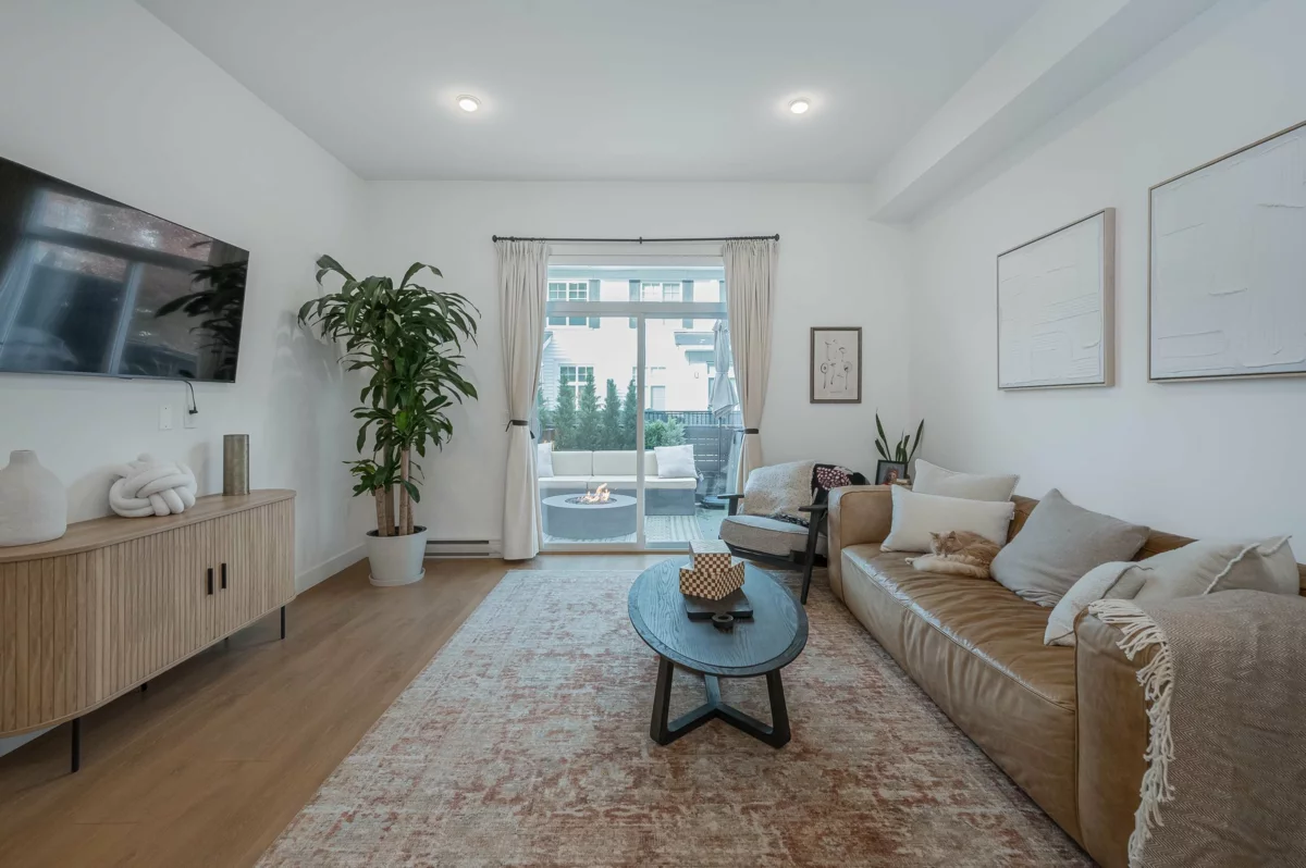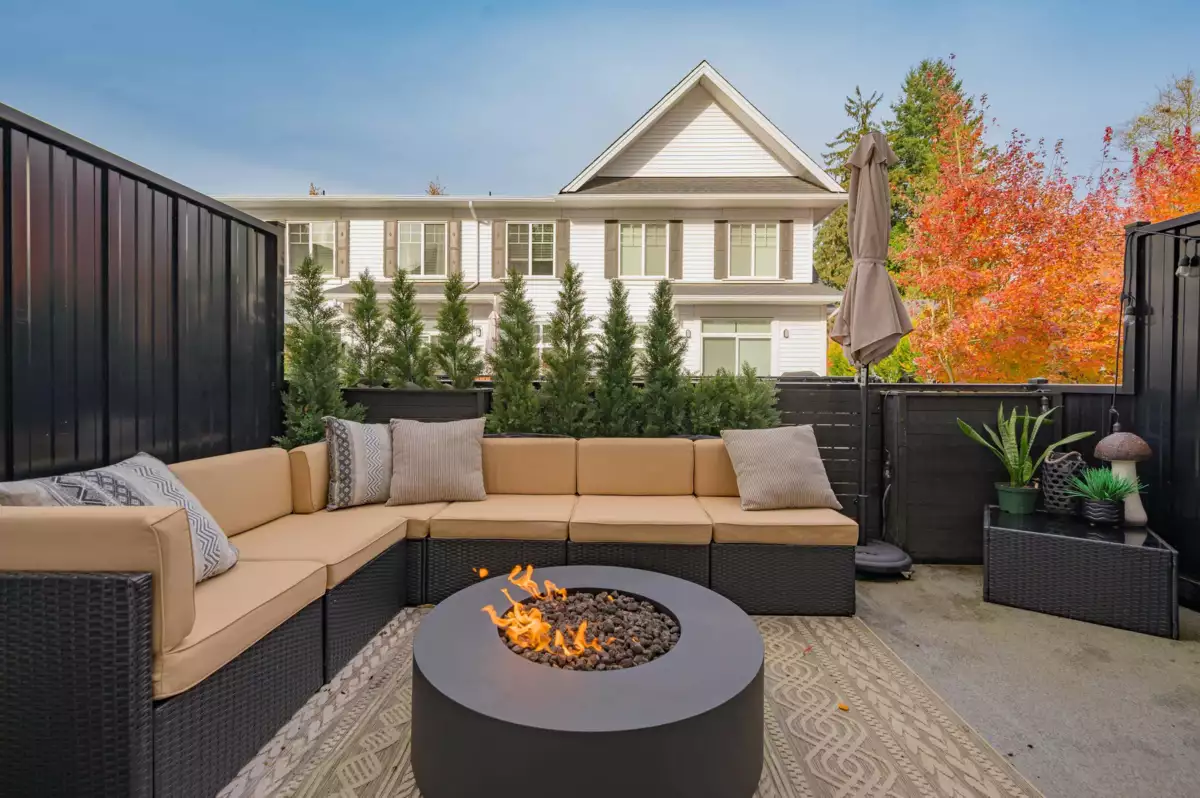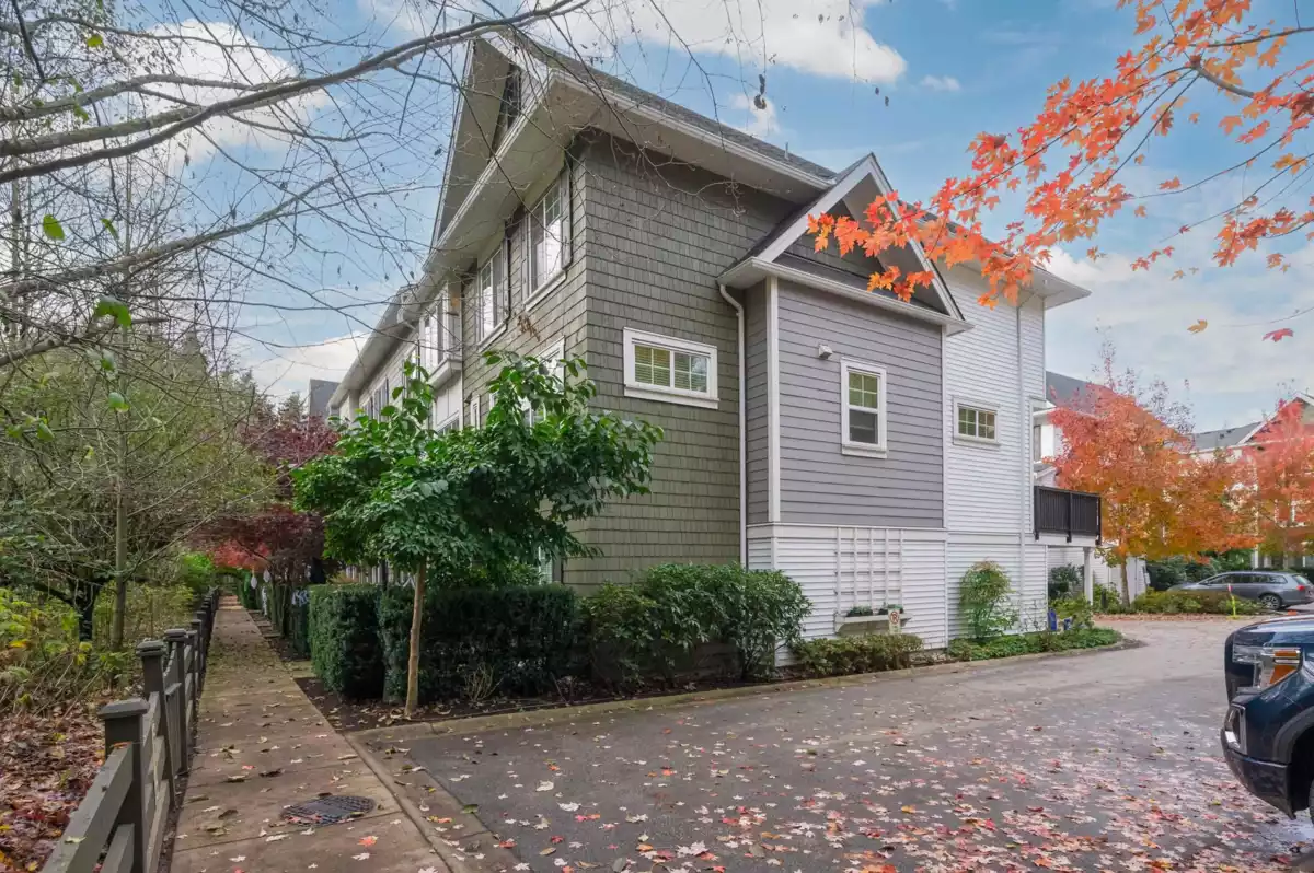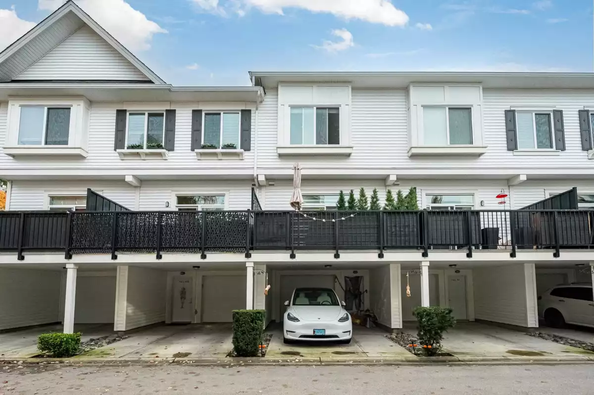 Luxurious and impeccably kept 1401 sq. ft three bedroom unit boasting 9-foot ceilings, a gourmet island kitchen with breakfast bar, high-end stainless steel appliances, and elegant quartz countertops. This exceptional residence offers a rare 2 pc powder room on the main floor, two generously sized bedrooms upstairs with ensuite bathrooms on the upper level, and a versatile bedroom/den space downstairs with direct access to backyard that backs onto peaceful greenspace. Step outside to the expansive 15' x 10'5 deck off the living room. Ideally situated in South Surrey adjacent to The Hills Golf Course and Noble restaurant, 2 blocks to Douglas Elementary School, close proximity to a regional mall, and an array of commercial and medical amenities.