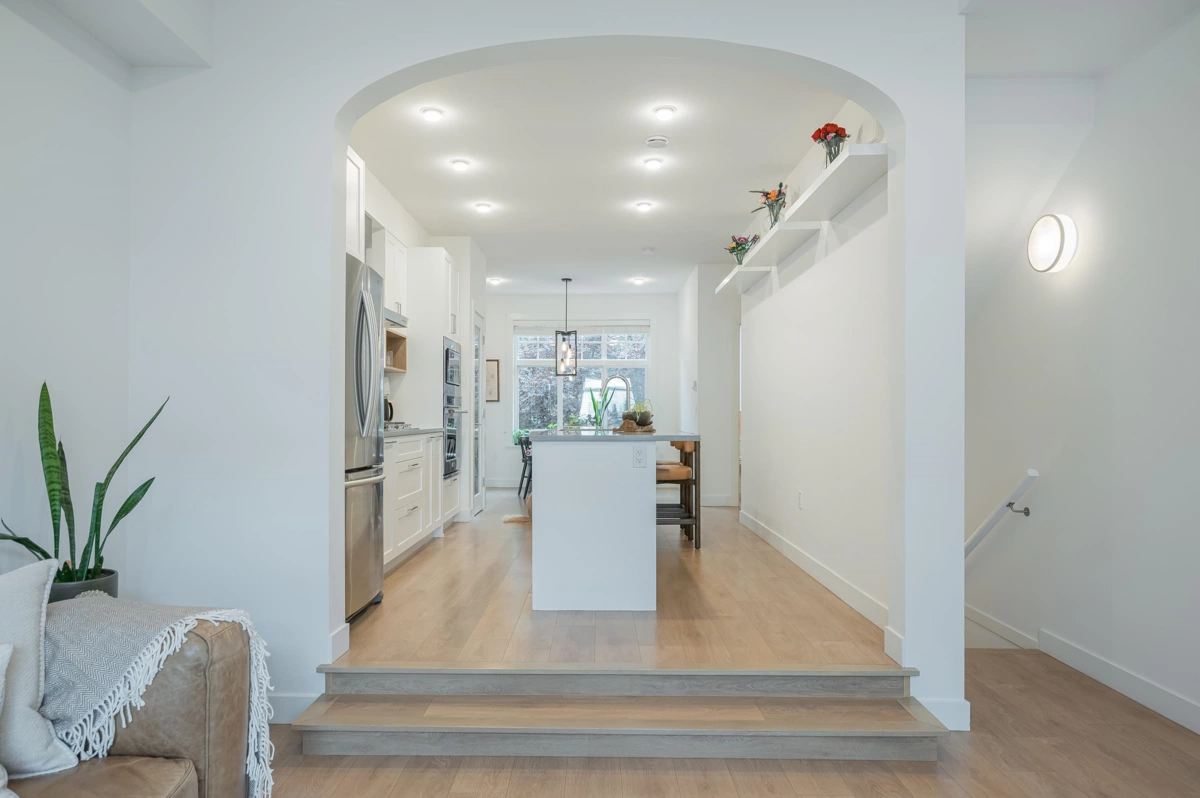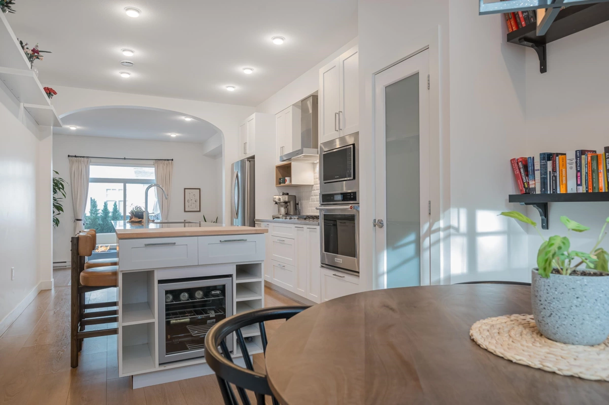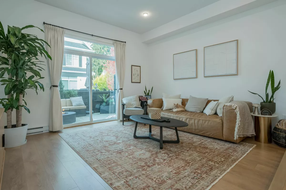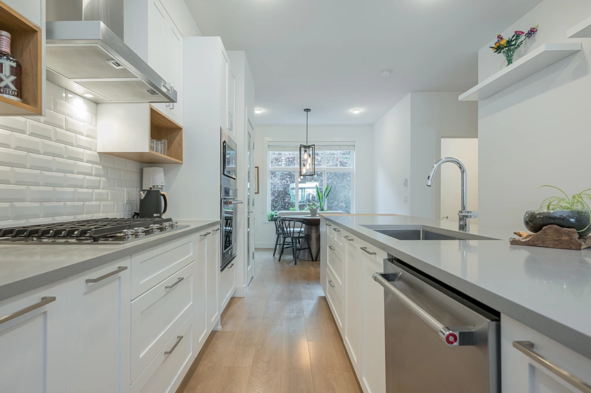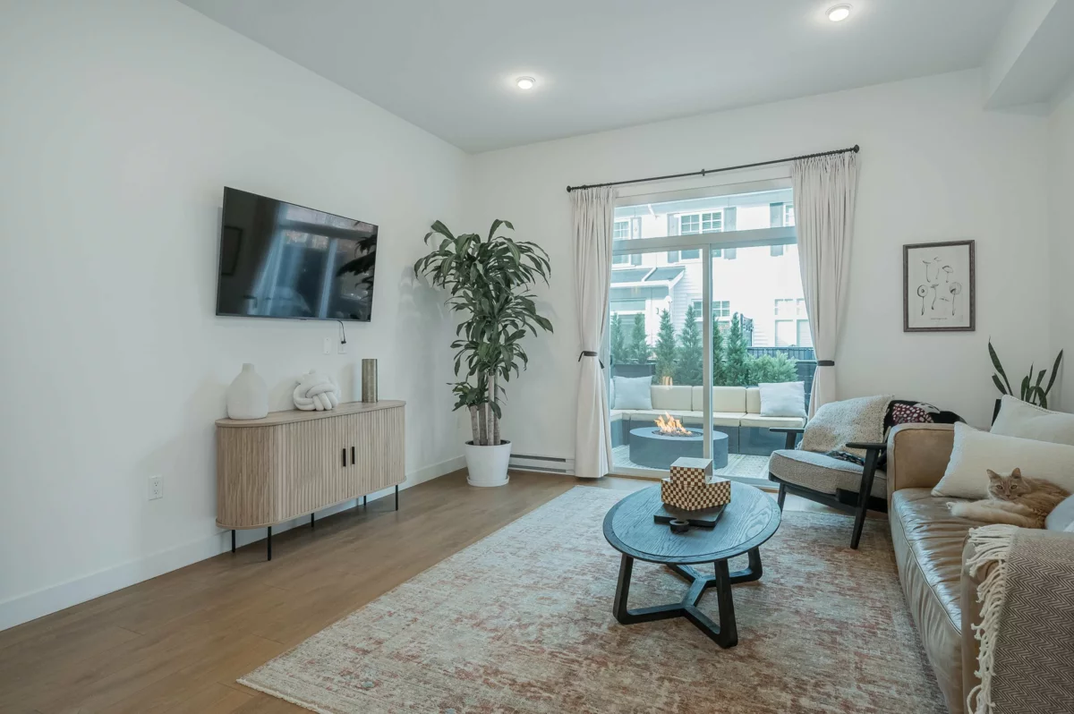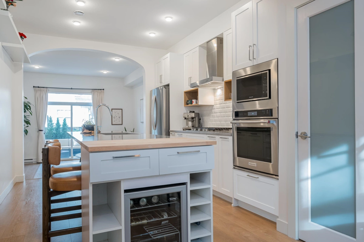 Luxurious and impeccably kept 1401 sq. ft three bedroom unit boasting 9-foot ceilings, a gourmet island kitchen with breakfast bar, high-end stainless steel appliances, and elegant quartz countertops. This exceptional residence offers a rare 2 pc powder room on the main floor, two generously sized bedrooms upstairs with ensuite bathrooms on the upper level, and a versatile bedroom/den space downstairs with direct access to backyard that backs onto peaceful greenspace. Step outside to the expansive 15' x 10'5 deck off the living room. Ideally situated in South Surrey adjacent to The Hills Golf Course and Noble restaurant, 2 blocks to Douglas Elementary School, close proximity to a regional mall, and an array of commercial and medical amenities.