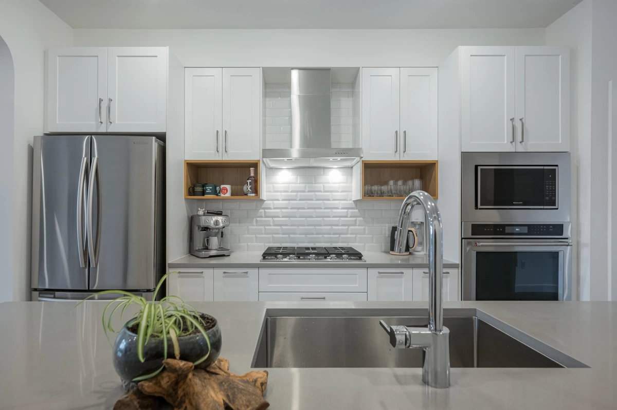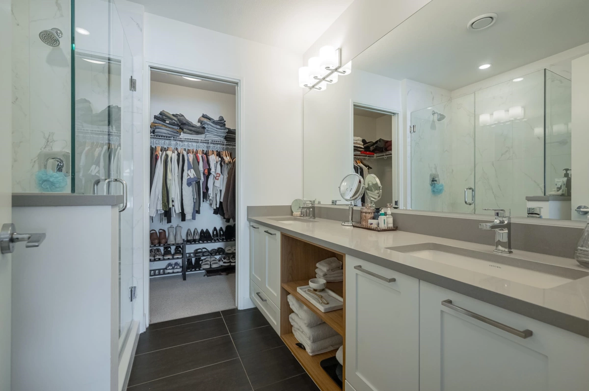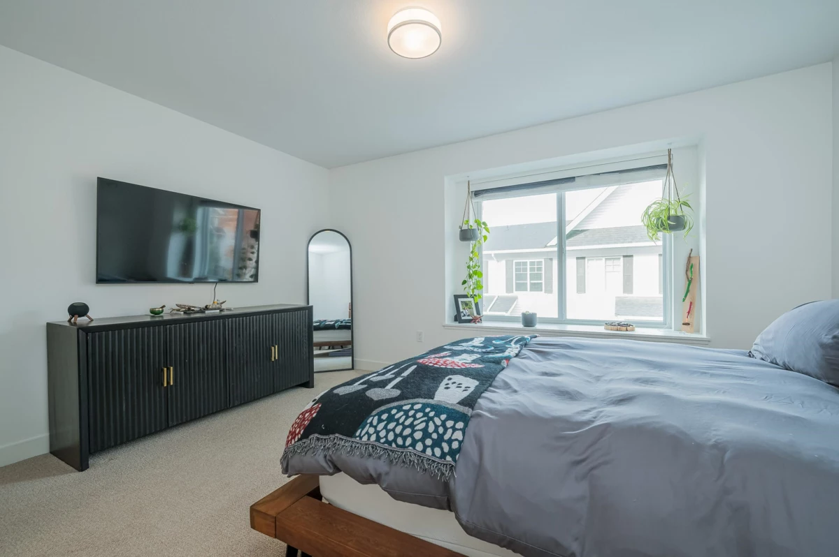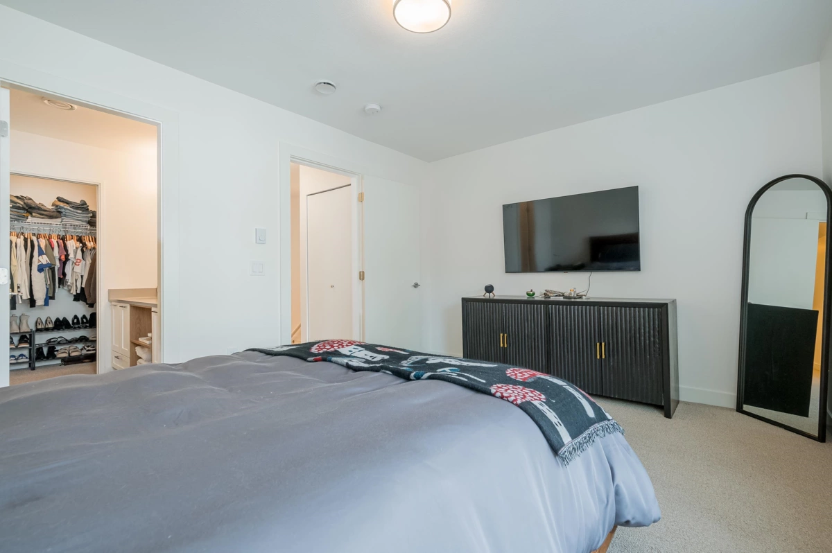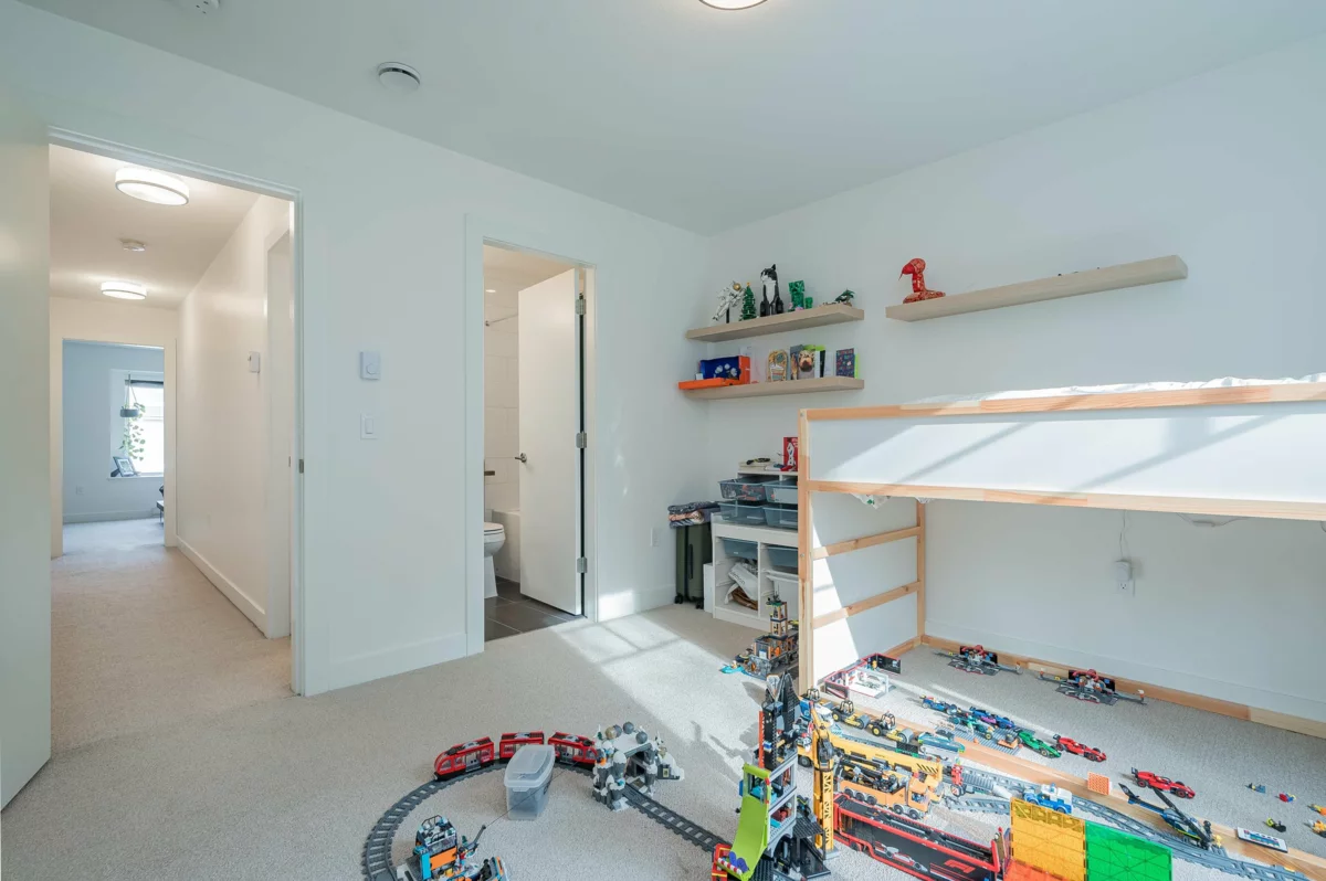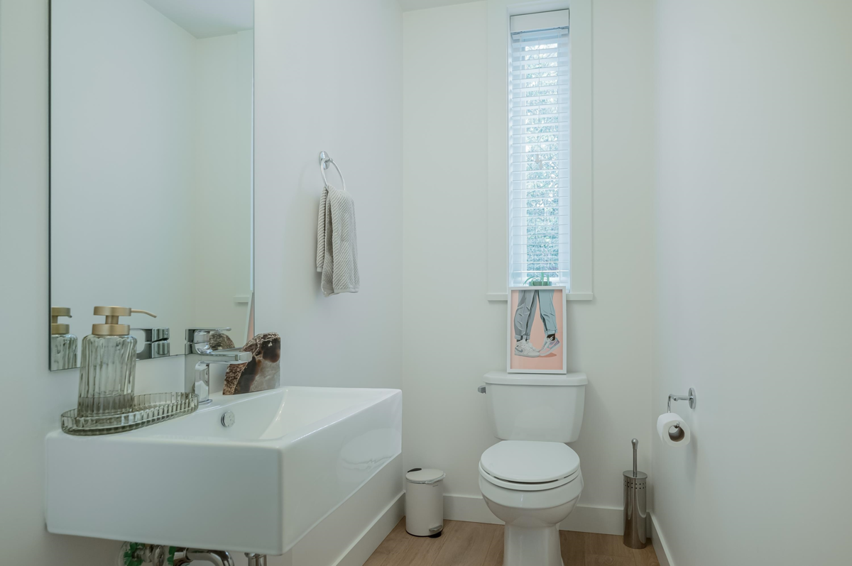 Luxurious and impeccably kept 1401 sq. ft three bedroom unit boasting 9-foot ceilings, a gourmet island kitchen with breakfast bar, high-end stainless steel appliances, and elegant quartz countertops. This exceptional residence offers a rare 2 pc powder room on the main floor, two generously sized bedrooms upstairs with ensuite bathrooms on the upper level, and a versatile bedroom/den space downstairs with direct access to backyard that backs onto peaceful greenspace. Step outside to the expansive 15' x 10'5 deck off the living room. Ideally situated in South Surrey adjacent to The Hills Golf Course and Noble restaurant, 2 blocks to Douglas Elementary School, close proximity to a regional mall, and an array of commercial and medical amenities.