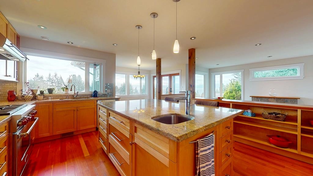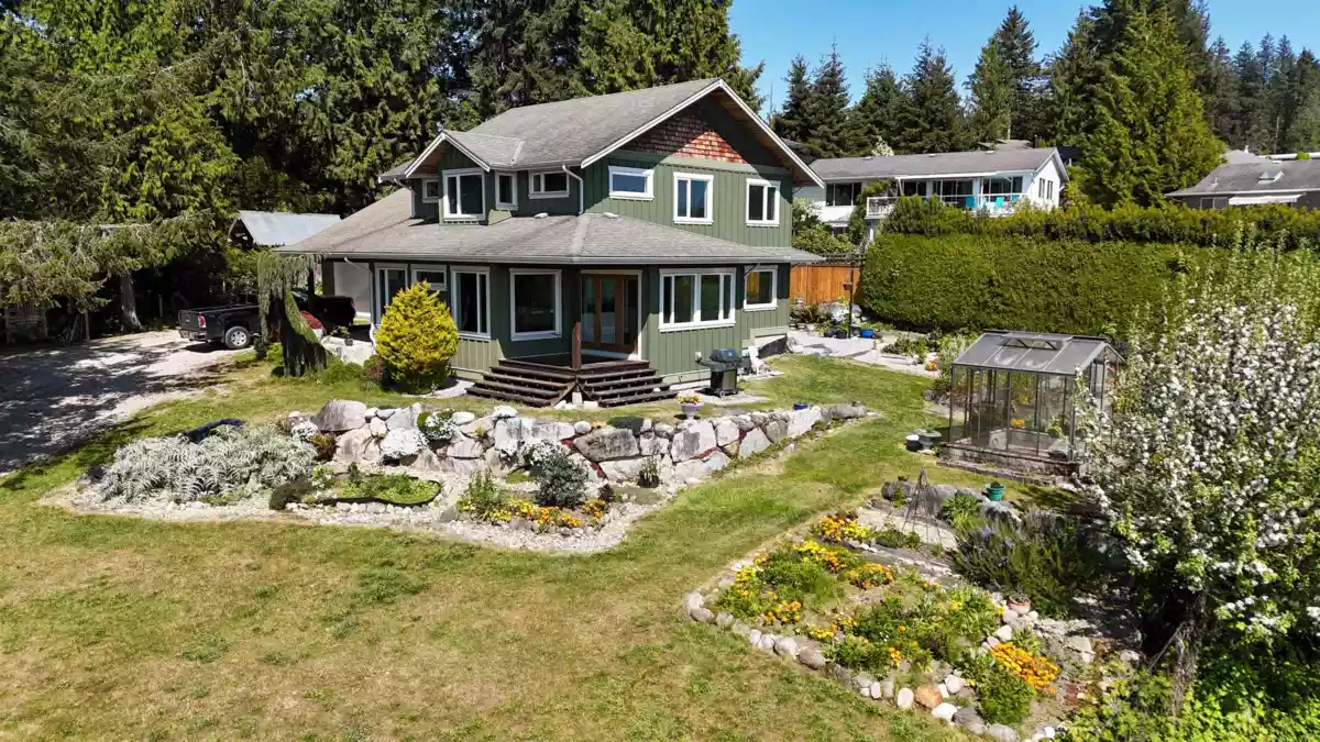 Watch the cruise ships & sunsets from this exclusive view acreage in Davis Bay. Sweeping southwesterly aspect over Strait of Georgia from both floors in a well built custom home. Beautiful edge-grain fir and stone flooring throughout leading into a lovely gourmet kitchen outfit with a dual Wolf range & vent, granite counters and large island. Entertain in the open concept with living and dining areas positioned to enjoy views. The large gently sloping property has a greenhouse and irrigation allowing for a gardener's imagination yet still enjoys privacy in this fenced property. 4 bedroom main home with a 2 bedroom old timer cottage with recent work on the exterior allows for extended family or revenue helper. Subdivision potential makes for a great investment and value.