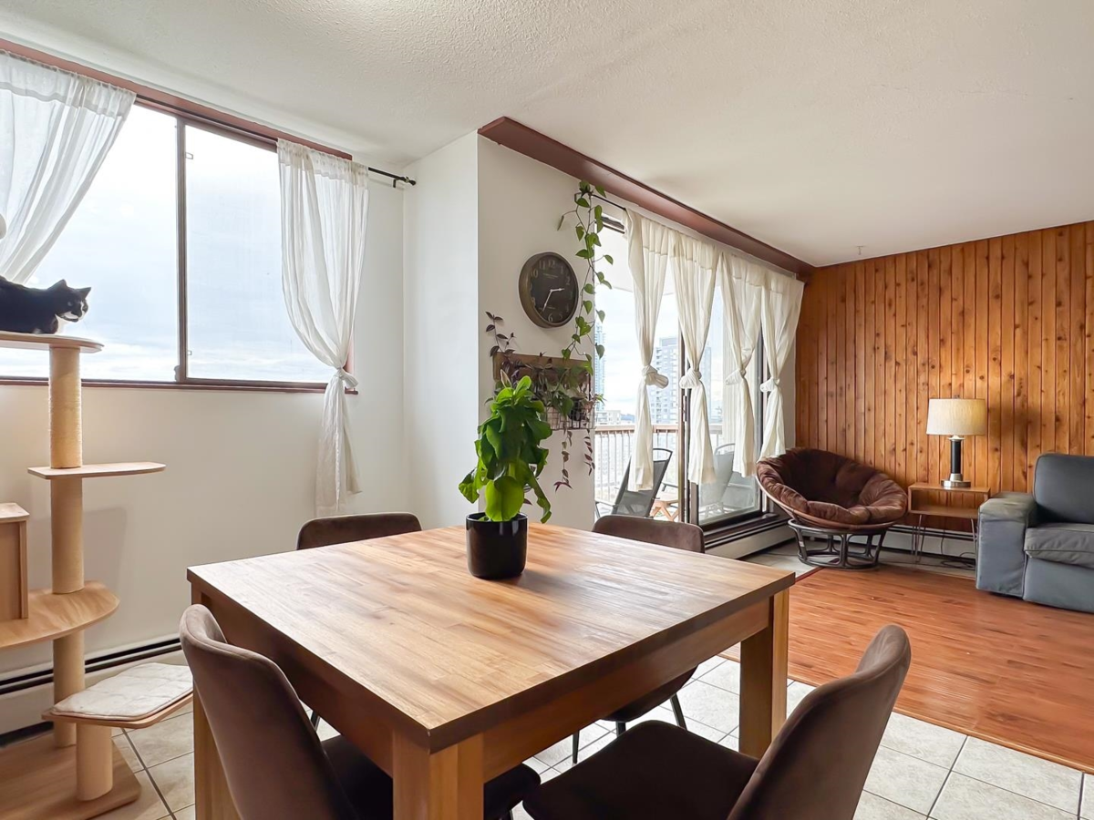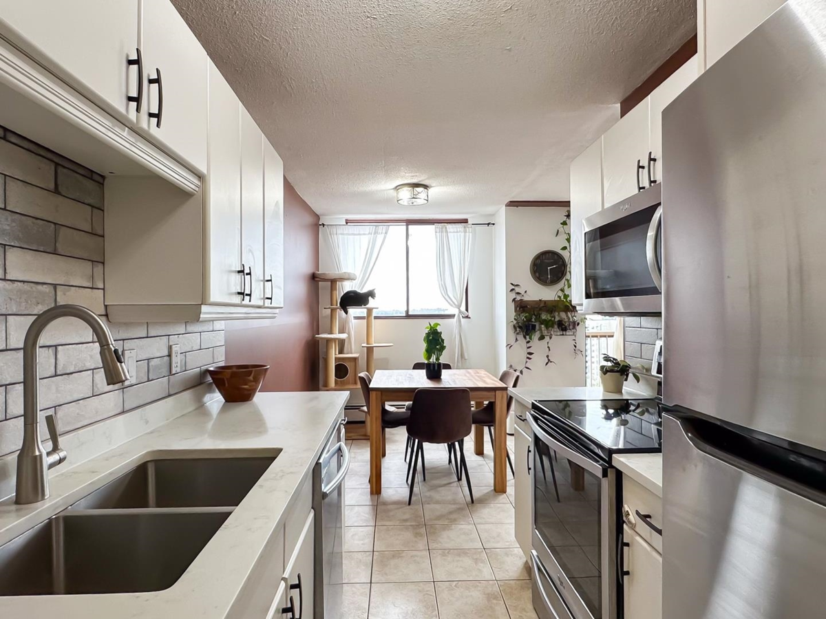 Cozy, bright south-facing 2 bed/1 bath corner unit in a well-maintained concrete high-rise with stunning river and city views. Updated kitchen and bath plus stainless steel appliances. Includes large locker, underground parking, and heat included. Building is cared for by a proactive strata. Building upgrades include security, elevator, electrical vault, refinished tennis court and court yard, boilers, new deck membrane, new exterior paint. Pets allowed. Just a 5-minute walk to SkyTrain, Queen’s Park, riverside trails, schools, and shopping—an ideal location for convenience and lifestyle. $2500 new furniture credit until November 30, 2025. https://youtu.be/9La7qjFwgPs?si=CMeCuL05gffe_BIN Open House Sunday, November 30 from 2-4pm