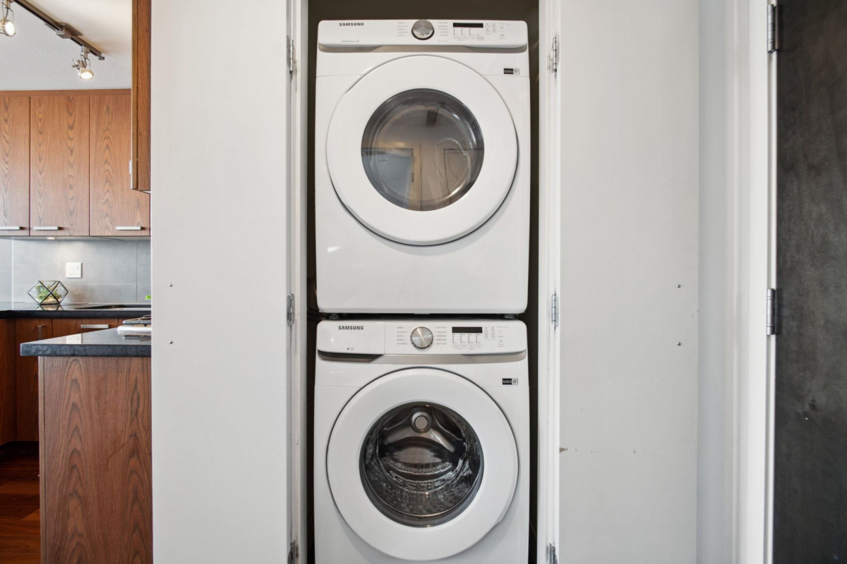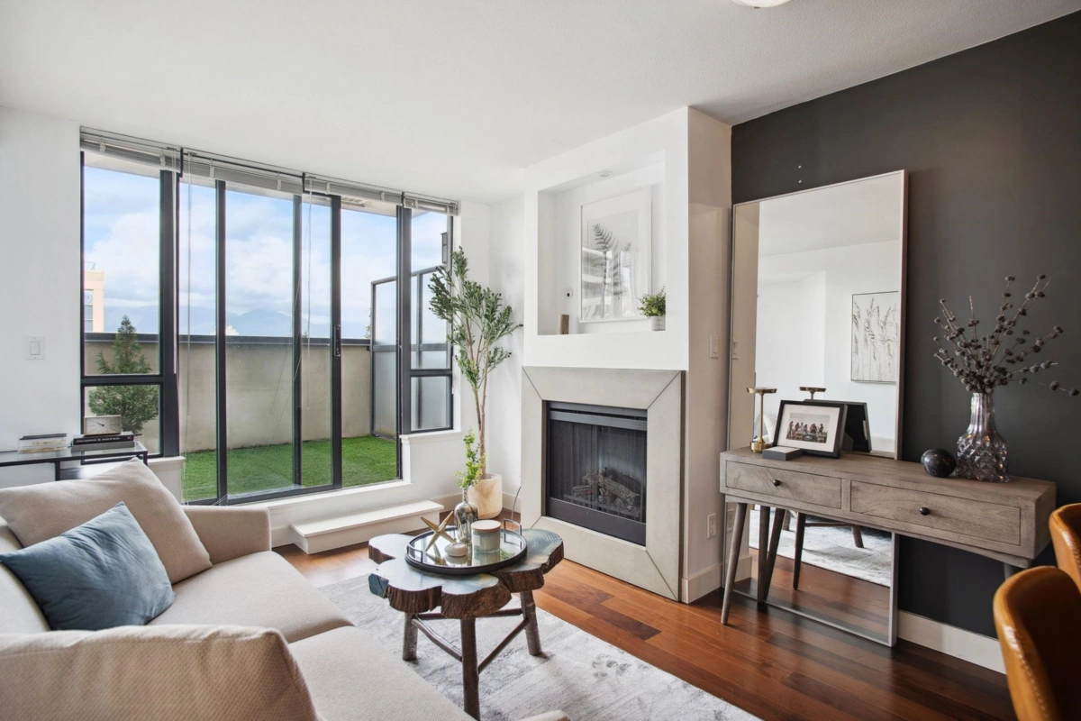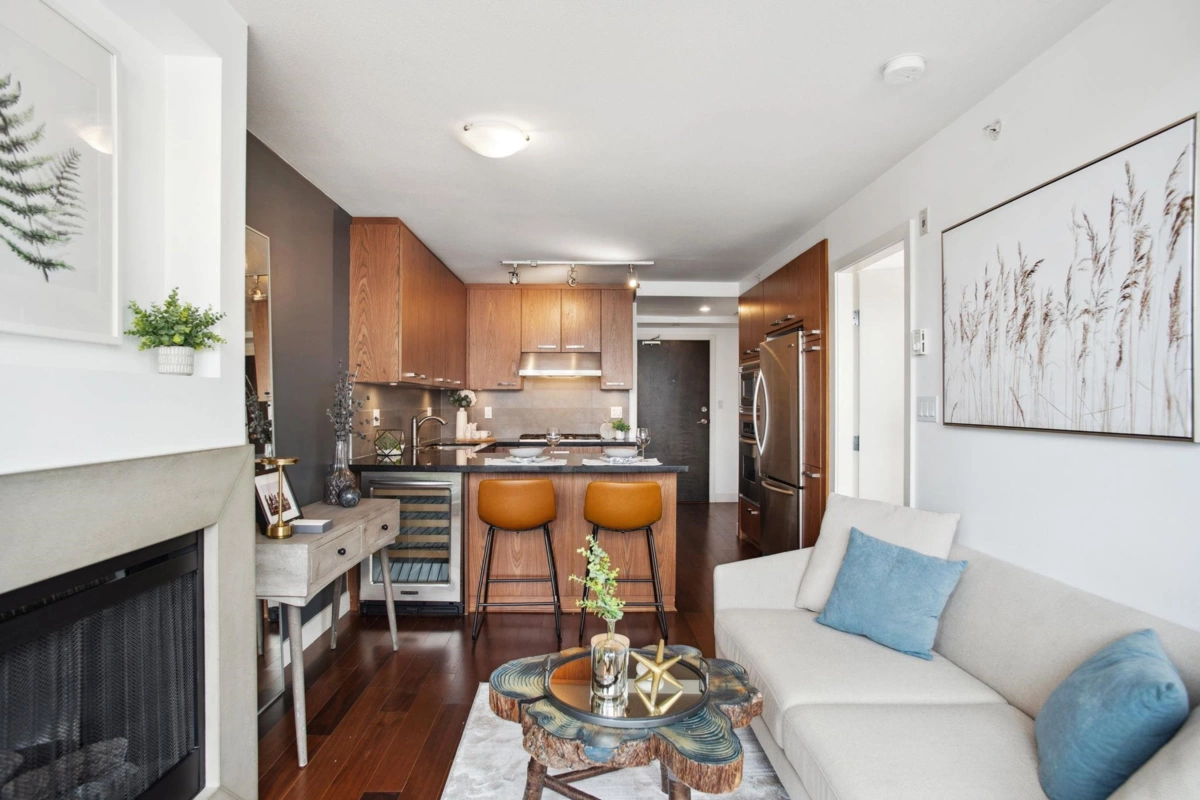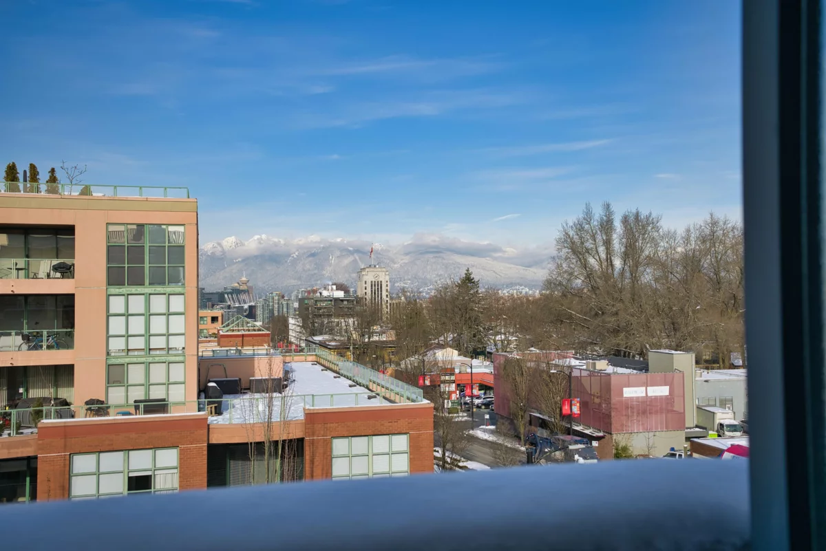 Welcome to Olive by Cressey, where Cambie Village meets Mount Pleasant. This bright, efficient open-concept home offers stunning Northern mountain & city views. The sought-after Cressey kitchen boasts solid wood cabinets, deep granite counters, stainless steel appliances, gas cooktop, wine fridge & full-sized fridge. Enjoy the cozy living room with electric fireplace, plus a spacious balcony spanning 19ft wide - accessible from both the living room & bedroom. CONCRETE construction, large windows, in-suite washer/dryer, 1 secured parking stall & storage locker are included. Prime location—steps from restaurants, cafés, shops, Heather & Douglas Parks, VGH, Broadway Skytrain. This is the urban lifestyle you've been waiting for!