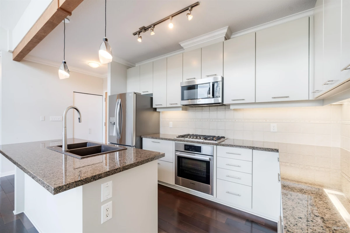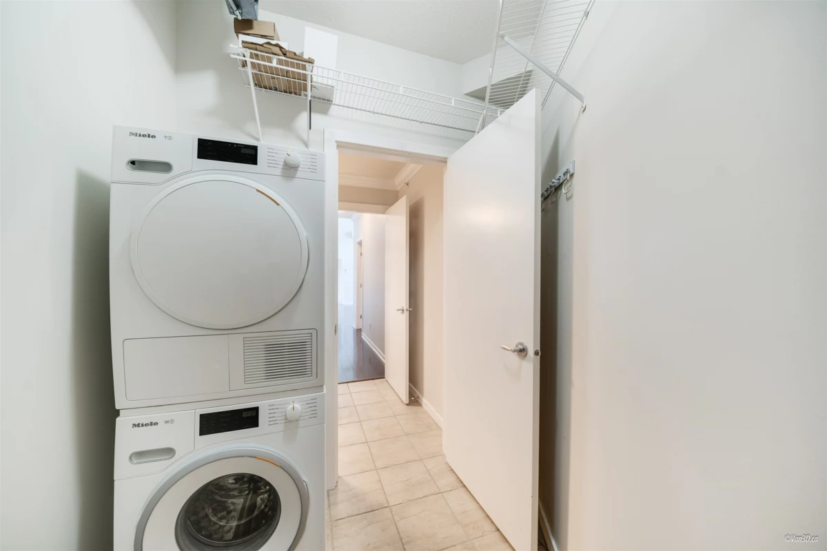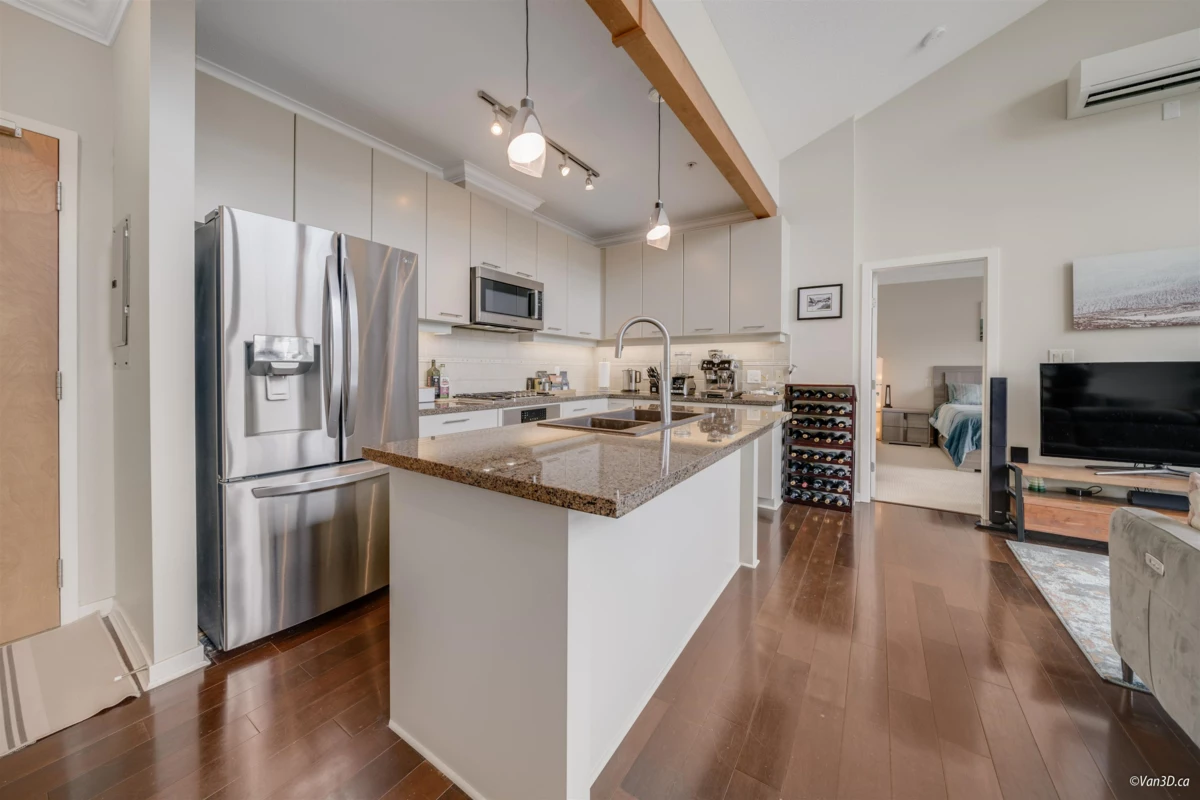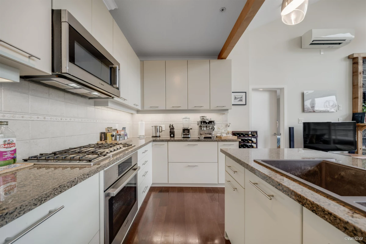 STUNNING 2 BEDROOM & DEN PENTHOUSE! 2 STOREY WINDOWS & 16 FT VAULTED CEILINGS! MASSIVE 350 SQ FT BALCONY. This wide open floorplan has so many features to enjoy! 2020 renovations includes, new Bosch Appliances, deep double kitchen sinks, new counter tops, updated plumbing & lighting, 2022 new AC/Heat Pump, 2025 EV Charger. So many features in this home including hardwood floors, 2 sided gas fireplace, stone & wood mantle, ceiling crown moulding, spa like bathrooms, walk in laundry room with Top Quality Miele washer/dryer system. This home has the "Wow" factor the minute you pass thru the entry door. Outside balcony is spacious with plenty of room for BBQ & full sized patio sets. Raven Woods is located minutes to Deep Cove, Cates Park beaches, biking & hiking trails galore at your door!