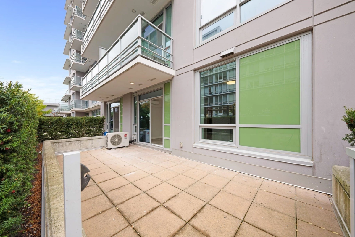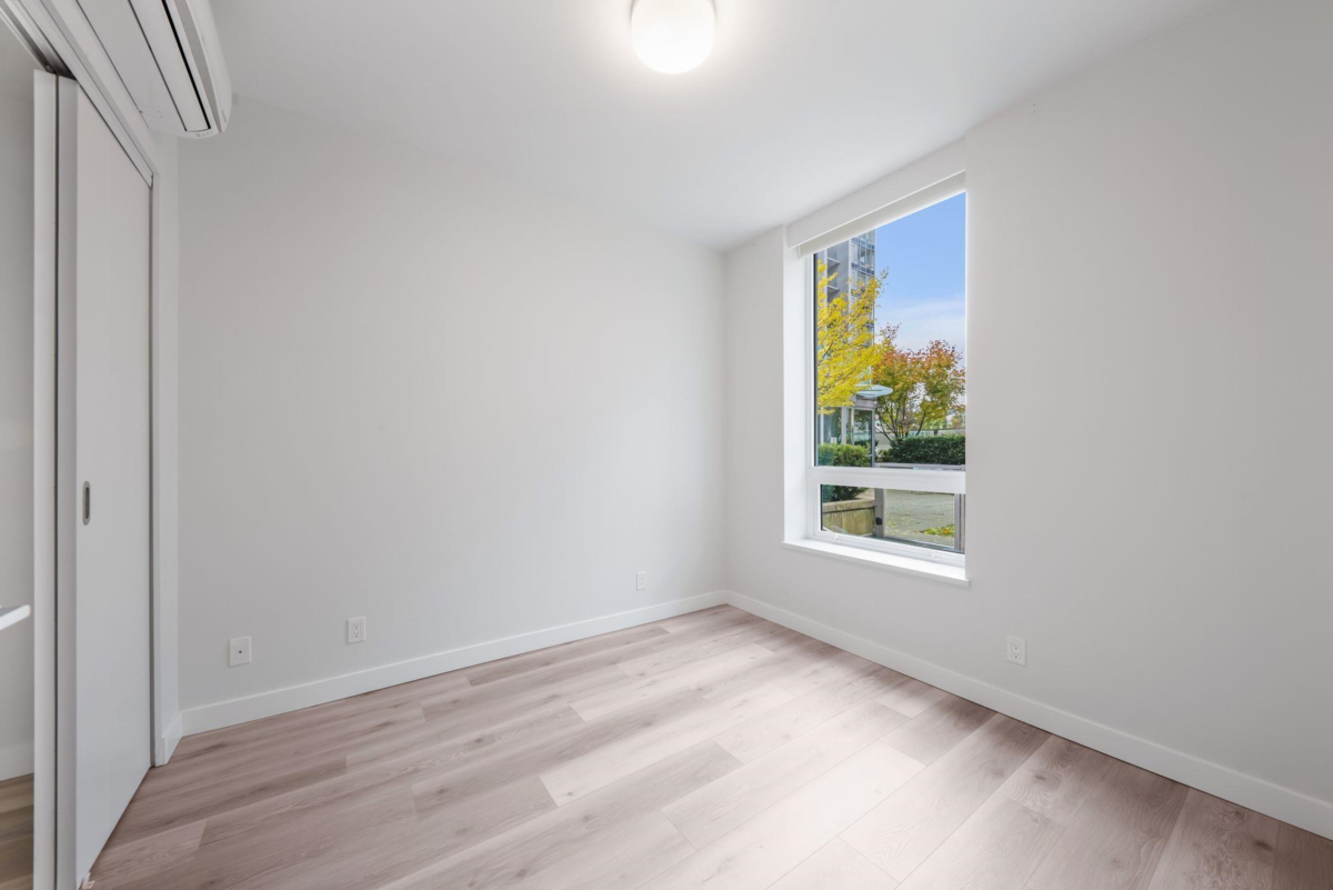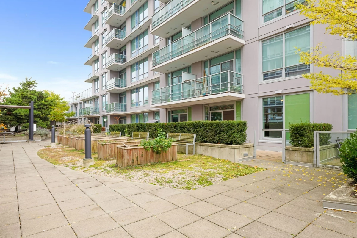 THE GRAND at Lansdowne - a centrally located, LARGE 1 bedroom unit with 1 big Den/office ,( can be the 2nd Bedroom). Soaring 9ft ceilings and oversized windows illuminate a sprawling private patio of over 200 sqft,opening directly onto the Garden. Well-designed kitchen equipped with gas stove, built-in fridge, and quartz counters and air conditioning systems available in each room for comfort. New floor renovated recently. One parking included. The amenities offer state of the art workout gear and machines in the gym, community garden and a recreation room. Close to everything: Skytrain station, T&T supermarket, banks, restaurants, services and stores.