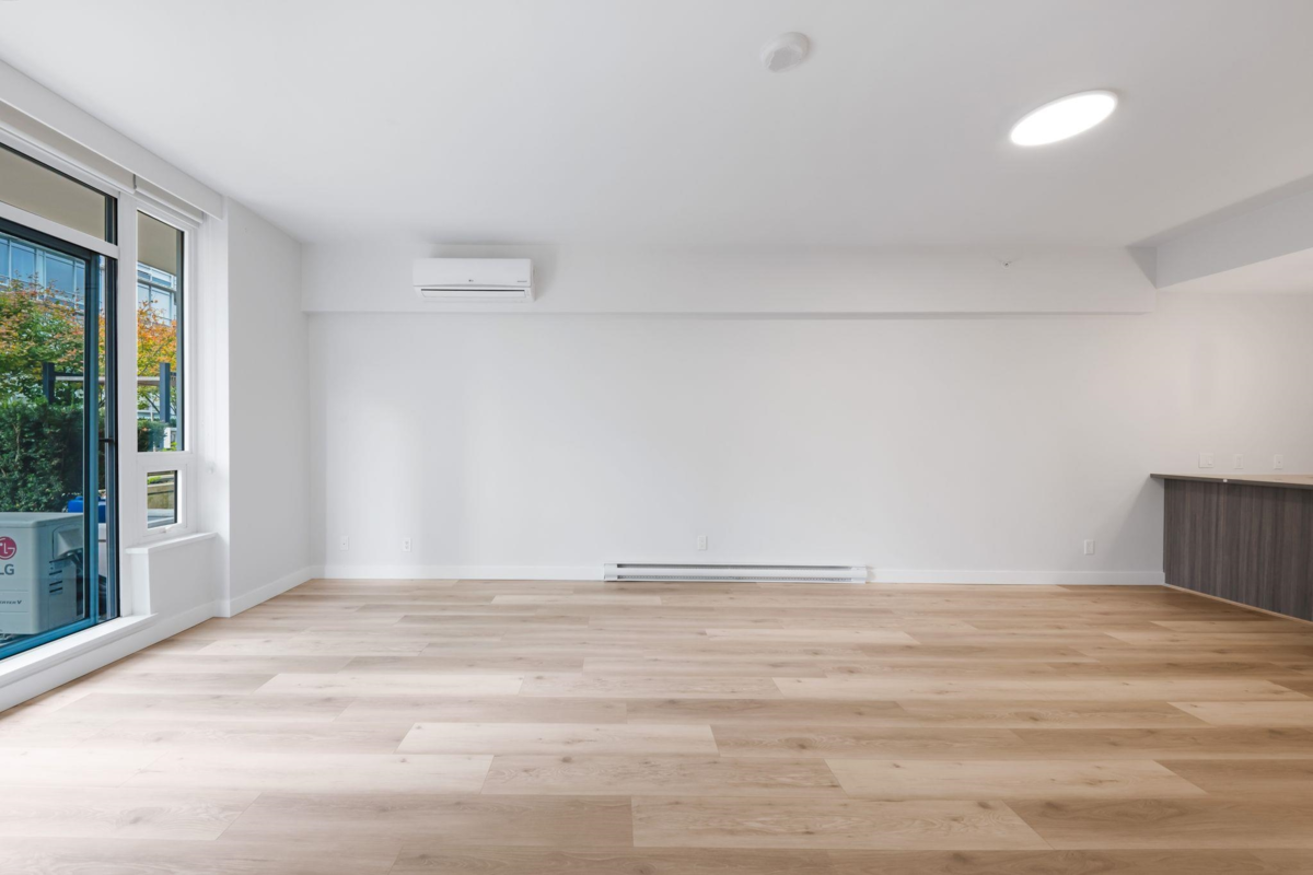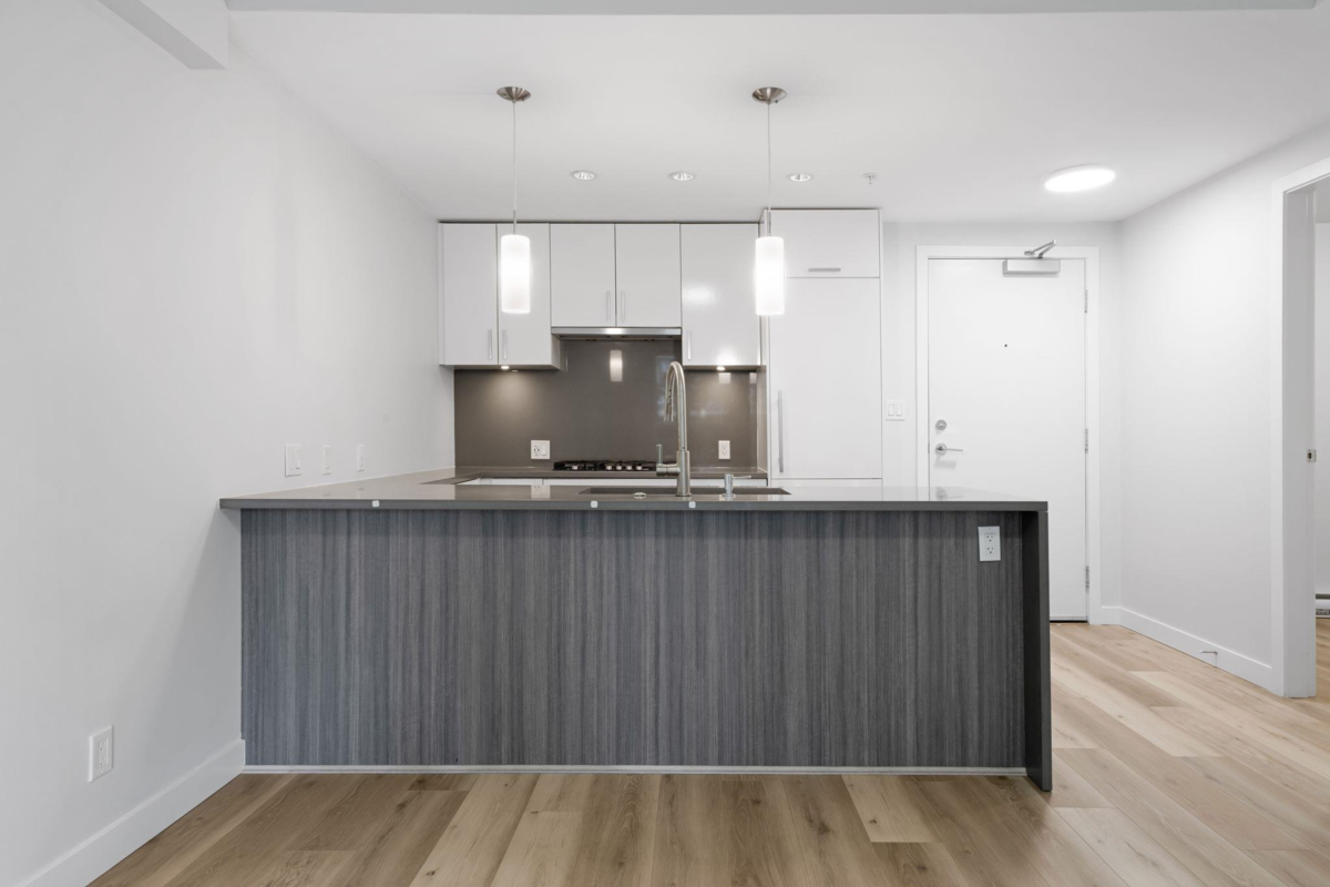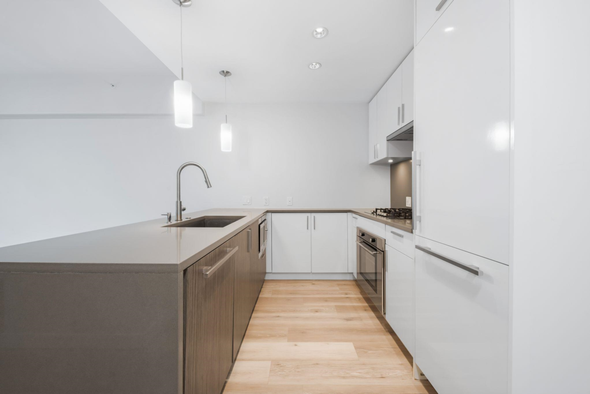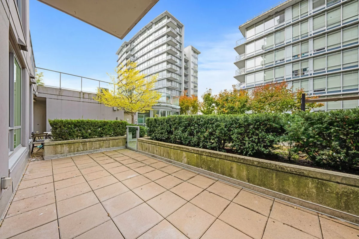 THE GRAND at Lansdowne - a centrally located, LARGE 1 bedroom unit with 1 big Den/office ,( can be the 2nd Bedroom). Soaring 9ft ceilings and oversized windows illuminate a sprawling private patio of over 200 sqft,opening directly onto the Garden. Well-designed kitchen equipped with gas stove, built-in fridge, and quartz counters and air conditioning systems available in each room for comfort. New floor renovated recently. One parking included. The amenities offer state of the art workout gear and machines in the gym, community garden and a recreation room. Close to everything: Skytrain station, T&T supermarket, banks, restaurants, services and stores.