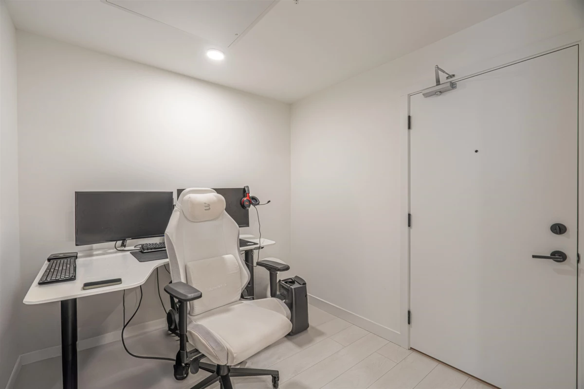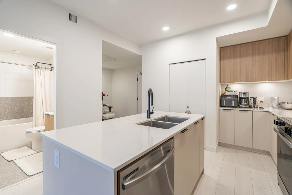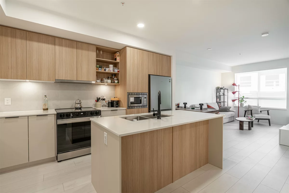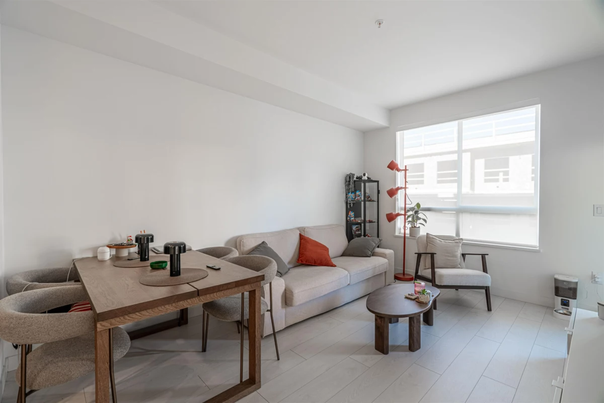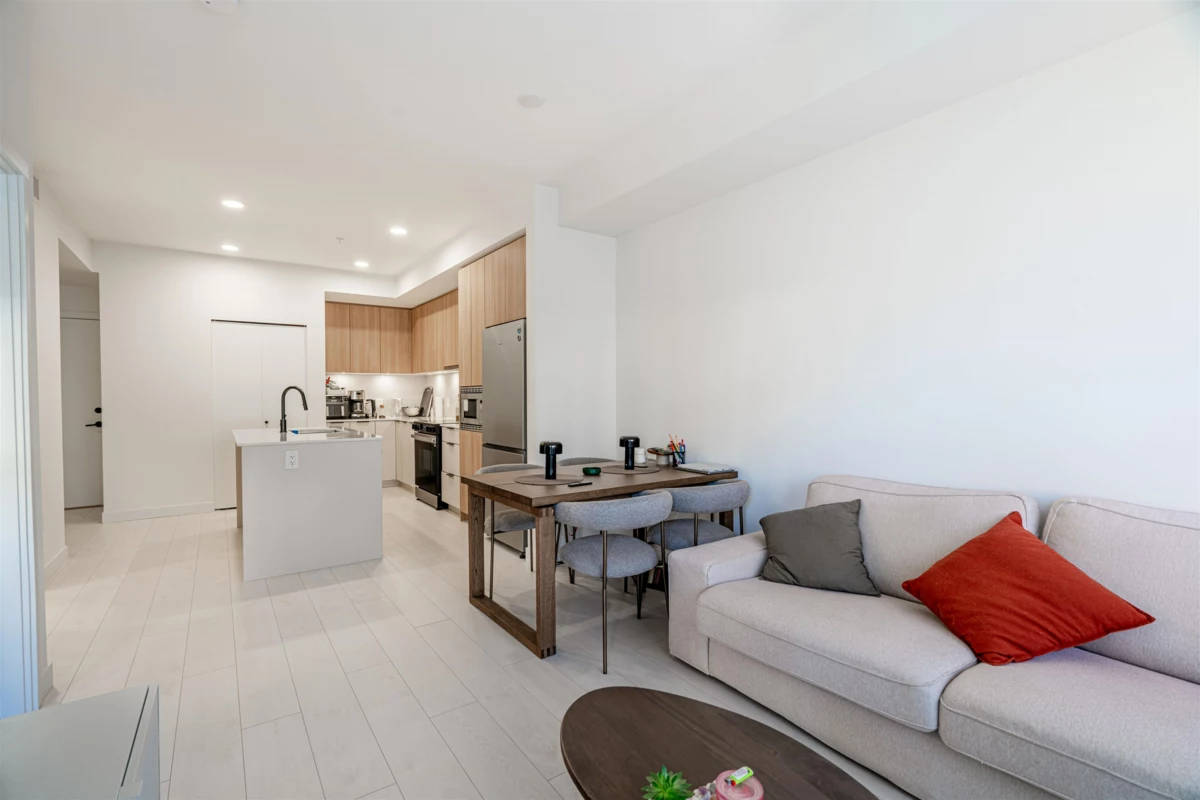 Discover this modern, newly built 1-bed + den condo with 8'10" ceilings and an open layout. The spacious kitchen features quartz countertops, stainless steel appliances, ample storage, and a large island—ideal for cooking and entertaining. Bright and inviting with large windows, this home offers a cozy yet stylish atmosphere. Located across from Queen Elizabeth Meadows Park, it provides tranquility while being close to elementary and secondary schools, hospital, shopping, the skytrain station and dining. Enjoy outdoor living with a serene garden area and a spacious patio, plus access to a well-equipped fitness room. Perfect for small families or investors, this move-in ready condo offers comfortable living in a great location. Don’t miss out on this beautiful home!