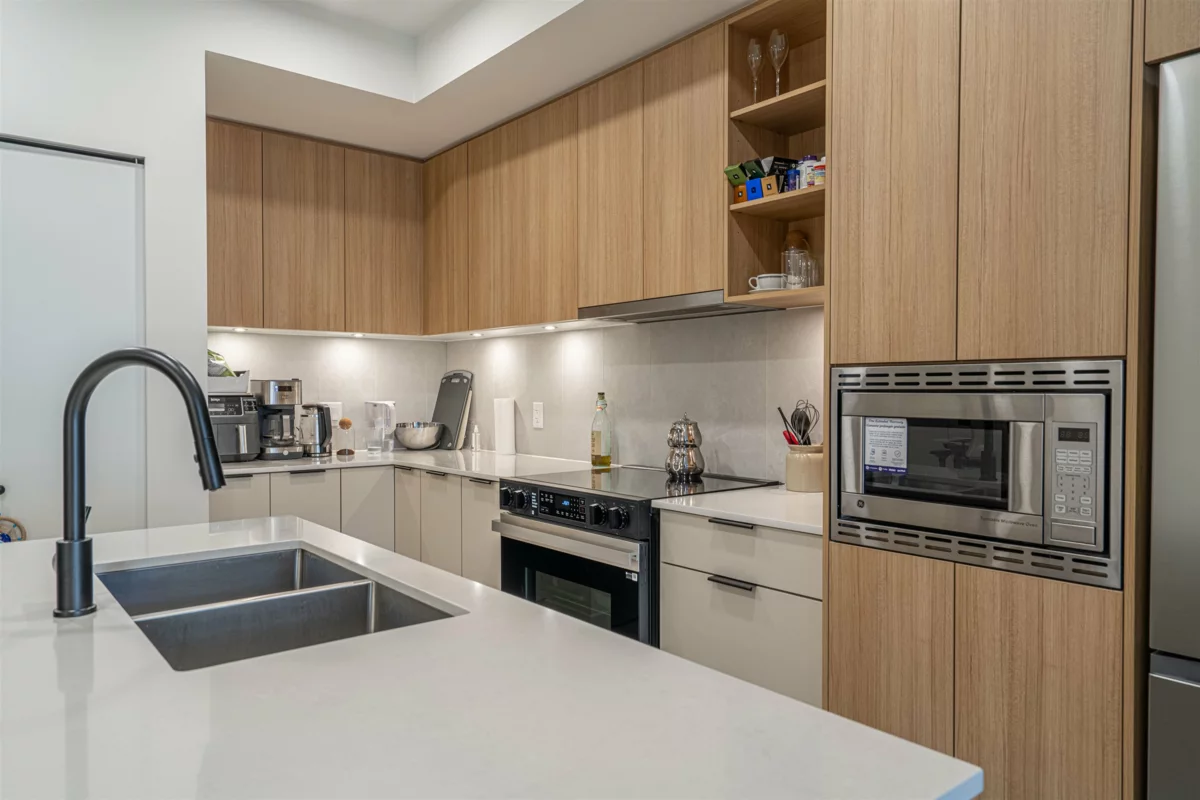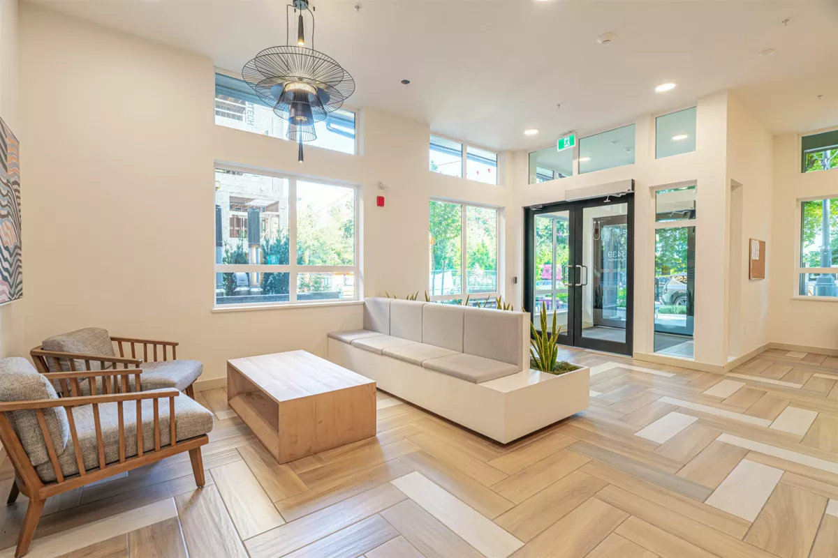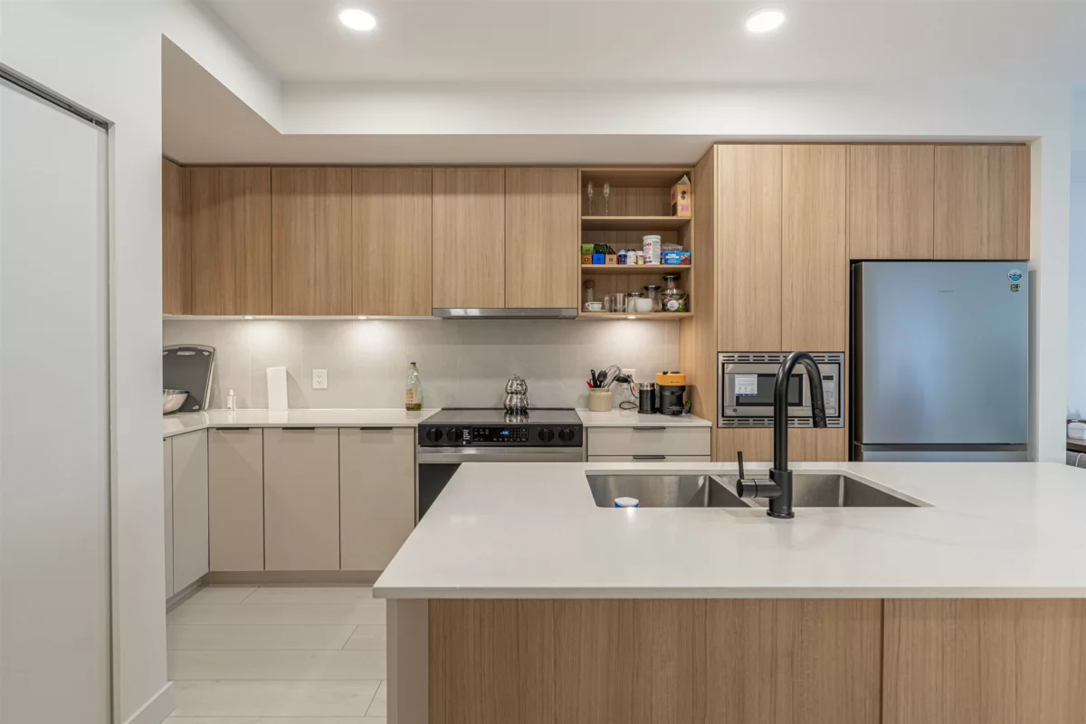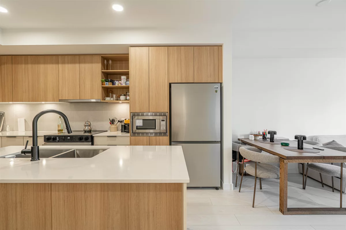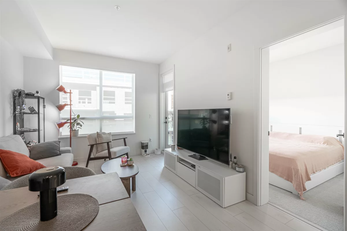 Discover this modern, newly built 1-bed + den condo with 8'10" ceilings and an open layout. The spacious kitchen features quartz countertops, stainless steel appliances, ample storage, and a large island—ideal for cooking and entertaining. Bright and inviting with large windows, this home offers a cozy yet stylish atmosphere. Located across from Queen Elizabeth Meadows Park, it provides tranquility while being close to elementary and secondary schools, hospital, shopping, the skytrain station and dining. Enjoy outdoor living with a serene garden area and a spacious patio, plus access to a well-equipped fitness room. Perfect for small families or investors, this move-in ready condo offers comfortable living in a great location. Don’t miss out on this beautiful home!