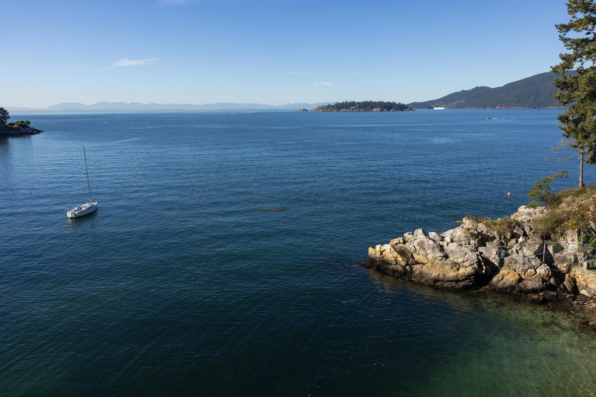 Spectacular waterfront architectural estate by Christopher Bozyk overlooking Balmy Beach. Situated on a private 16,500 sqft property at the end of a quiet cul-de-sac, this 5,700+ sqft, 5 bedroom home offers breathtaking southwest ocean views including Passage Island, Bowen Island out to Vancouver Island. Designed to maximize natural light with soaring ceilings, walls of glass, and expansive decks for seamless indoor-outdoor living. Features include a gourmet kitchen with high-end appliances, grand principal rooms, and 3 en-suited bedrooms upstairs, including a stunning step up primary suite with private deck. Lower level with 2 additional bedrooms, bar, and rec room opens to oceanside terraces. Complete privacy, lush landscaping, 3-car garage, and access to exclusive Parthenon Park.