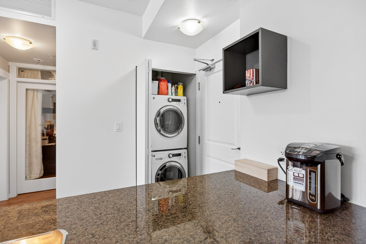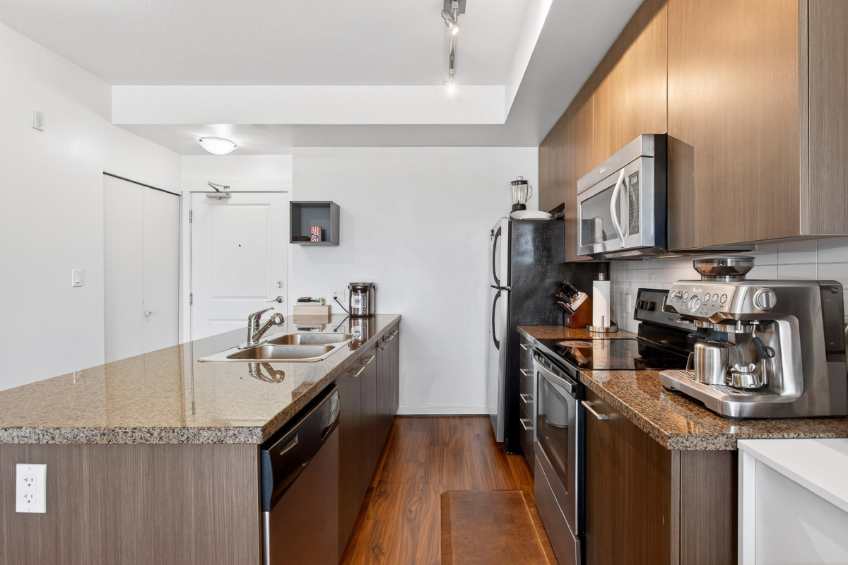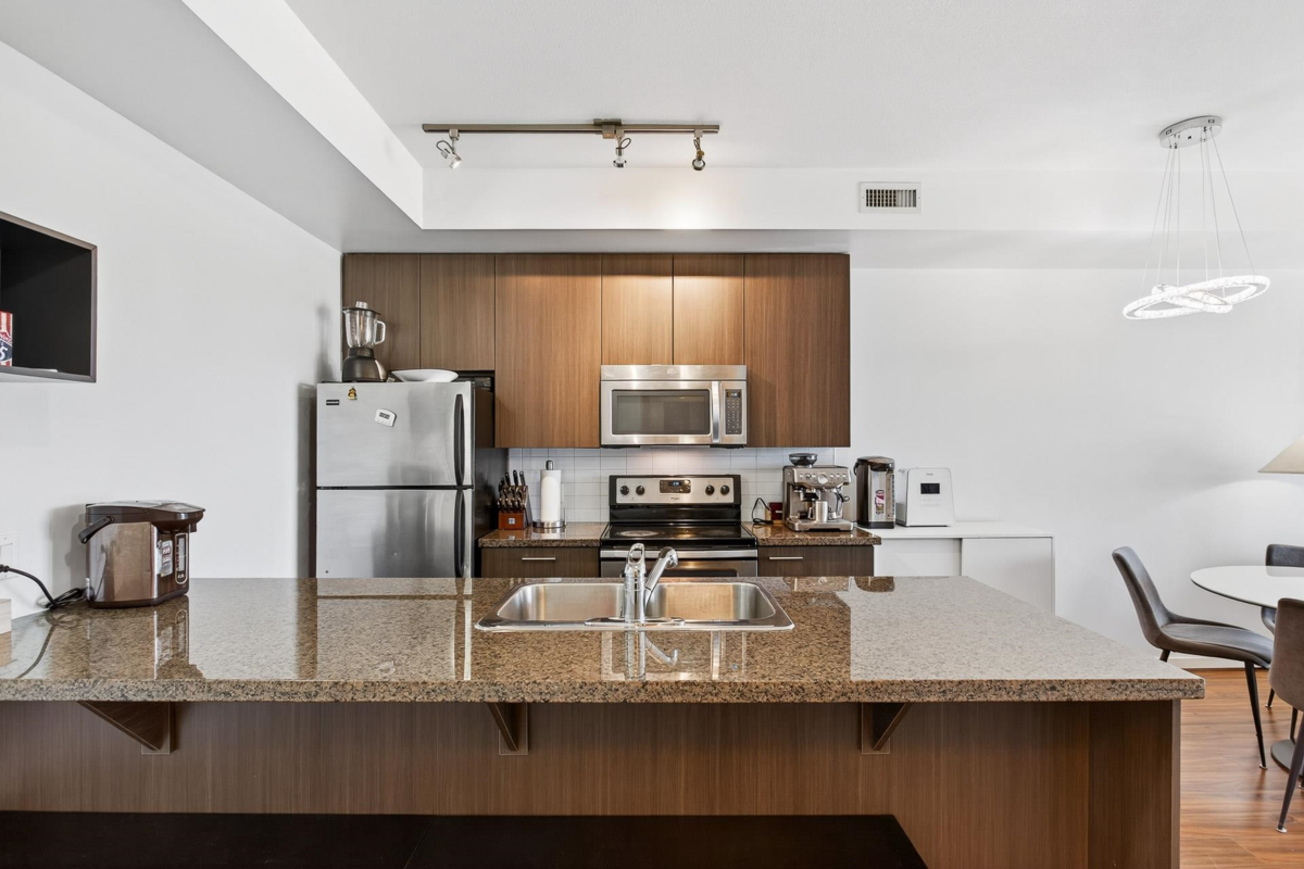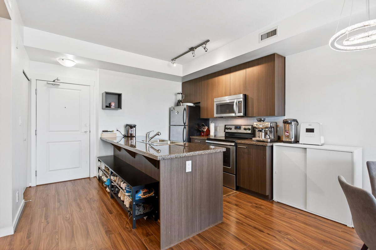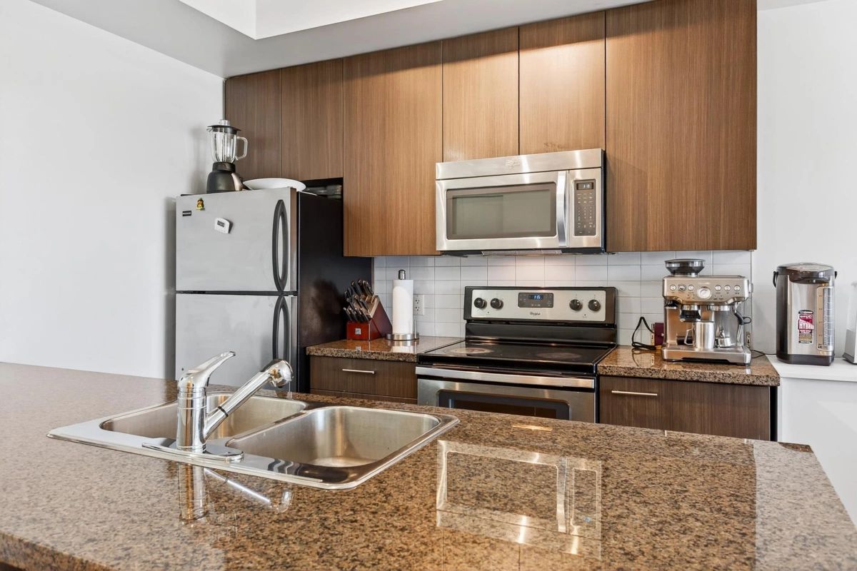 LOCATION! LOCATION! Attention Home Buyers and Investors – Look No Further! Welcome to this cozy and spacious 2 bed, 1 bath condo with an efficient layout at Remy, featuring an open layout, 9-foot ceilings, laminate floors, in-suite laundry, and a gourmet kitchen with granite countertops. Enjoy central A/C, a fitness center, daycare, and lush gardens. Centrally located near Walmart, Aberdeen Centre Canada line Station, Kwantlen University,, all shops, restaurants, and schools. This unit come with one parking stall. Rentals and pet allowed – unbeatable value!