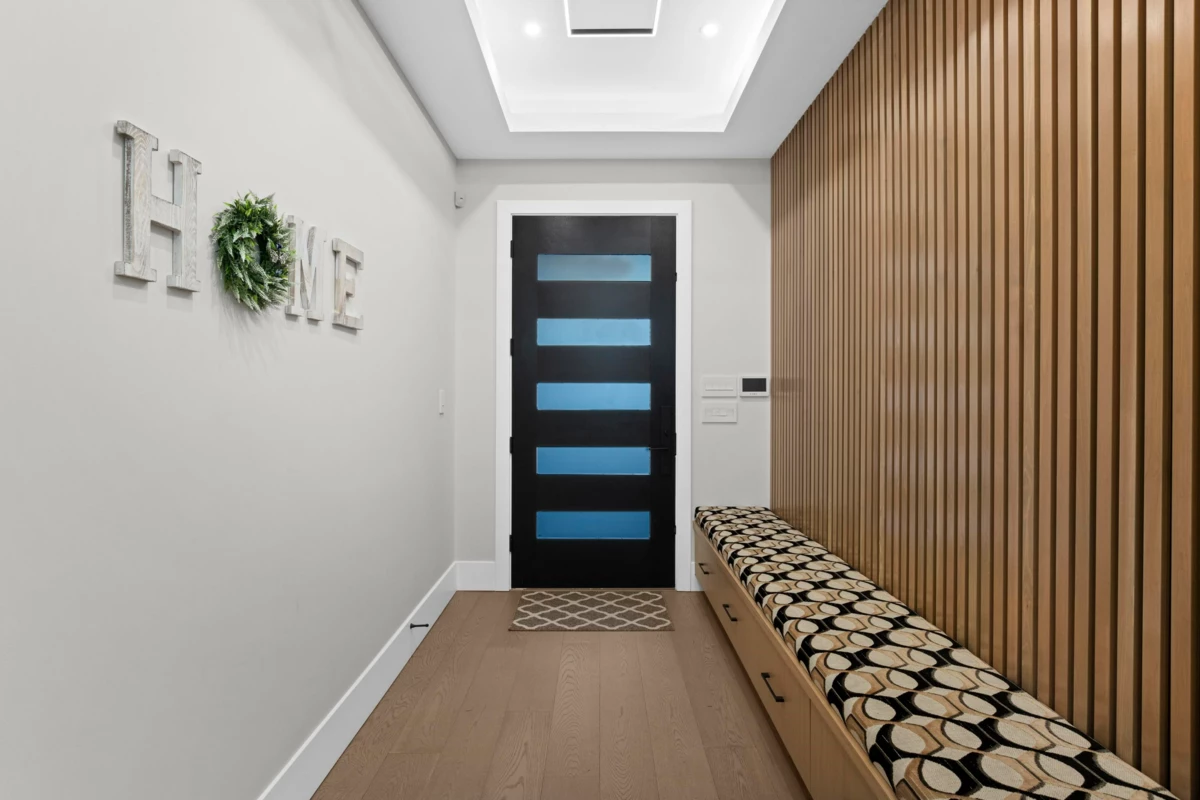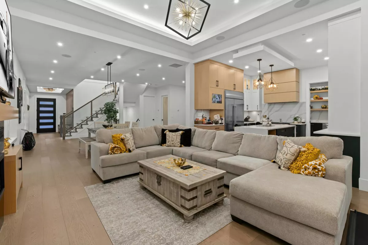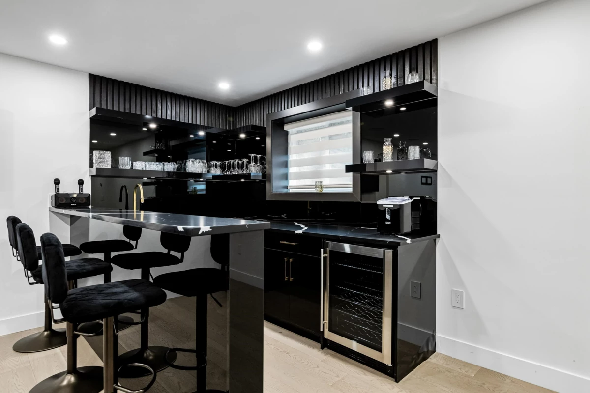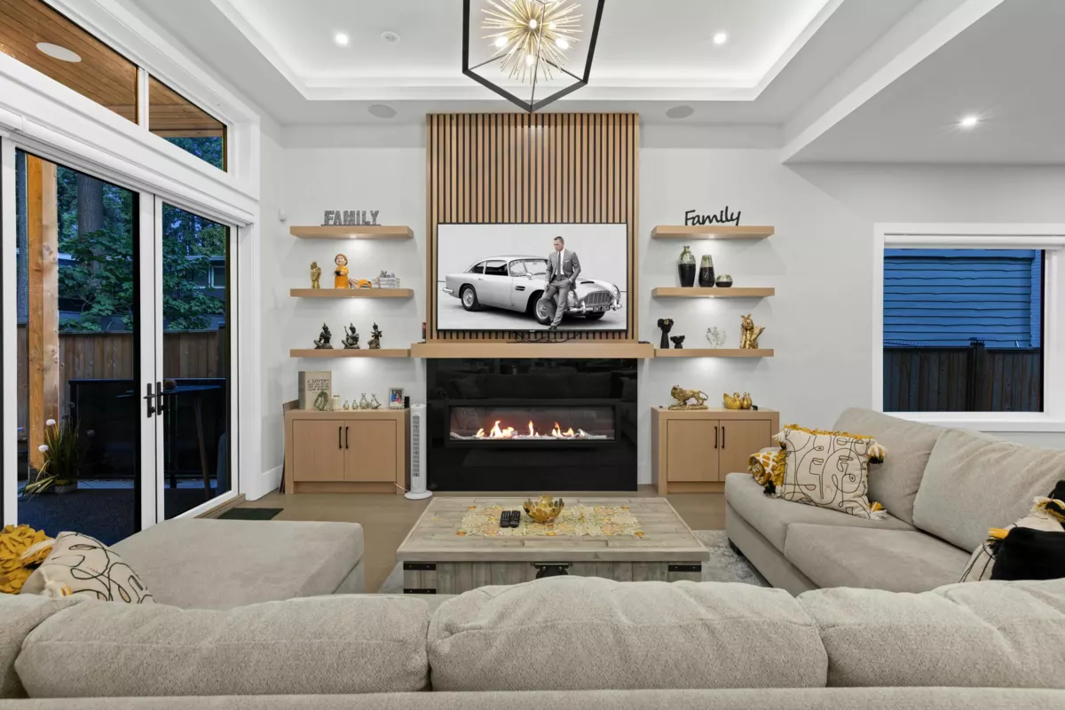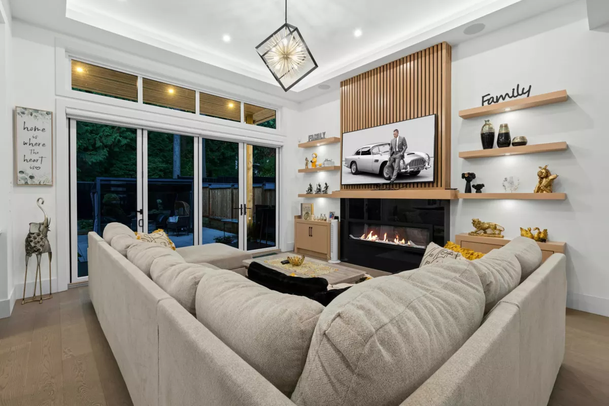This expansive luxury residence offers over 4,600 sqft of elegant living space, ideally located on a peaceful street with the serenity of a lush forest as your backyard. Start each day surrounded by nature's beauty, while enjoying the convenience of nearby amenities just minutes away. The main level is thoughtfully designed with functionality and comfort in mind, featuring a spacious master bedroom with en-suite, a dedicated home office, and a fully-equipped work kitchen. Upstairs, the primary suite is a private retreat complete with a built-in vanity, a generous walk-in closet, and a spa-like en-suite bathroom that invites relaxation. The lower level is perfect for entertaining or unwinding, boasting a large recreation room with a wet bar and a dedicated theatre room.
