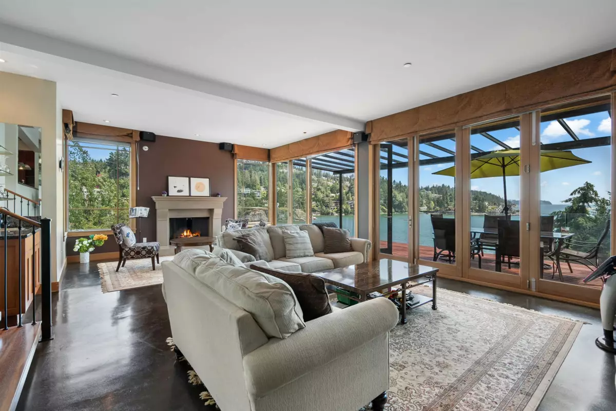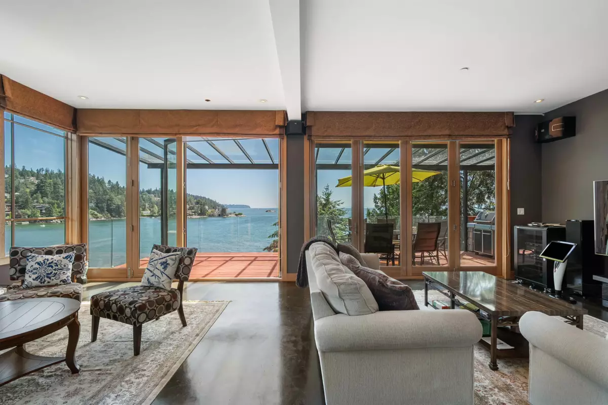 Experience unparalleled ocean views from your own private waterfront home on West Vancouver's Eagle Island, offering complete security and privacy. This exquisite seaside family residence, with a layout designed to maximize the stunning vistas, was extensively rebuilt in 2008, giving it a like-new feel. The home offers almost 4500 sqft of luxurious living space. It includes 5 bedrooms, with the master suite providing an expansive 180-degree ocean view. The gourmet kitchen, flooded with natural light from its southeast exposure, features top-of-the-line appliances. Entertain guests in the elegant dining room or enjoy the spectacular outdoor living areas. The outdoor patio is ideal for hosting gatherings or simply relaxing while soaking in the 360-degree views.