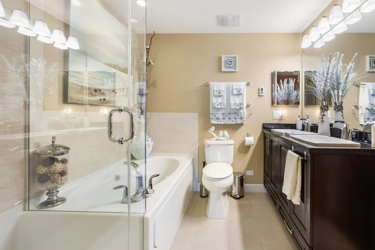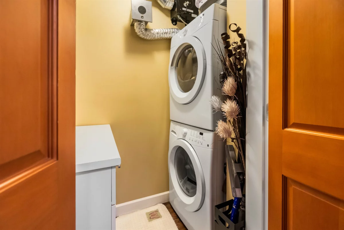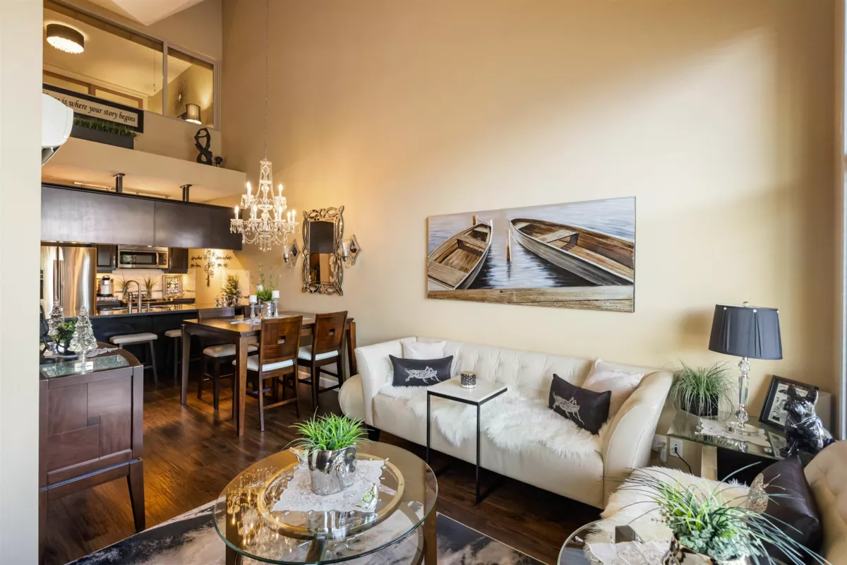 WALNUT RIDGE AT YORKSON CREEK - RARE PENTHOUSE LOFT UNIT WITH VAULTED CEILINGS AND TWO PRIMARY BEDROOMS. This immaculate unit stands out with Quadra quality interiors, featuring acoustic wood-grained plank laminate, electric fireplace, solid-core fir doors & closets with built-in shelves. Kitchen w/ ample cupboard space, granite tops, under-mount sink and S/S appliances. Heated tile bathroom floors, granite vanity tops and fog-free mirrors. Enjoy your east facing balcony and A/C is included. 2 primary suites to chose from, one on the main floor or one upstairs for privacy. Separate den plus laundry with room, lots of storage! No neighbours above you with this top floor unit. Amazing location - walk to schools, parks & shopping. 2 parking stalls right next to each other. Don't miss it!