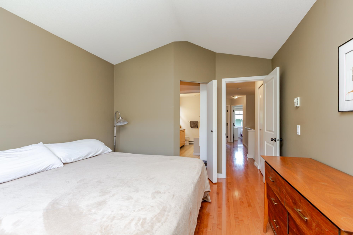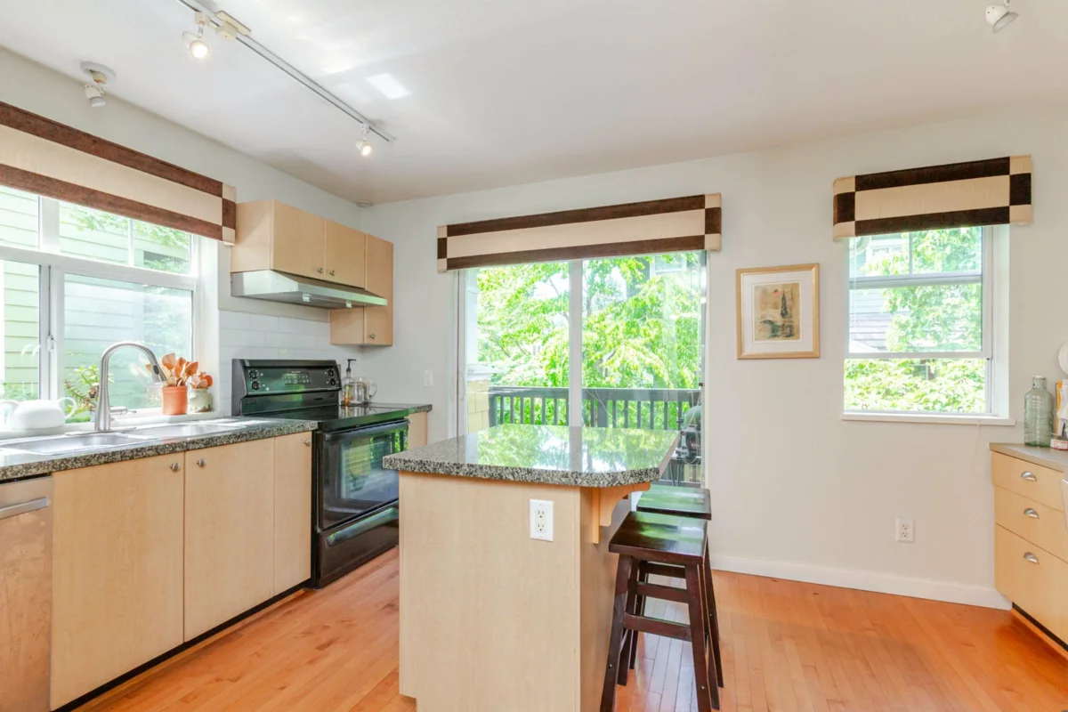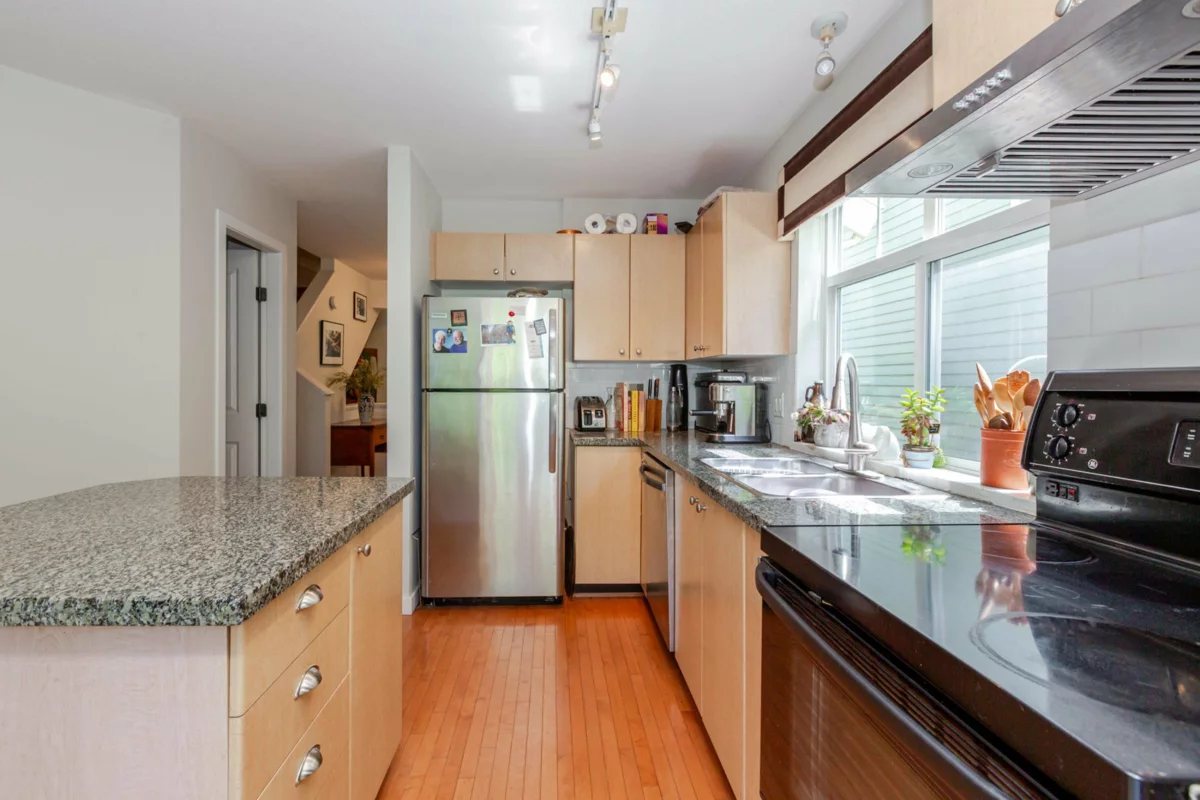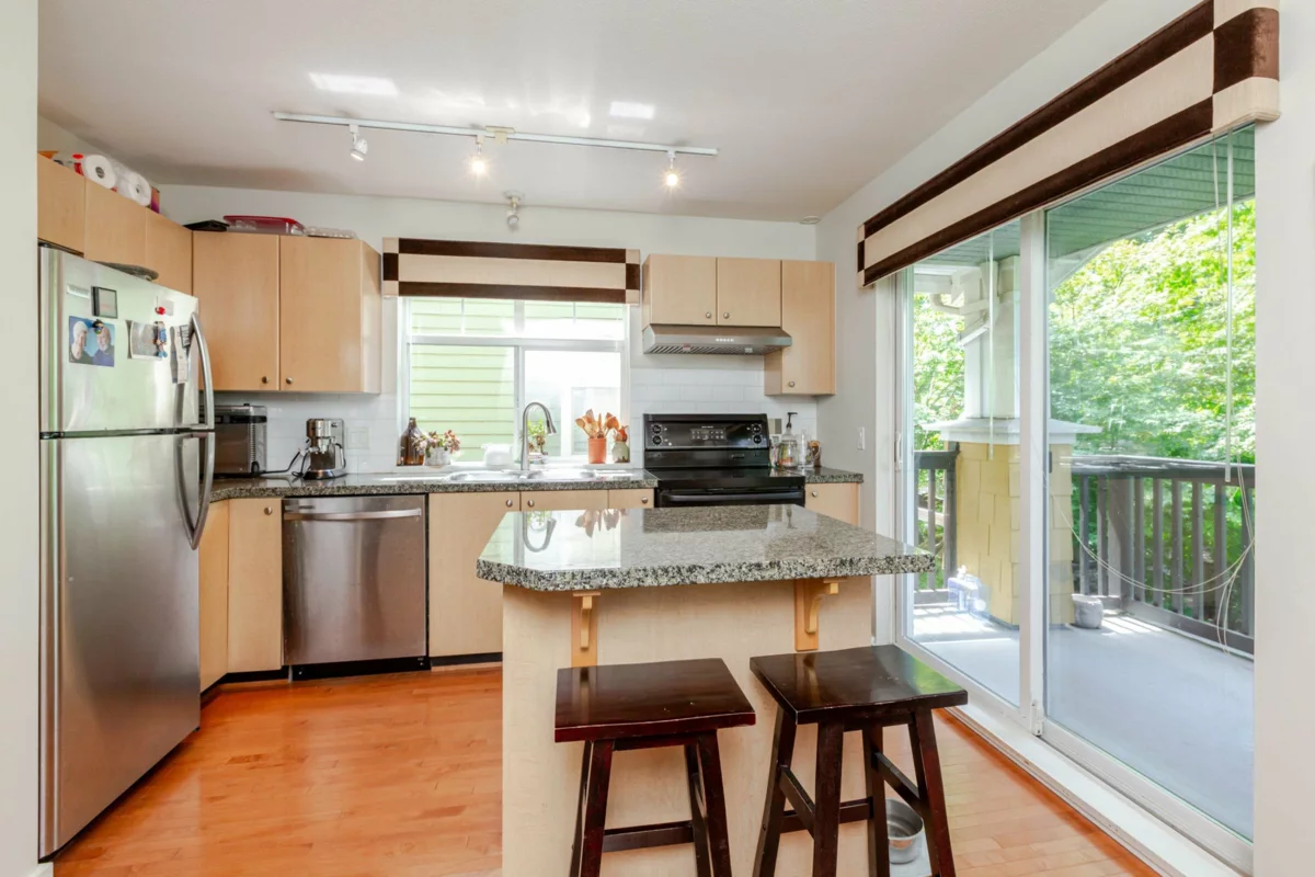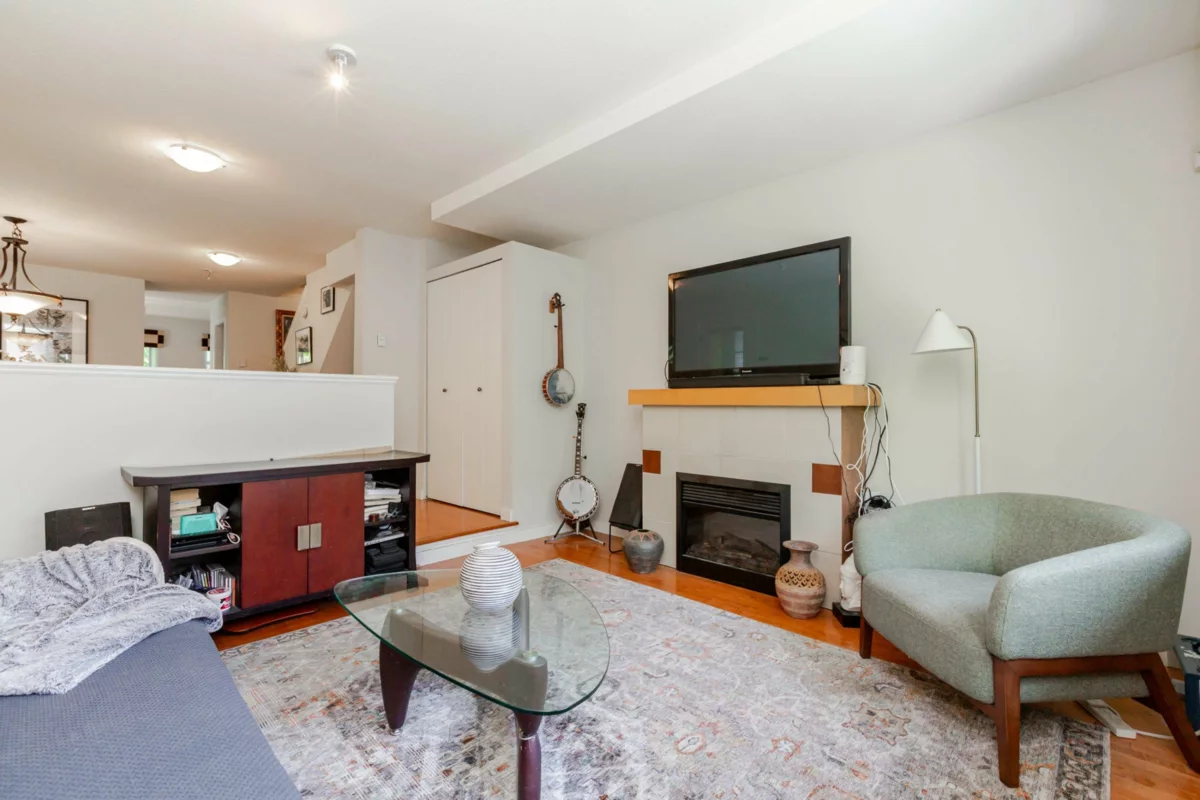Welcome to Sundance! This END UNIT townhome offers almost 1500sf of living space! A fantastic layout that features 3 good sized bedrooms upstairs & an additional rec room or fourth bed downstairs. Main floor has a large dining area, kitchen that includes an eating area or home office & sunken living room that features a cozy electric fireplace. This original showhome includes real maple hardwood floors on main & upper floors, granite kitchen counters, powder room on main floor, & both a balcony off the main & patio off the lower floor. Primary bedroom boasts vaulted ceilings & a walk-in closet with built in's. 1 covered + 1 open parking & 2 pets allowed (no size restrictions). All this showcased by an abundance of natural light throughout! Great location close to all amenities!
