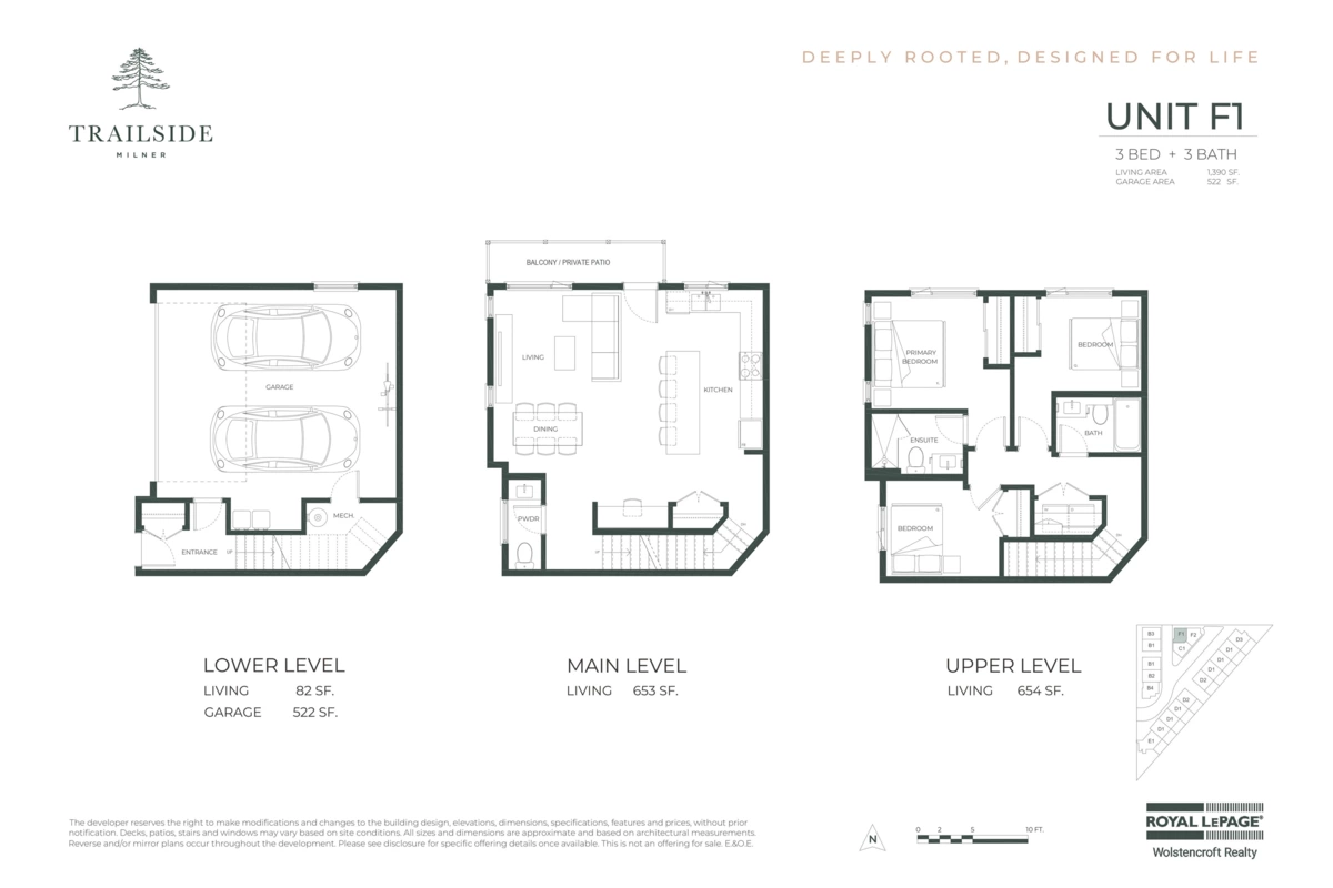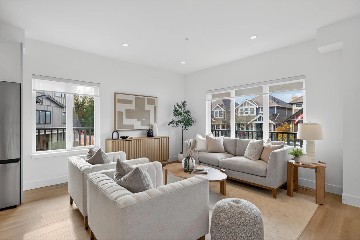 Welcome to Trailside, an exclusive new community of elegant, high-end townhomes in the heart of Langley. This bright end-unit townhome blends modern luxury with the calm of nature. Featuring 3 spacious bedrooms, 3 bathrooms, and a double side-by-side garage, it’s designed for both style and function. Large windows flood the home with natural light while offering views of the surrounding trails and protected greenspace, creating a sense of privacy and connection to the outdoors. Thoughtful interiors showcase durable finishes and open-concept living spaces perfect for families or downsizers. With its boutique community setting and convenient Langley location, this home delivers comfort, connection, and timeless design. Ready for occupancy December 2025.