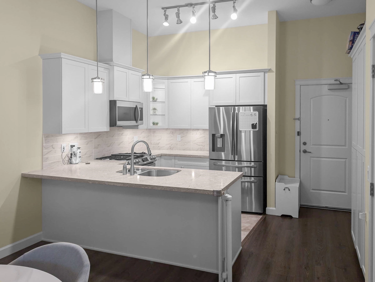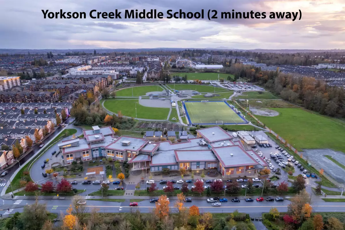 Welcome to Yorkson Park — a premium penthouse with 12 ft vaulted ceilings, luxury living in the heart of Willoughby Heights! This spacious 3 bed, 2 full bath home features beautifully designed interiors with laminate flooring & plush carpeting in the bedrooms. A versatile flex room adds extra value — perfect for home office, den or 4th bedroom. Enjoy garden views and natural light streaming in. A Cozy Fireplace sets the mood. The glass-enclosed solarium is equipped with sliding/retractable panels. This thoughtful design creates an indoor/outdoor flow, in summer & sheltered outdoor space yr round. For outdoor entertaining, a BBQ area is ready with a natural gas hookup. This home comes with 2 Parking (electrical outlet in stall) and 2 Storage (attached to pkg.) Showings by Appt.