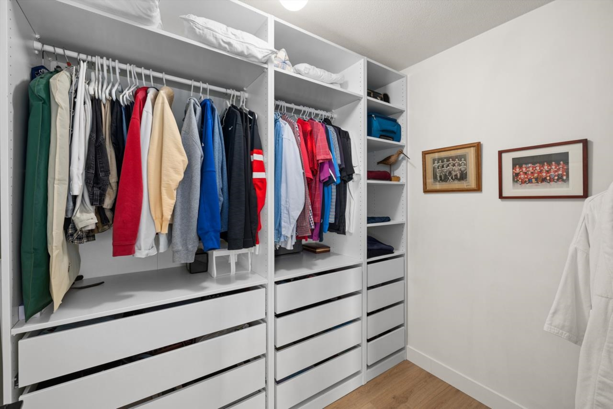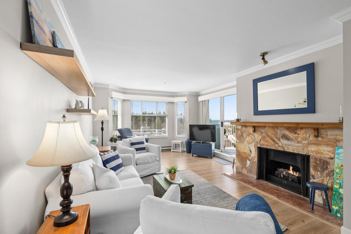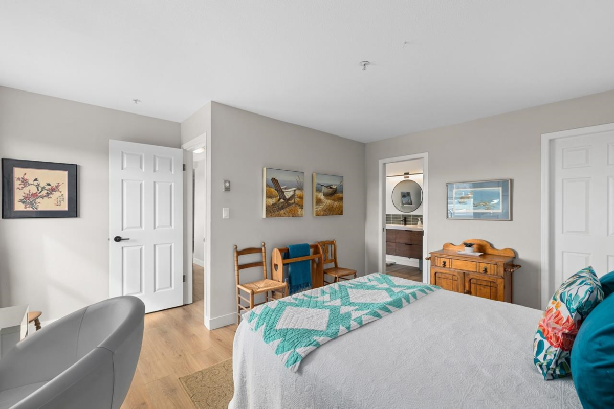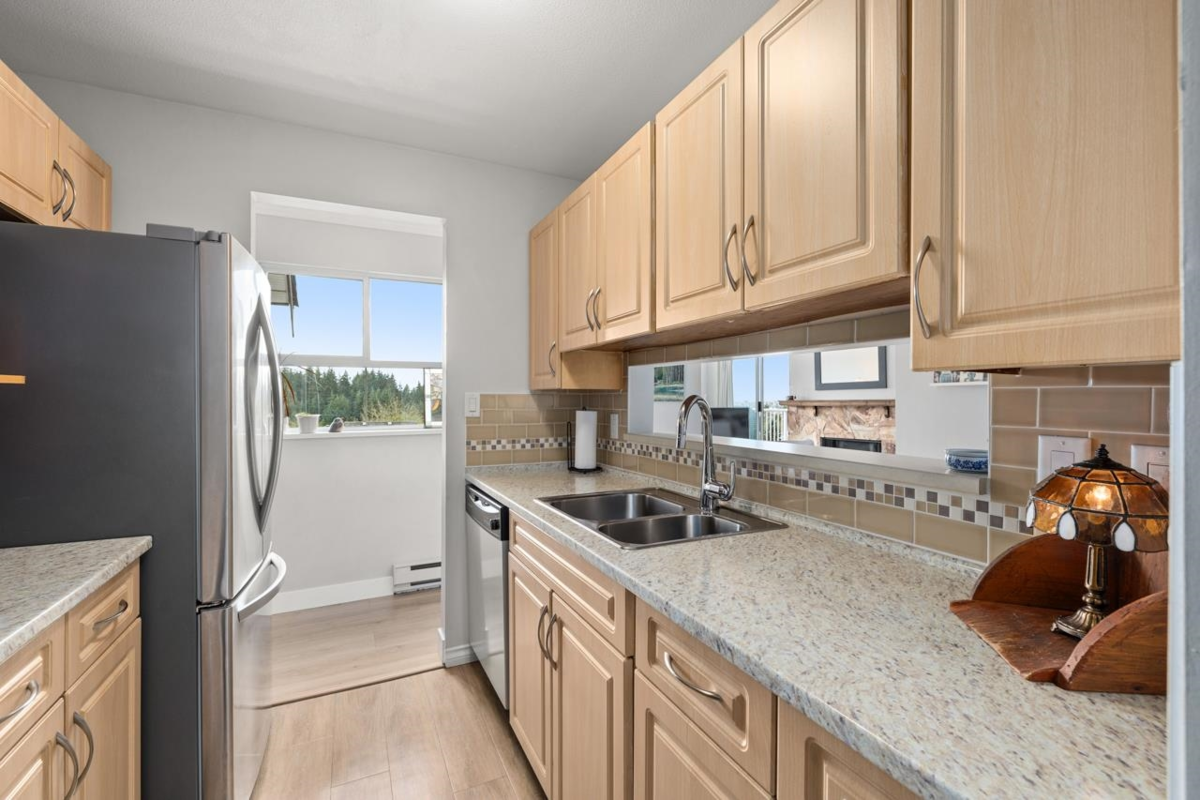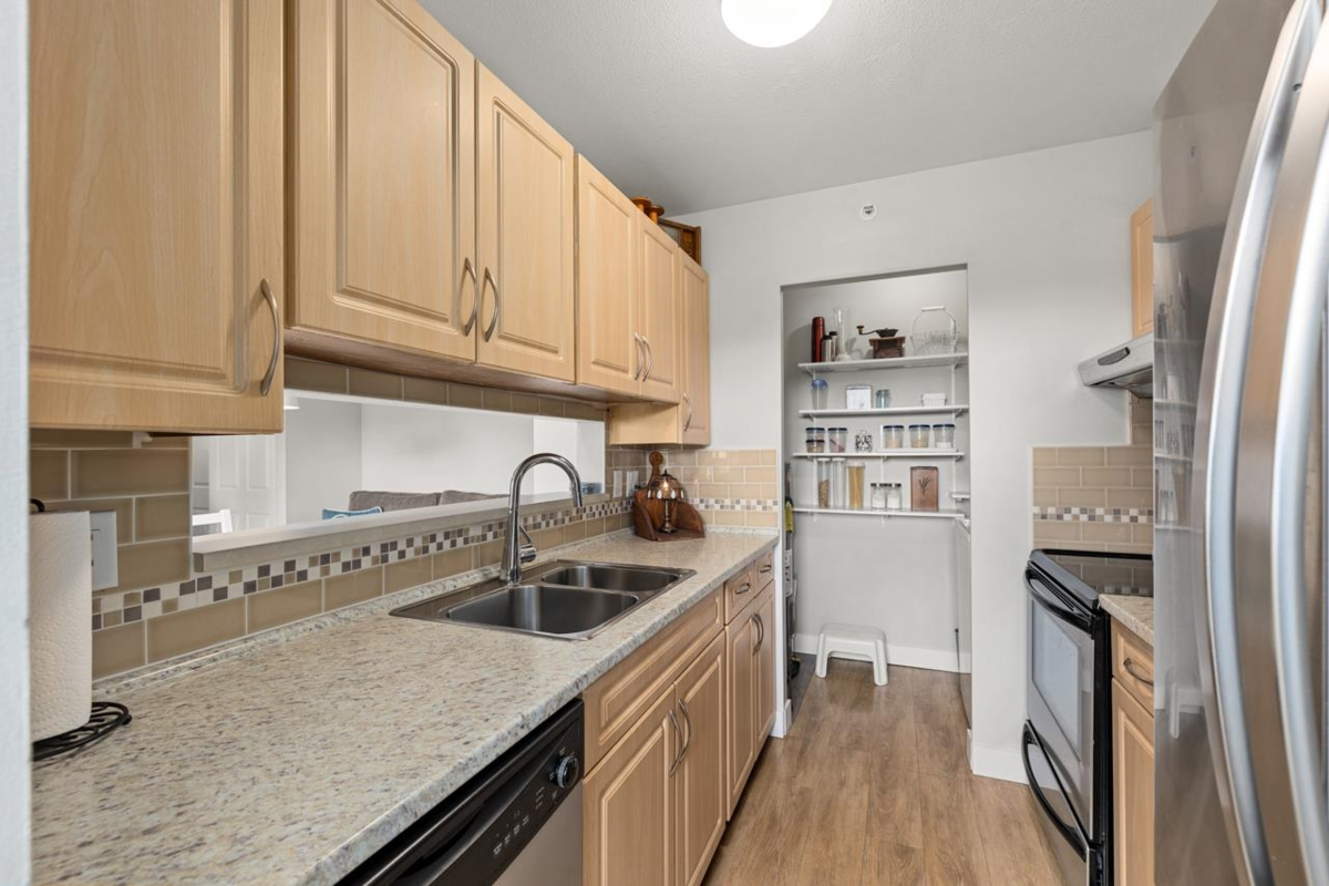 Downsizers Dream! Space, Privacy, Light, Views. This one-bedroom Penthouse is perched at the top of the building looking out over the tree-tops with south and southwest-facing views. The space is light-infused with the flexibility to open up the kitchen or to add a den. Exterior walkways are great for those with pets or bikes. Generous rooms across 1016 SF make this a unique find. Topped off with crown moldings, laminate floors & 2023 bathroom reno, this quiet, well-run, and friendly building is steps to shopping at Parkgate Village. It is an outdoor enthusiasts dream location: shopping, hiking, biking, boating, swimming, tennis, pickleball, community gardens and more all within minutes of your front door. 2 parking-one w/EV charger already installed! Bike room too.