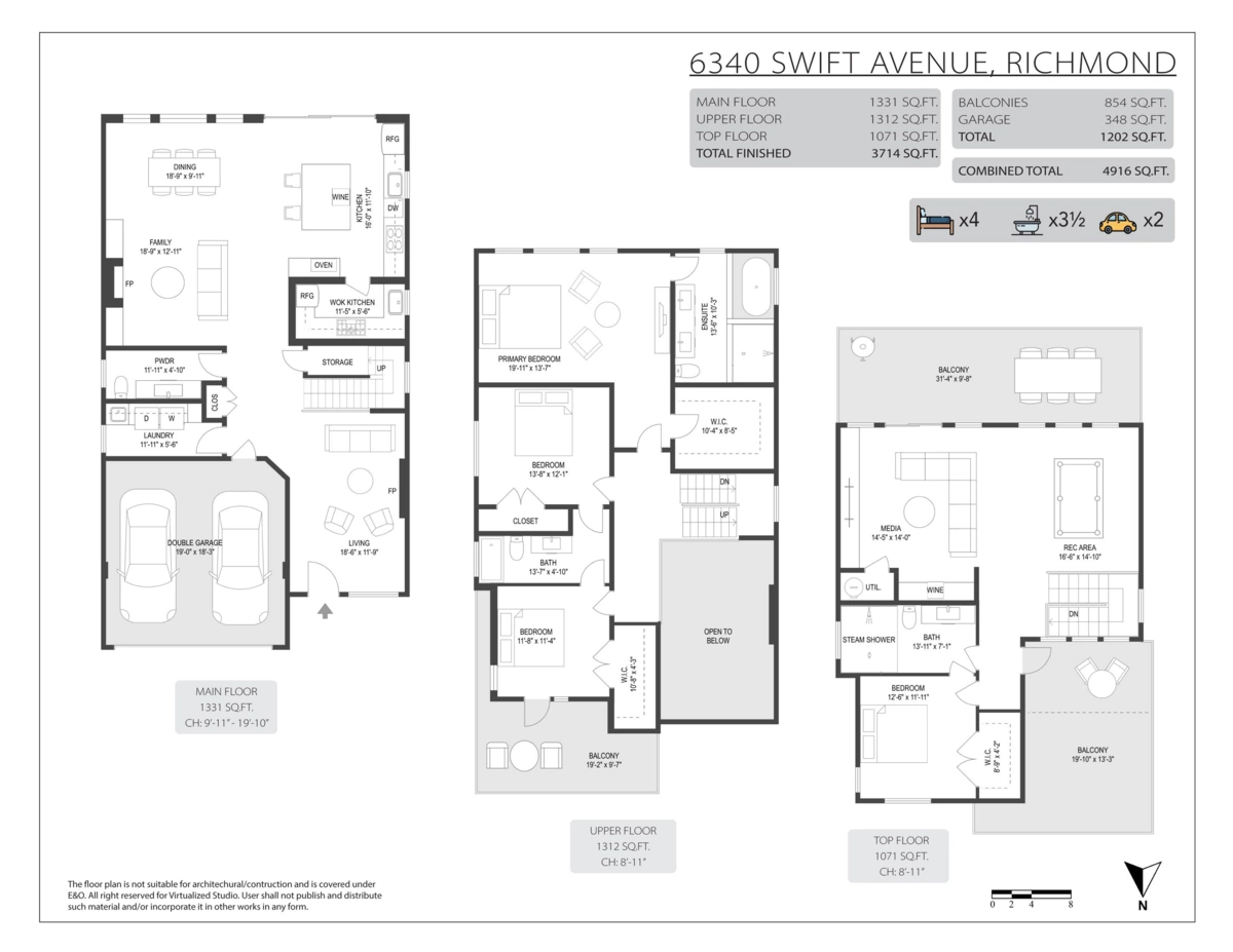 Welcome to this one of a kind three-story detached house in Richmond. Living room with 20ft ceiling height impresses from the start, with a south-facing backyard that connects the family room, dining room, and kitchen, offering all-day sunlight. This house comes with 4 bedrooms and 3.5 bathrooms, with a large media room and versatile flex space on the third floor. Other features include radiant in floor heating, central AC, and a smart home system connecting to lighting, temperature, audio, and security. Spacious outdoor area is designed on each floor, making this home a perfect blend of comfort and modern living. School catchment: McKinney Elementary & Steveston-London Secondary. Virtual tour: https://youtu.be/M9axNDoxcrM. Private showing only.