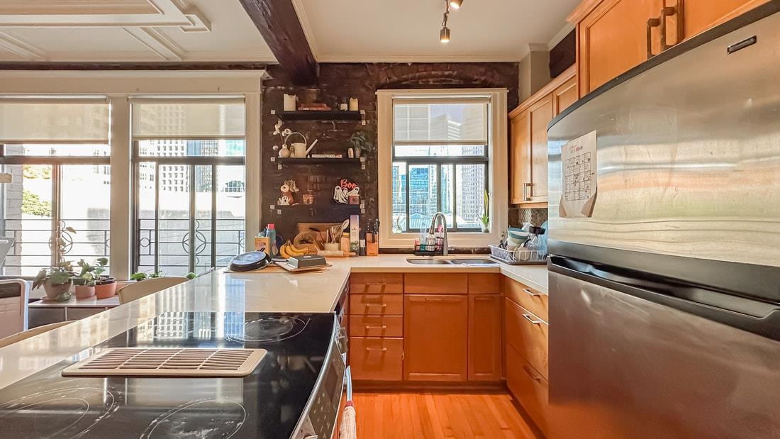 Welcome to 777 Burrard Street — a stunning New York–style loft penthouse that seamlessly blends heritage charm with modern sophistication. This bright northeast facing home showcases exposed brick, old-growth Douglas Fir beams, wainscoting, coffered ceilings, and large windows framing views of the Hotel Vancouver. The upgraded open kitchen is ideal for entertaining, complemented by a spacious living area and a versatile den currently used as a second bedroom. Nestled in an iconic, well-managed, re-piped heritage building converted to strata in 1981, it’s steps from world-class shopping, dining, and entertainment. Enjoy morning coffee on Robson or a nightcap after a show — your quiet urban retreat awaits. Cats welcome & including one storage locker. Parking available to rent offsite.