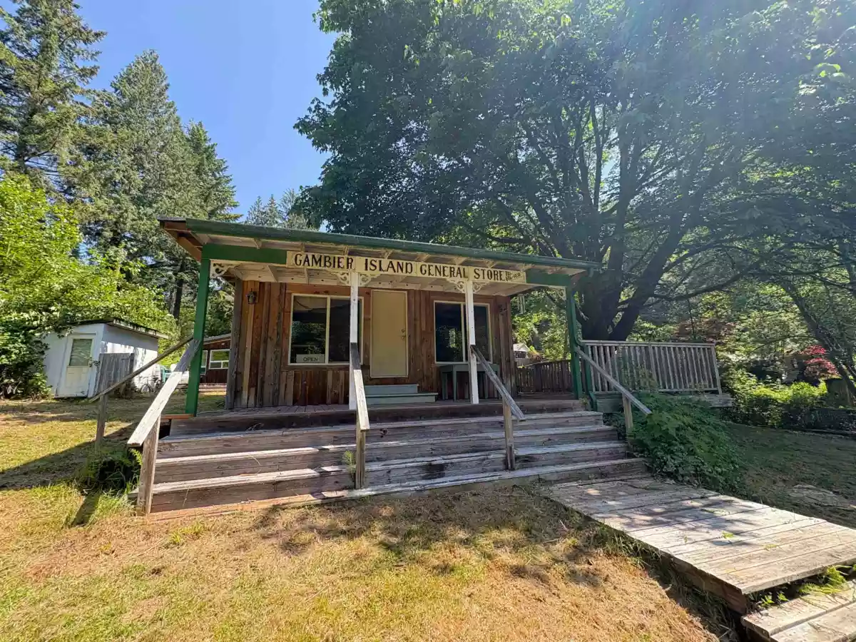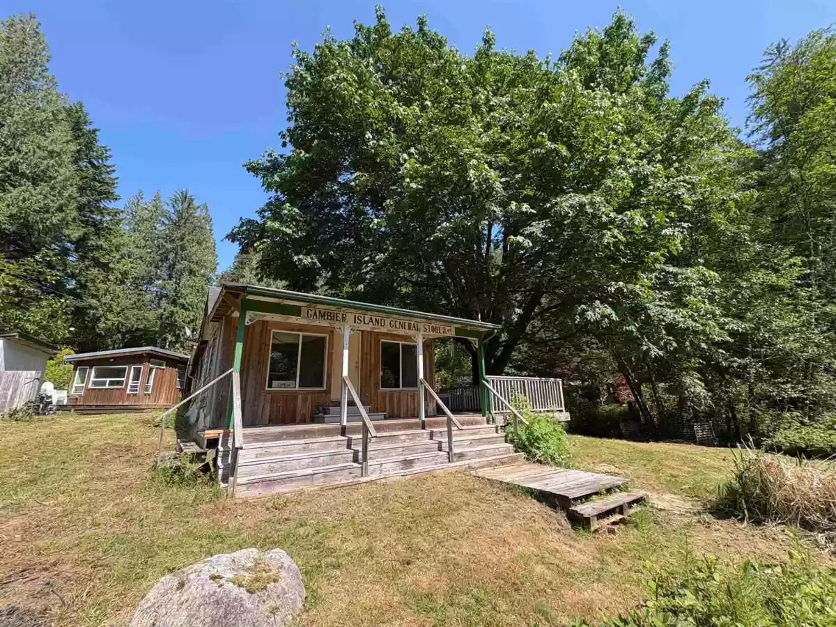Extremely Rare Live/Work Opportunity on Gambier Island! The island’s ONLY commercially zoned property on 0.57 acres, featuring the original General Store (formerly a licensed restaurant) and a detached 2-bedroom home with vaulted ceilings and exposed beams. Prime location just steps to New Brighton Dock, beaches, and the Stormaway Water Taxi for easy access to Gibsons, Sechelt, and Vancouver. With island growth, this property offers huge potential to become a community hub. Sunny lawns beside Grennon Creek with a peek a boo water view all add to its charm. Don’t miss this unique chance to blend island living with business! Preserve the historic character and build your own Legacy! Viewings by appointment. Also listed as Commercial MLS# C8073025.