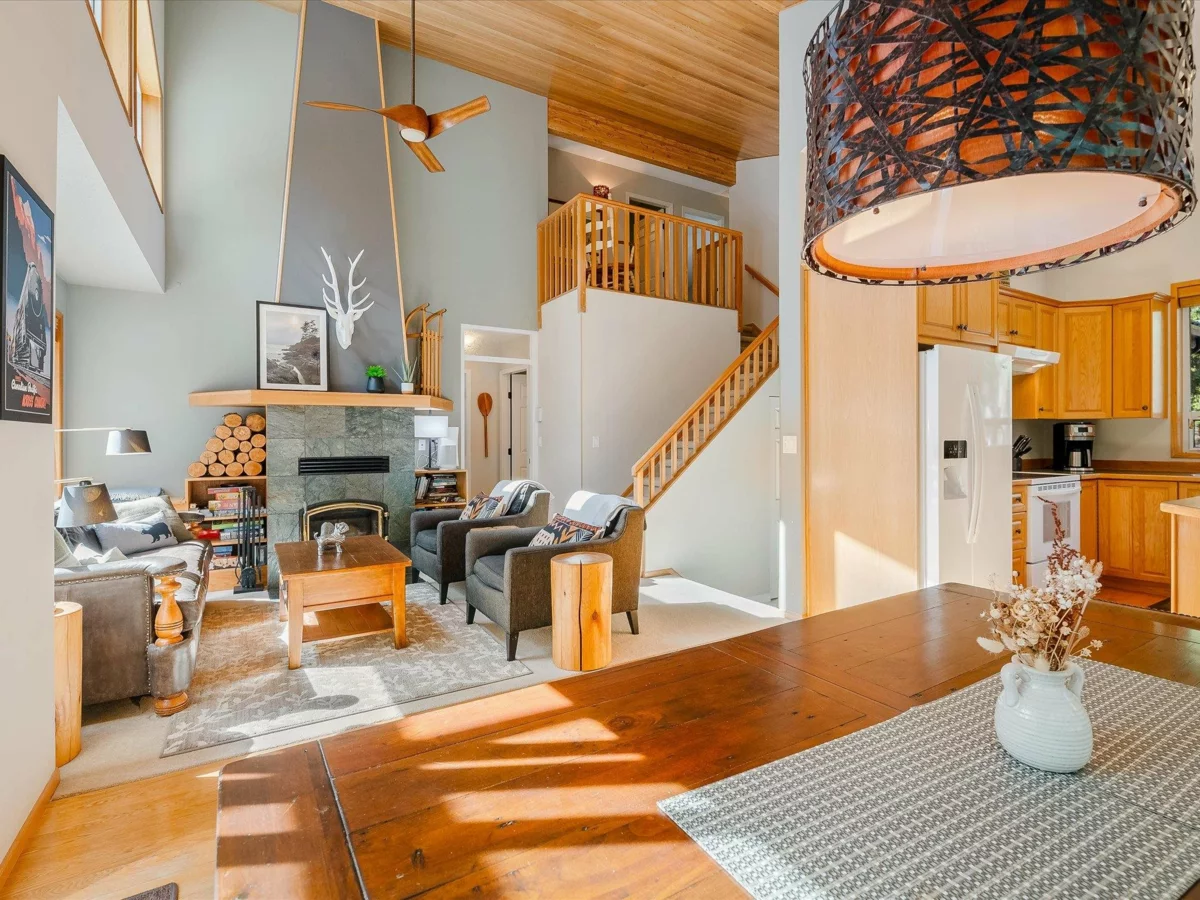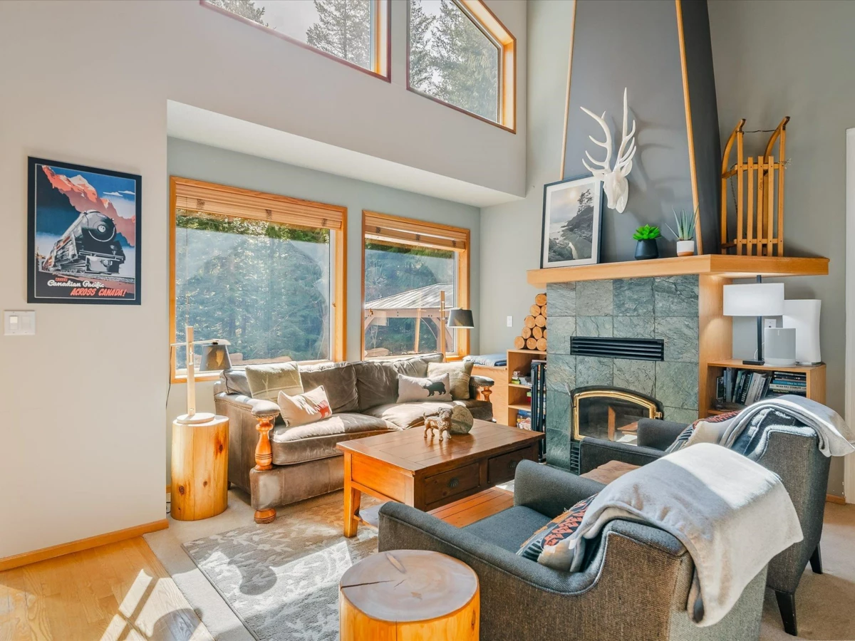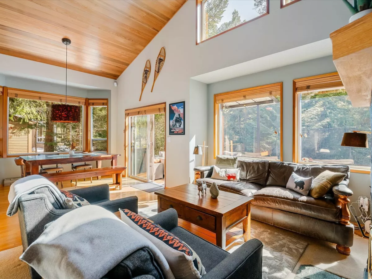 This remarkable property offers ideal living as a permanent residence or a vacation retreat. With four bedrooms and two full baths plus a family room spanning over 2,000 sqft, there's ample space to host family and friends. The soaring vaulted ceiling and wood-burning fireplace are perfect for cozy winter nights. Outside, the patio spans the entire width of the home featuring a glass-covered sitting area and a gazebo-covered hot tub and a large level yard. Additional features include a sizeable ski boot room, a firewood room, abundant storage, plentiful parking and a garage. Located just a short stroll to Pinecrest Lake, the beach, and the newly constructed clubhouse and with only a 15-minute drive to Whistler Creekside, this property offers tranquility and convenience in equal measure.