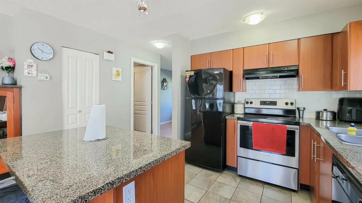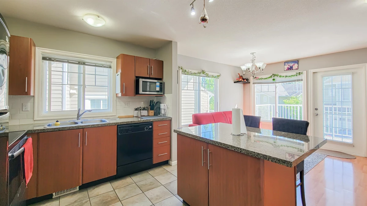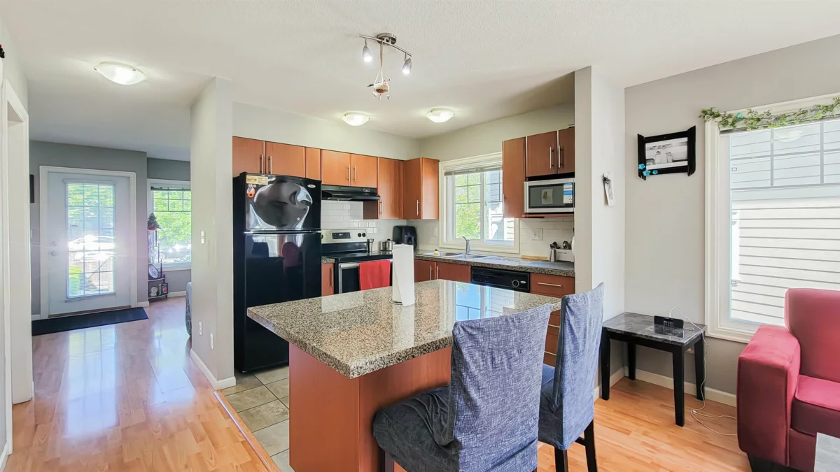 Seneca Woods! This bright and spacious END UNIT townhome offers 3 bedrooms, 3 bathrooms, and 1,879 sqft of thoughtfully designed living space. The modern kitchen features granite countertops, a center island with storage, and a pantry — ideal for everyday living and entertaining. Relax in the cozy living room with an electric fireplace, or step out to the deck and patio areas surrounded by green space. Main floor includes a powder room for guests. Upstairs boasts a primary bedroom with walk-in closet and ensuite, plus two generous bedrooms. The finished basement includes a large rec room with bar area, laundry, and ample storage. Complete with a single garage, driveway pad, and plenty of street parking, this home is in a family-friendly. Showing by appointment only. Easy to show.
