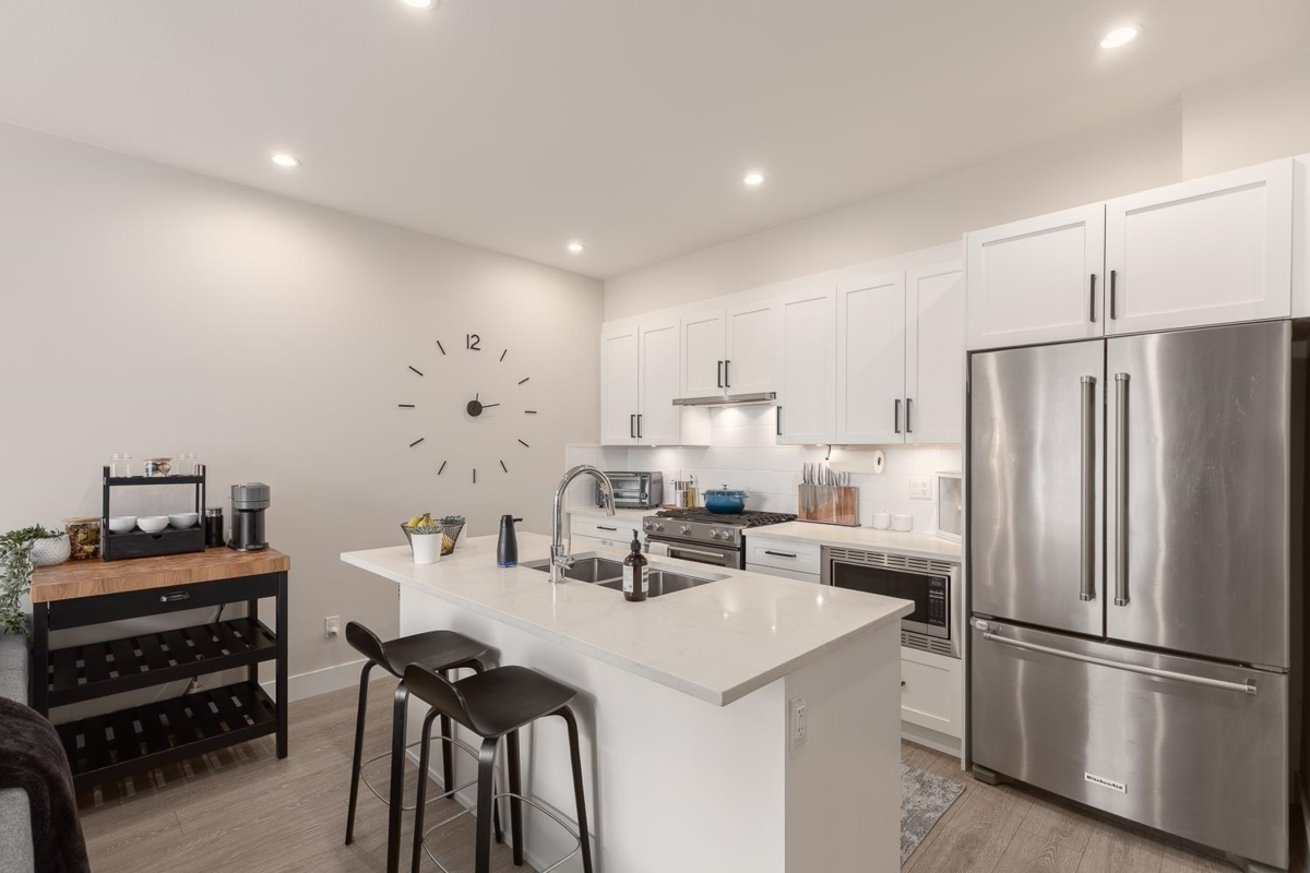 Welcome to Berkeley Village, nestled in one of the best locations in South Surrey! This bright & stylish 2 bed + Den, 2.5 bath home offers an open-concept main floor w/ 9’ ceilings, oversized windows, & a sleek kitchen feat. S/S appliances, gas range, & a large island. Upstairs are 2 spacious bdrms, incl. a primary suite w/ walk-in closet & spa-inspired ensuite. Private 500 sq. ft. rooftop deck oasis w/ unobstructed S & W views- perfect for relaxing year-round. Also feat. side-by-side double garage, powder room & versatile Den on the main. The community boasts over 6,000 sq. ft. of amenities- gym, guest suite, lounge, & playground. Conveniently located steps from new elementary school Ta'talu, Grandview shops, Aquatic Centre, White Rock Beach and Hwy 99. Open House Saturday, 2-4.