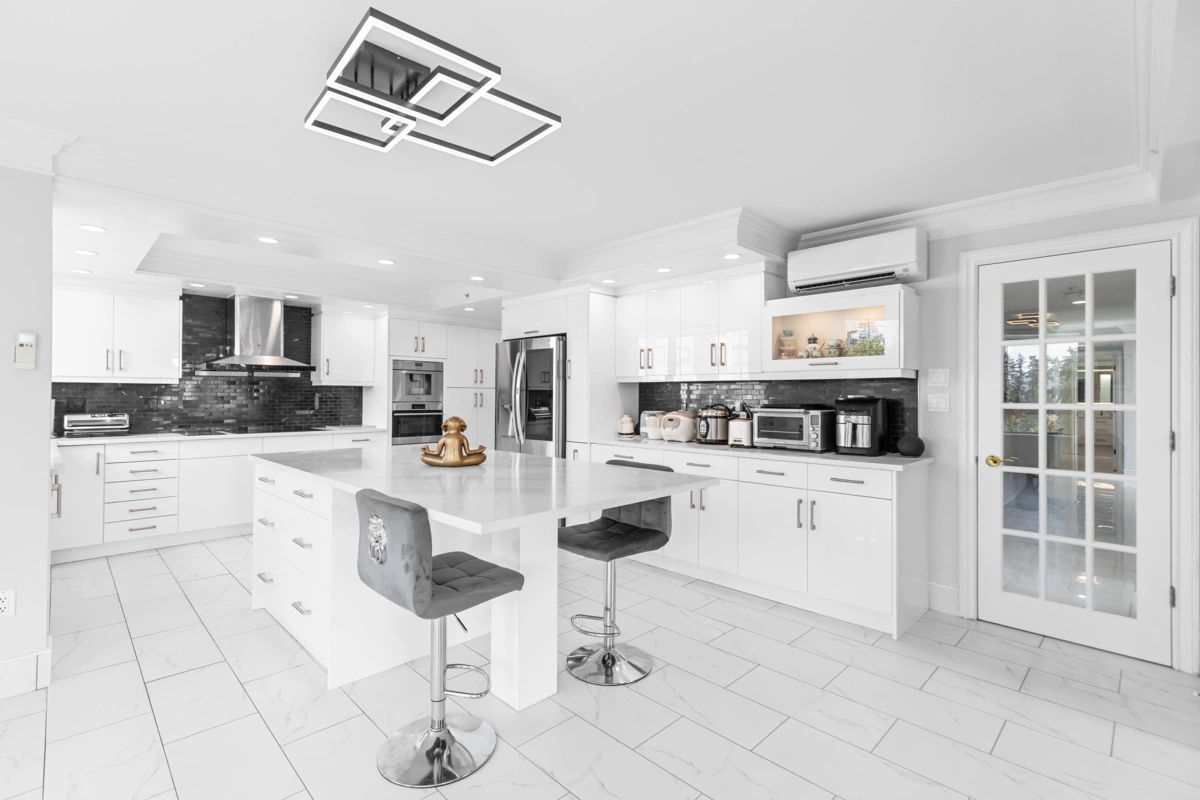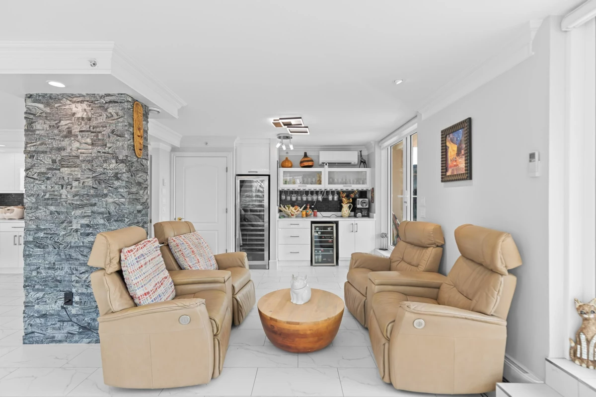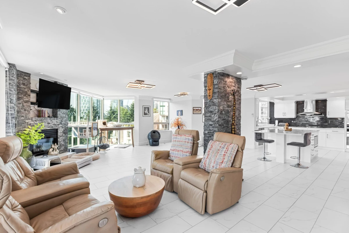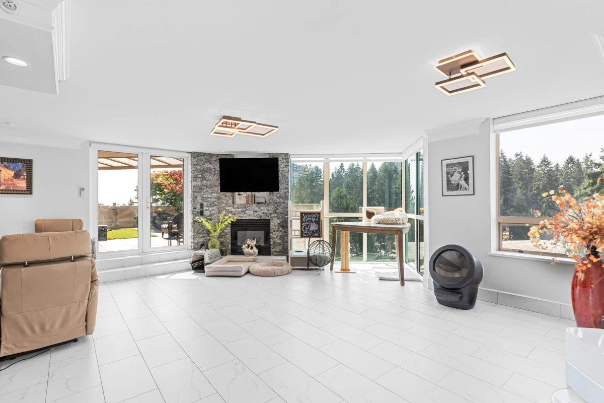 Prestigious 3,654 SF Bosa-built Apartment with 1,800 SF private patio and breathtaking mountain views. Ideal for multigenerational living or a luxury work-from-home lifestyle. 5 spacious bedrooms, 3 full baths, 3 fireplaces, full A/C, and excellent Feng Shui with natural light and open layout. Gourmet kitchen with Wolf steam + convection ovens, Miele dishwasher, LG ThinQ fridge, wine & beverage fridges, and quartz counters. Spa-inspired ensuite with bidet, rain shower, double vanity, and heated floors. Includes 5 secure parking stalls and 3 full-height storage lockers (combined into 1). Steps to SkyTrain, Lafarge Lake, top schools, and Coquitlam Centre. Call your Realtor for a private viewing.