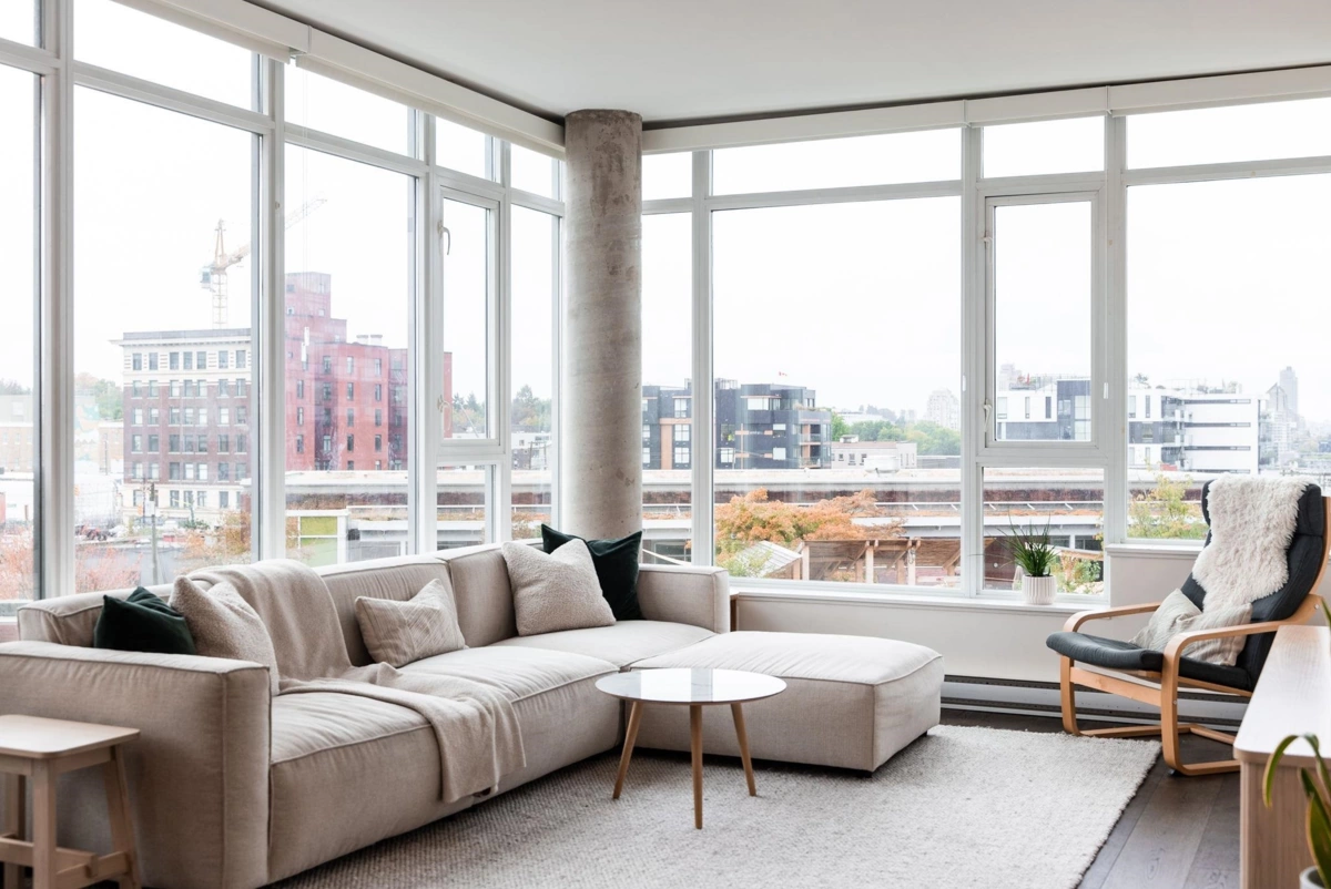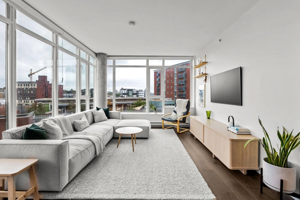 A TRUE 3bedroom home in the heart of the charming Mount Pleasant neighbourhood. A bungalow feel w/ no wasted space to stairs - this bright & spacious corner suite is nearly 1270sf sprawled across one level. Offering generously sized rooms throughout, an open kitch that overlooks the oversized living area, private eating area & den ideal for in-suite storage space/home office. Upgrades incl AC, newer s/s appliances, California Closet organizers & Hunter Douglas blinds. Elevated ceilings & wall-to-wall windows allow for natural light to flow through the home & boast views of iconic East Van murals. 'Social' has gym, bike storage, rooftop patio & guest suites. Step outside to parks, Main Street eats, close to upcoming Skytrain station & more!