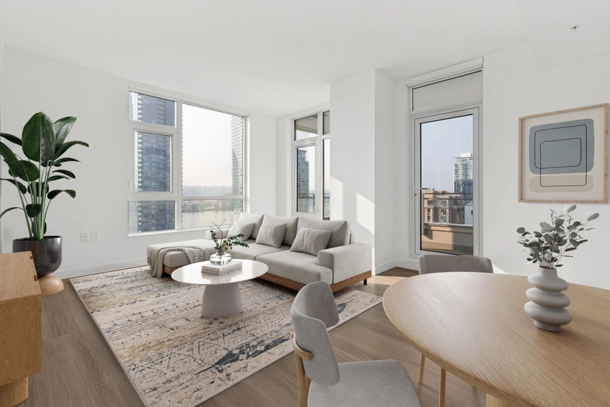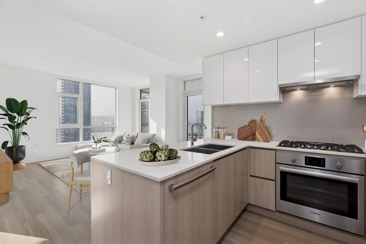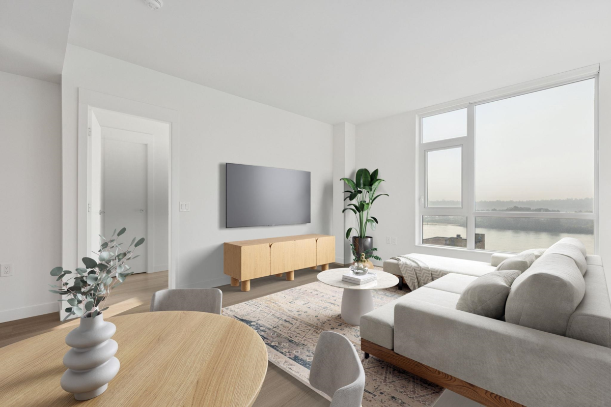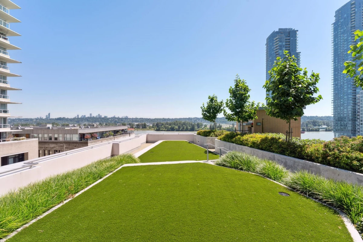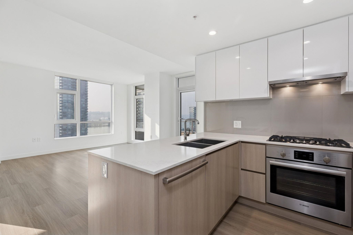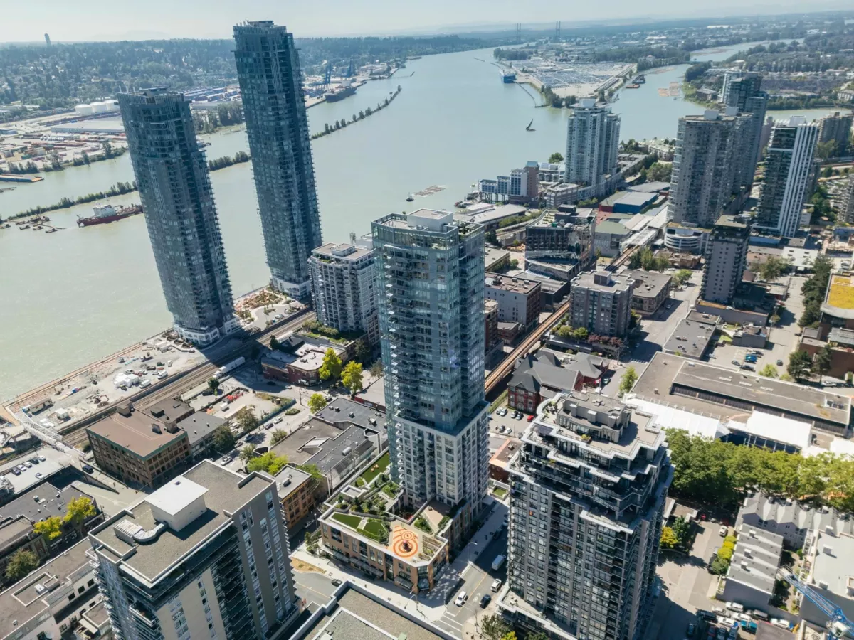 Welcome home to 618 Carnarvon! This 889 SF, 2 Bed, 2 Full bath, CORNER SUITE features the rarely available C2 plan, south exposures, UNOBSTRUCTED RIVER VIEWS, quartz countertops, porcelain backsplashes, under cabinet lighting, FORCED AIR HEATING & COOLING, 5 burner gas range, BOSCH appliances, KOHLER fixtures, wall to wall tiles in both bathrooms, 1 locker, & 1 Parking with EV ROUGH-IN. Both bedrooms are on opposite sides of the home for extra privacy. Square living/dining area makes it easy for furniture. Enjoy water views & BBQ's from your large balcony. Amenities include 30,000 SF of garden areas, party room, workspace/meeting room, firepit/BBQ area, gym, & guest suite. Only 5 mins walk to TWO SkyTrain Stations, restaurants, Pier Park, cafes, & grocery. MUST SEE VIRTUAL TOUR!