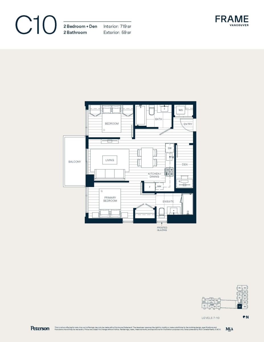 Discover Frame by Peterson Group - a modern community just a 10-minute stroll from 29th Avenue Station, placing you at the heart of one of Vancouver's well-connected areas. This thoughtfully designed C10 layout offers 2-bedrooms plus den and 2 bathrooms, featuring a sleek kitchen outfitted with premium European gas appliances and generous cabinetry. The versatile den is ideal for a home office, and the bright living area opens to a west-facing balcony, perfect for enjoying the outdoors. Residents will also have access to more than 12,000 sqft of amenities, including two scenic rooftop terraces, a fitness studio, an entertainment lounge, and secure parcel rooms. Come visit the Frame Presentation Centre at 2008 Kingsway, Vancouver - Open by appointment only.