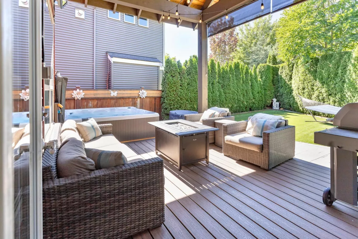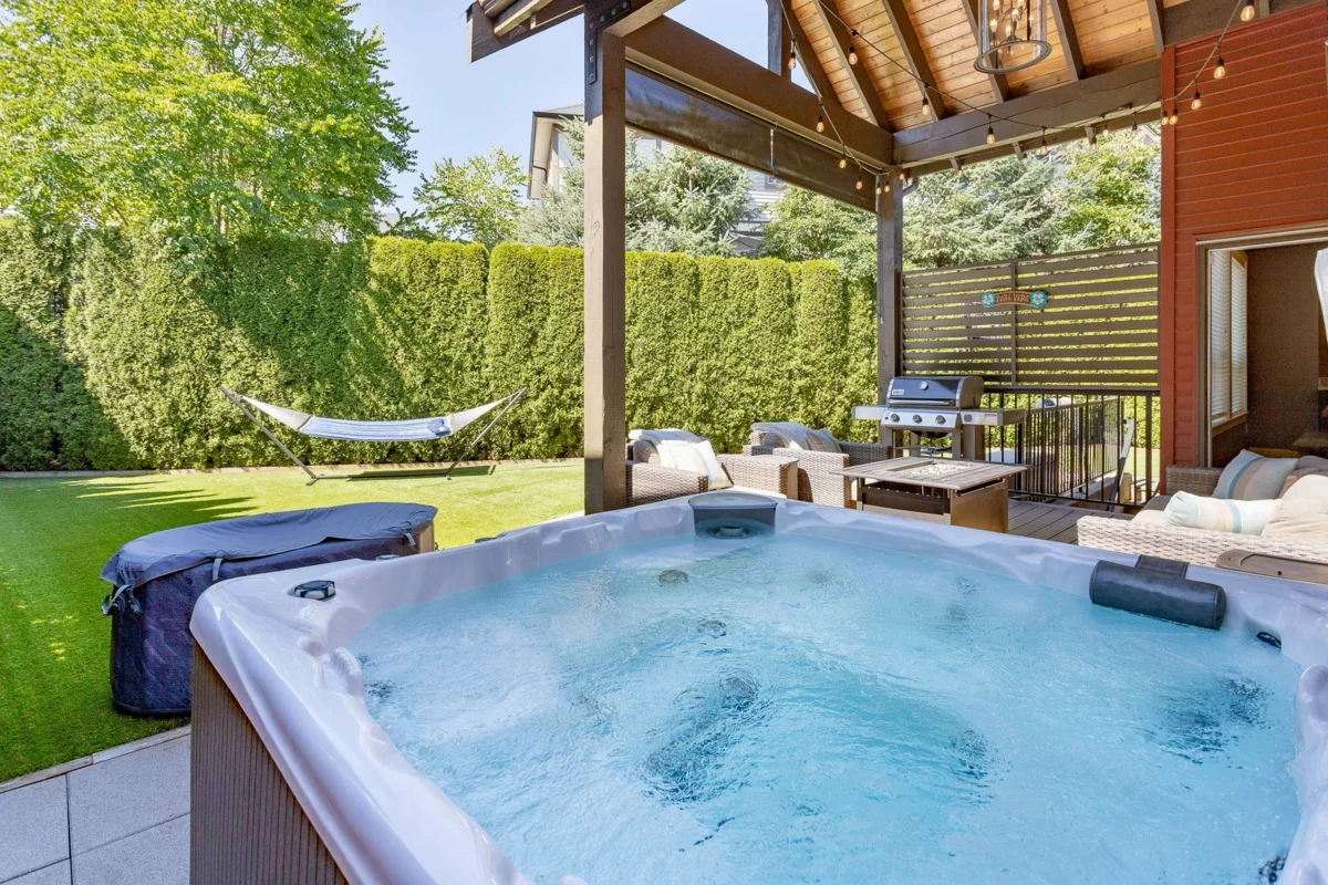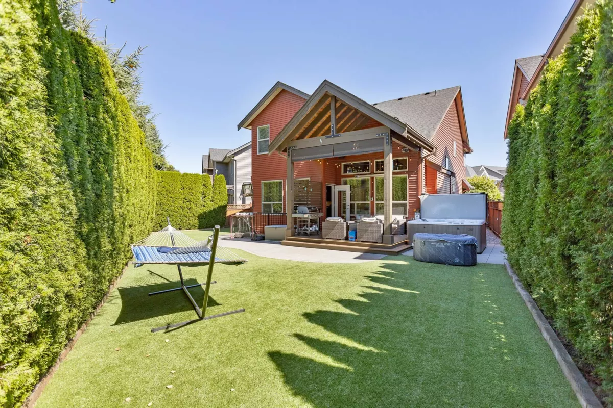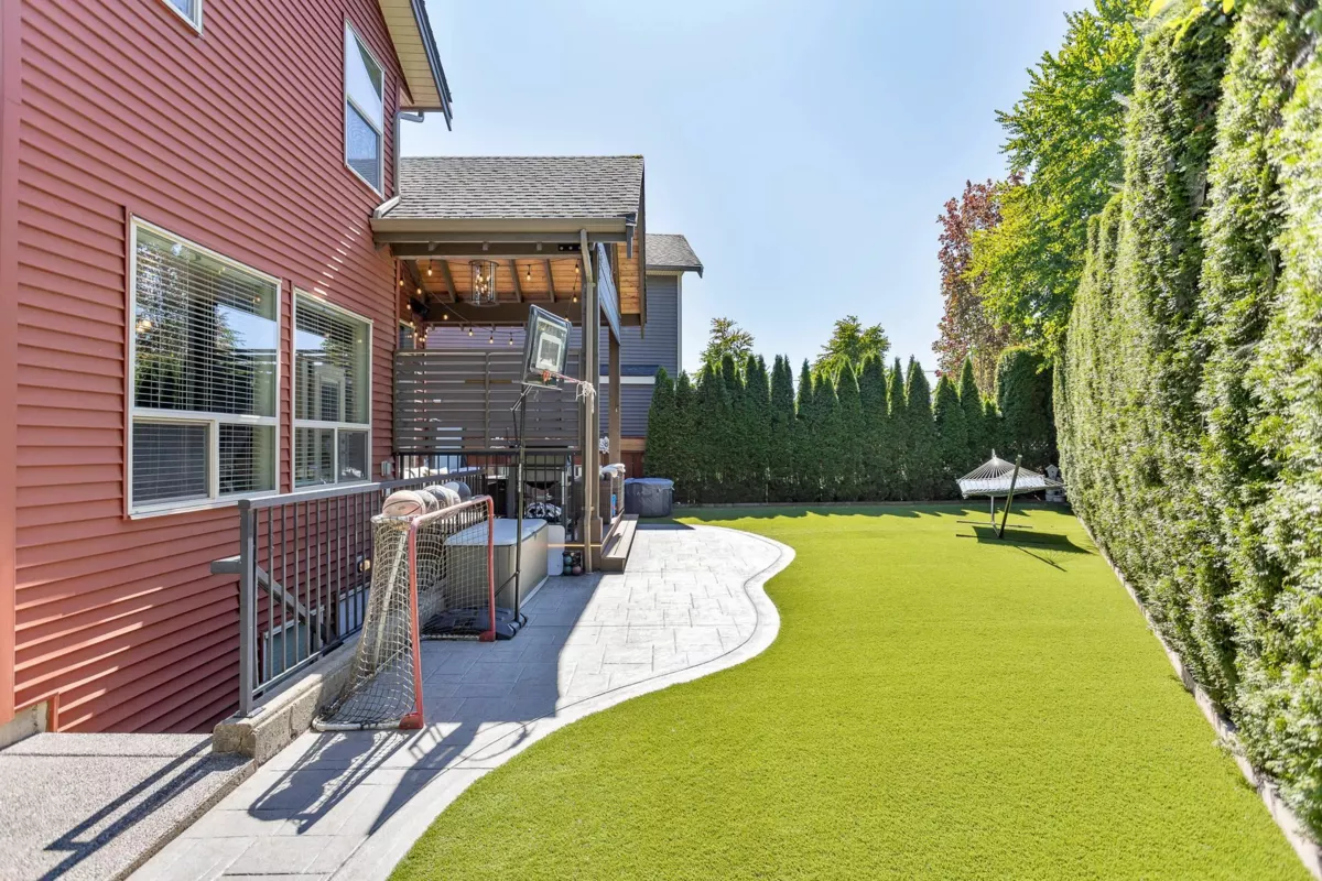 A stunning RAB home in Yorkson South. The great room offers a bright open space with oversized windows and double-height ceilings, a gourmet kitchen, granite counters and rich dark cabinetry. Dining area includes a built-in buffet/wine bar. Wired for surround sound and incl A/C for your comfort. Upstairs are four large bedrooms with a spa-inspired ensuite and walk-in closet. Downstairs has a rec room, exercise area, and an additional unfinished 500 sq ft for a potential mtg helper. The lot is one of the biggest in the neighborhood, featuring a large patio patio with a vaulted roof, chandelier, a built-in heater for year-round use and stamped concrete . As well as hot tub and low-maintenance turf, 12’ privacy cedars w/ irrigation. Minutes from parks, schools, shopping and hwy access