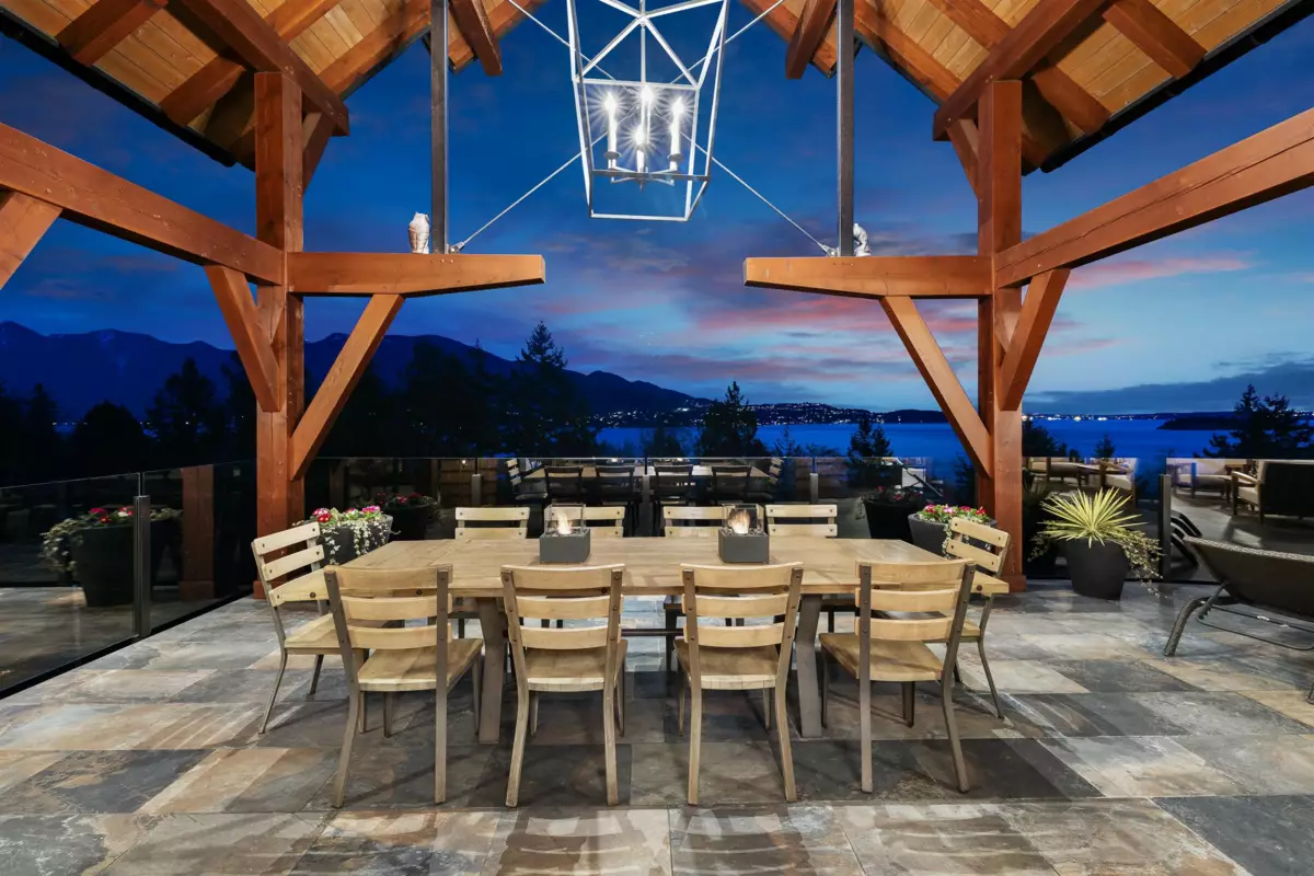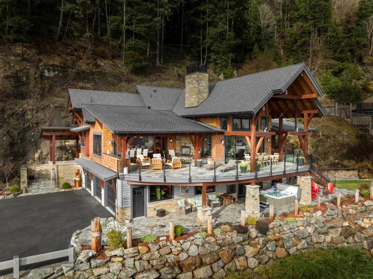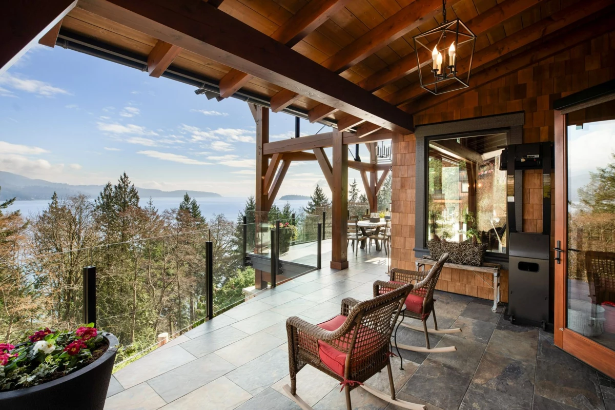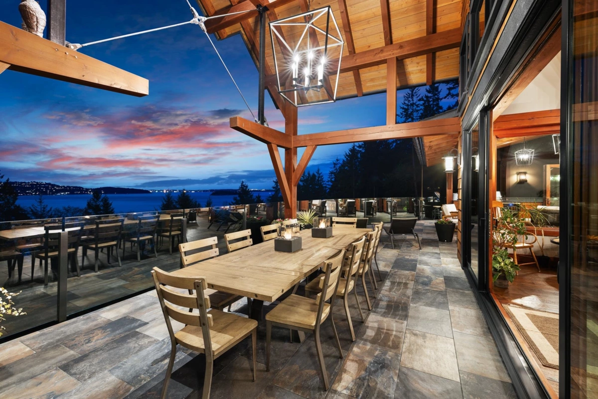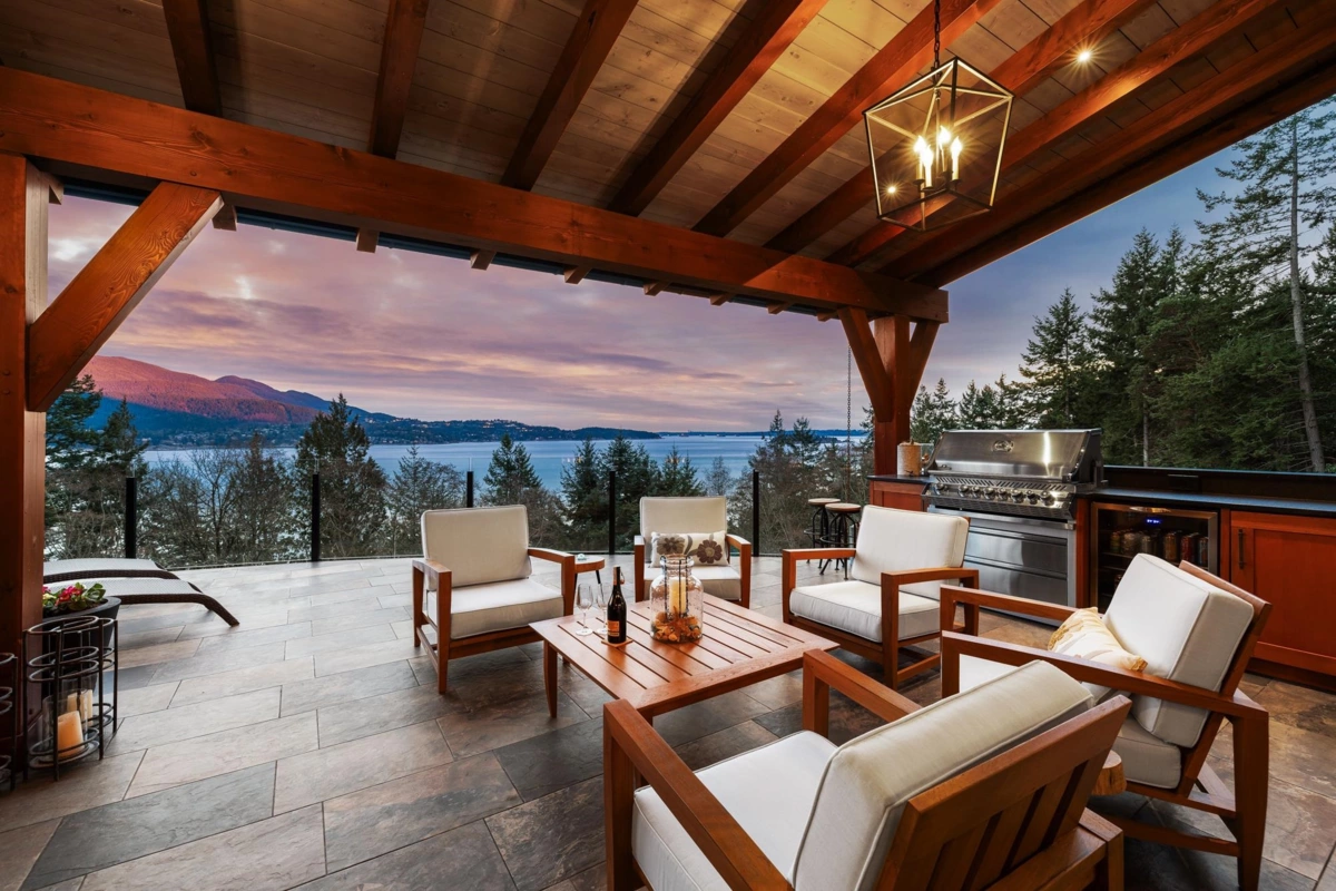 This stunning ocean view property featuring a masterpiece of engineering, custom built, Canadian Timberframe Ltd home is ready to welcome a new family. The expansive timber peaks & over 1100 sq.ft. covered entertainment deck sets it apart. The open plan main floor boasts timberframe ceilings soaring over 24'. Custom Loewen Douglas Fir interior/metal exterior windows & doors, engineered Hickory flooring & exclusive lighting compliment the space. Chefs will covet the gourmet kitchen with state of the art appliances & expansive Quartz countertops. Main level primary bedroom, ensuite & walk in closet showcase the cathedral timberframe ceilings. A special retreat w/floor to ceiling fireplaces & private decks overlooking ocean, mountain and coastal views. Vancouver within easy reach.