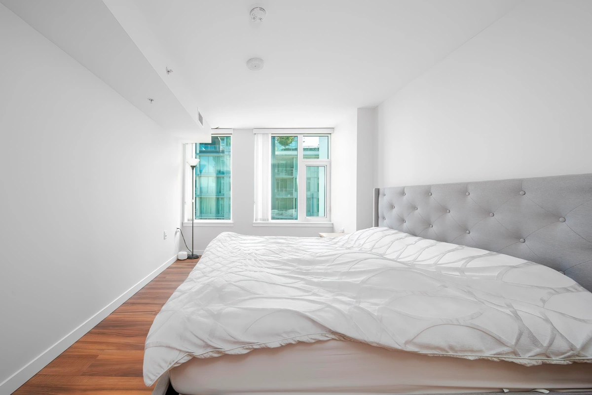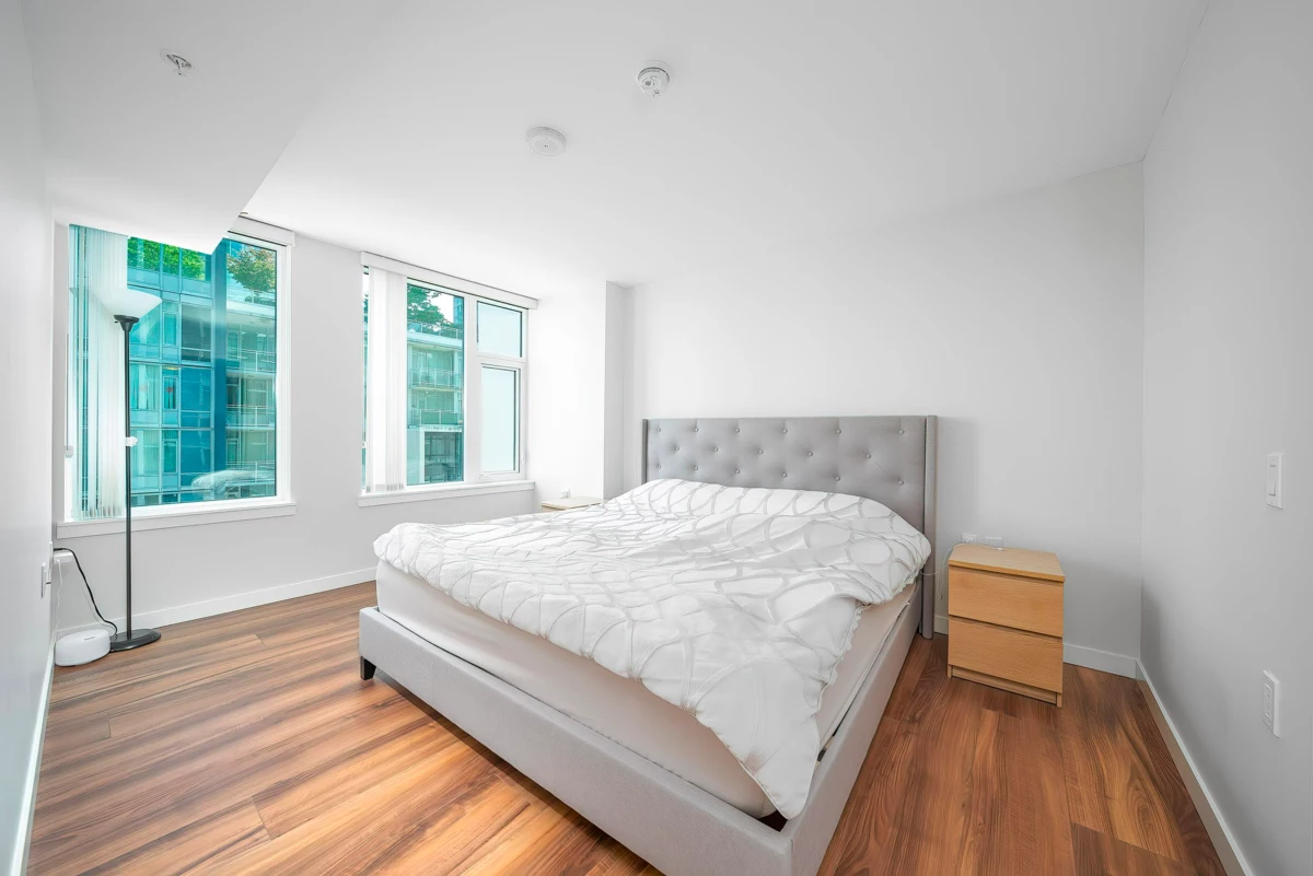 Spacious, bright, and exceptionally functional! This 1028 SQFT South East-facing 2 Bed 2 Bath home at Torino South offers the most efficient layout in the development — with separated ensuited bedrooms, each with a walk-in closet. The deluxe U-shaped kitchen features crisp Bianca white cabinetry, full-size appliances, and flows into a bright open-concept living/dining area with 9’ ceilings and wide-plank laminate flooring throughout. Enjoy central heating & cooling, 1 EV parking stall. Nestled in the quiet inner courtyard, this home is just steps from groceries, restaurants, and daily essentials — and only a 5-minute walk to Capstan SkyTrain Station. A rare opportunity for size, layout, and location – don’t miss out!