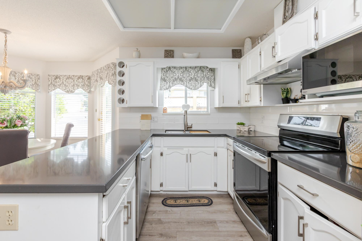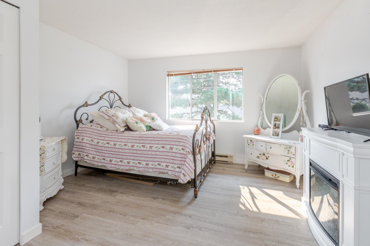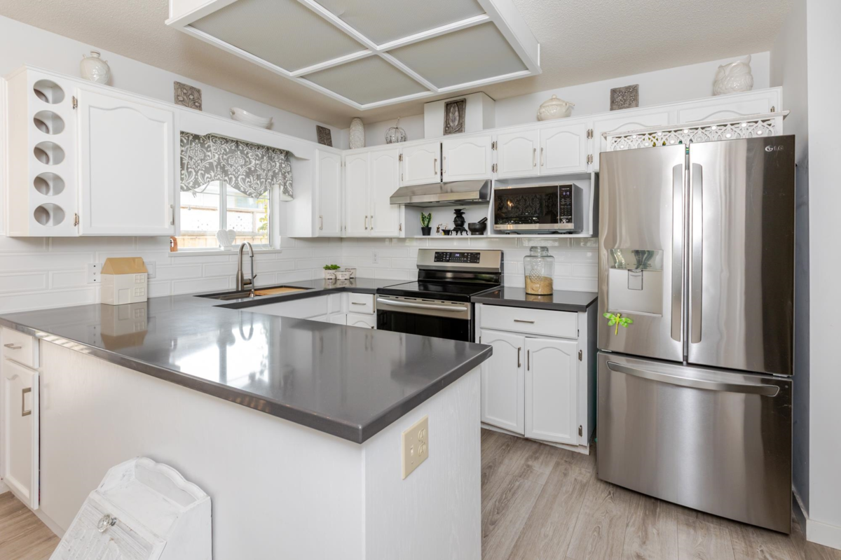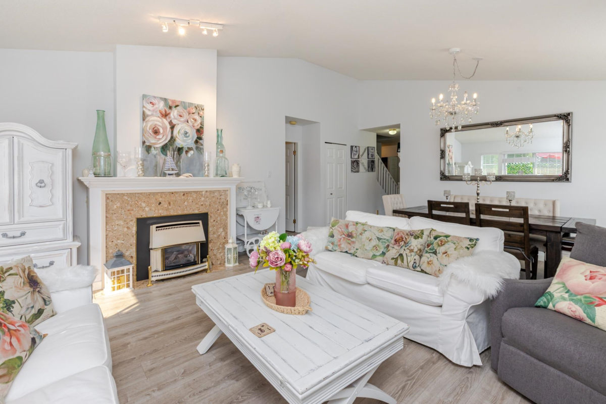 Attention downsizers! This beautifully updated END UNIT townhome offers 3 bedrooms, 2.5 bathrooms, & over 1,600sf. of bright, open living space — making it feel more like a detached home. Tastefully updated w/light laminate flooring, s/s appliances, quartz counters in the kitchen, mini split A/C, & newer washer/dryer. Other features include soaring vaulted ceilings & a cozy gas fireplace. Primary bedroom conveniently located on the main floor w/spacious ensuite + a updated powder room & a double side-by-side garage add everyday comfort. Large windows throughout flood the home w/natural light. Step outside to a generous southwest-facing patio that backs onto a serene greenbelt. Enjoy the complexes fantastic amenities including a clubhouse, putting green, hot tub, and outdoor pool.