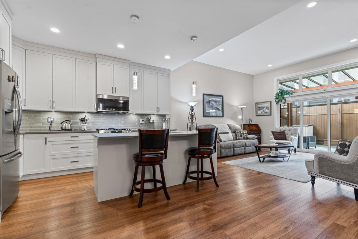 This beautiful home in Thomas Crossing a 55+ gated complex offers open-concept main floor plan w/ extended kitchen island, pantry, and S/S appliances & gas range. The primary bedroom features a beautiful 4 pc ensuite and spacious w/i closet. Downstairs you will find an additional bedroom, full bath, large rec room and extra storage. The double garage has an EV hook-up and epoxy flooring, w/ double driveway. Outside the extended patio provides an excellent setting for year-round enjoyment enhanced by a glass awning for extra light, electric patio shades, natural gas BBQ hookup, artificial turf and a fully fenced yard. The home is finished with professionally installed Gemstone exterior lighting. Land you own - not leased! Bareland strata fee $171.37/month.