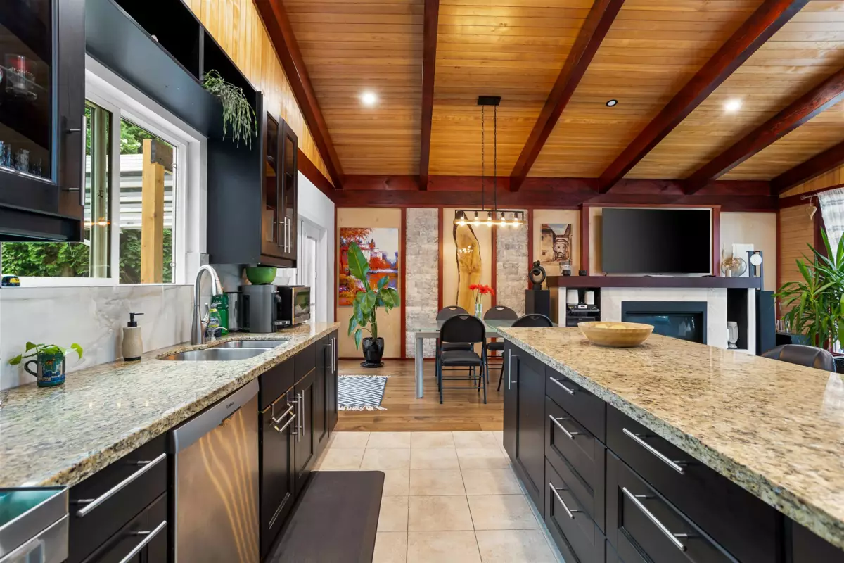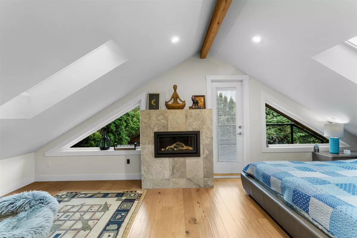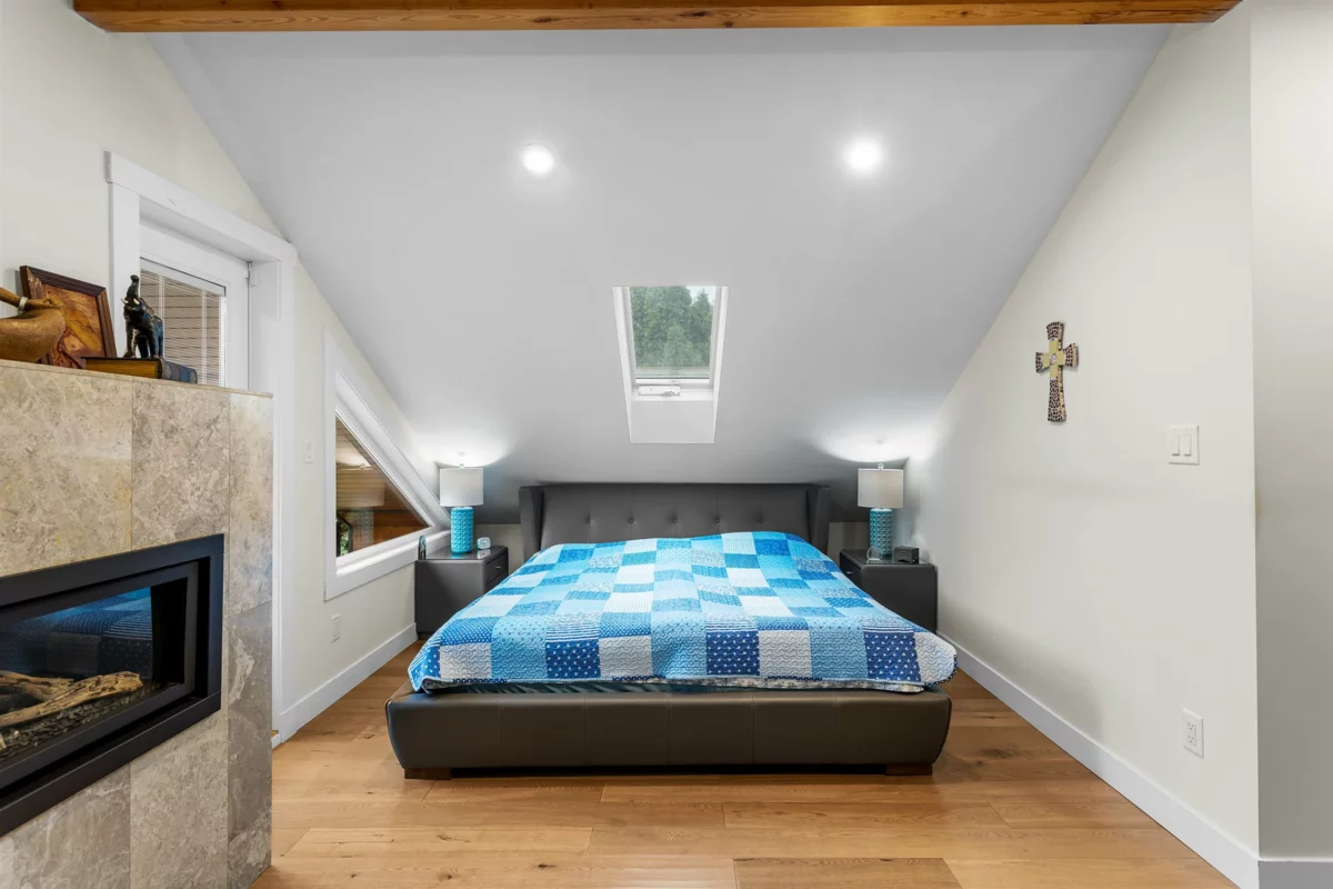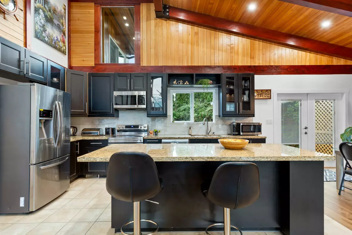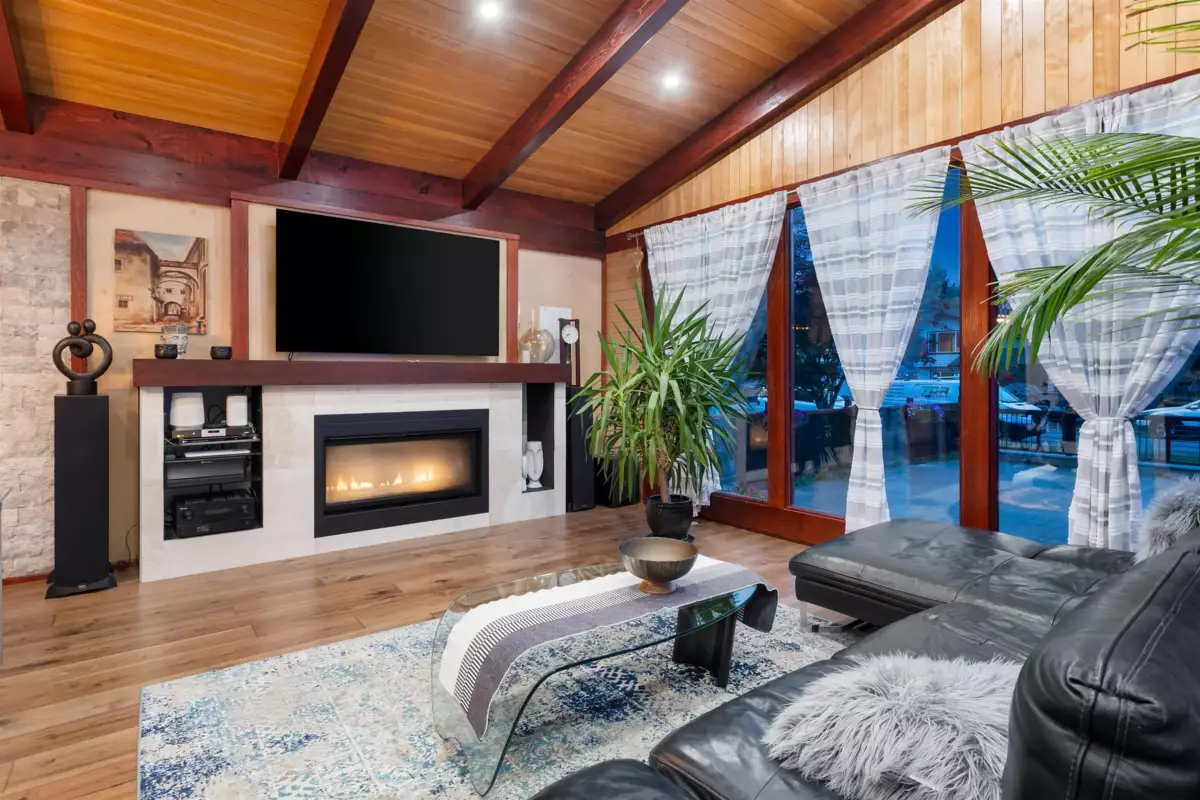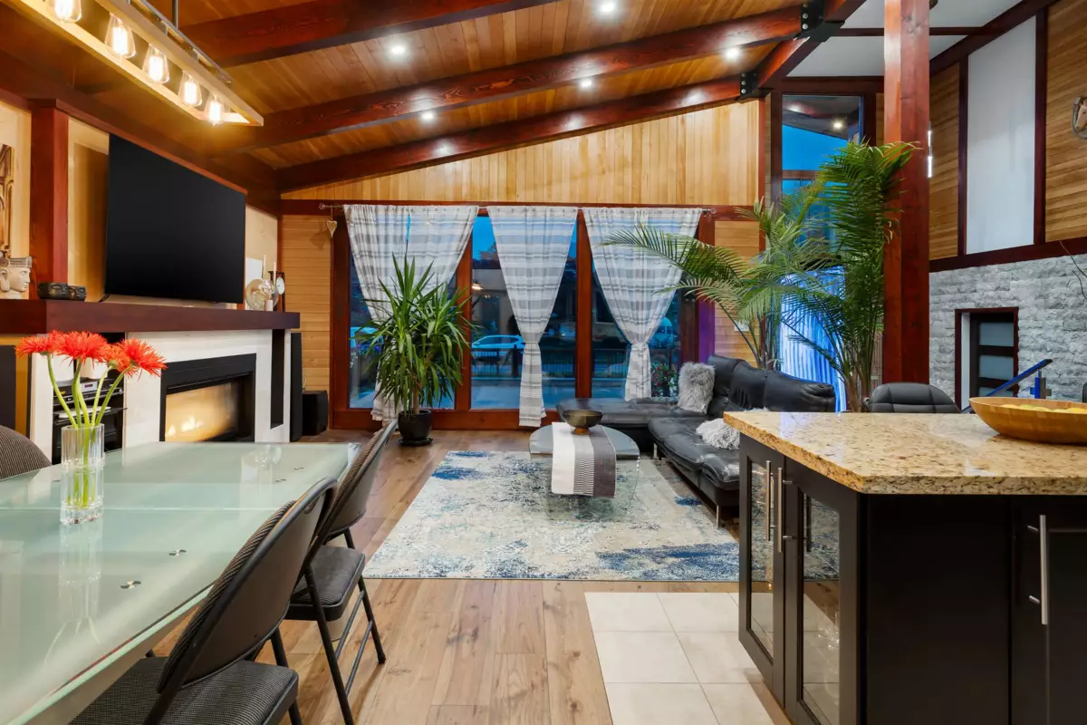 This 4-bedroom, 3-bath Slovakian-inspired Whistler post-and-beam masterpiece combines timeless craftsmanship with modern functionality. From its gated entrance, stamped concrete and brick driveway, and custom travertine exterior to its low-maintenance artificial turf and frameless glass railings, every detail exudes quality. Inside, soaring 16-ft ceilings, grade #1 hemlock finishes, custom cabinetry, granite surfaces, and Samsung/Bosch appliances create a warm yet refined atmosphere. The primary suite offers dual walk-in closets, a skylit Romeo & Juliet balcony, and a marble-encased fireplace. Additional features include a sunlit solarium, multiple French doors to cedar decks, a fully equipped workshop-style garage, and a self-contained one-bedroom suite with luxury finishes.