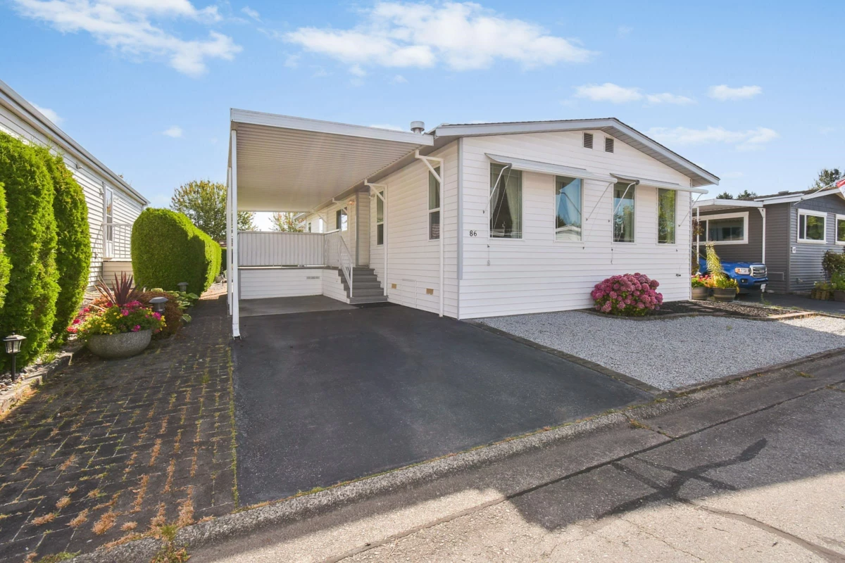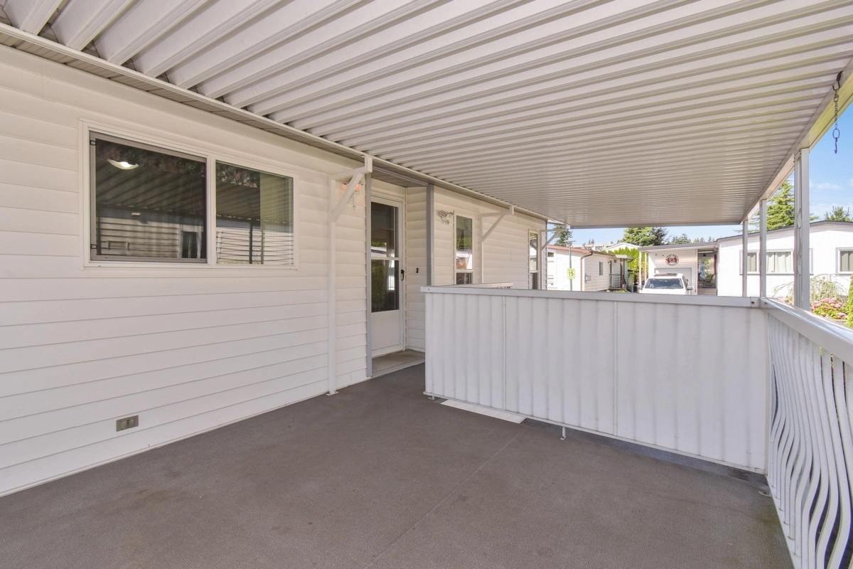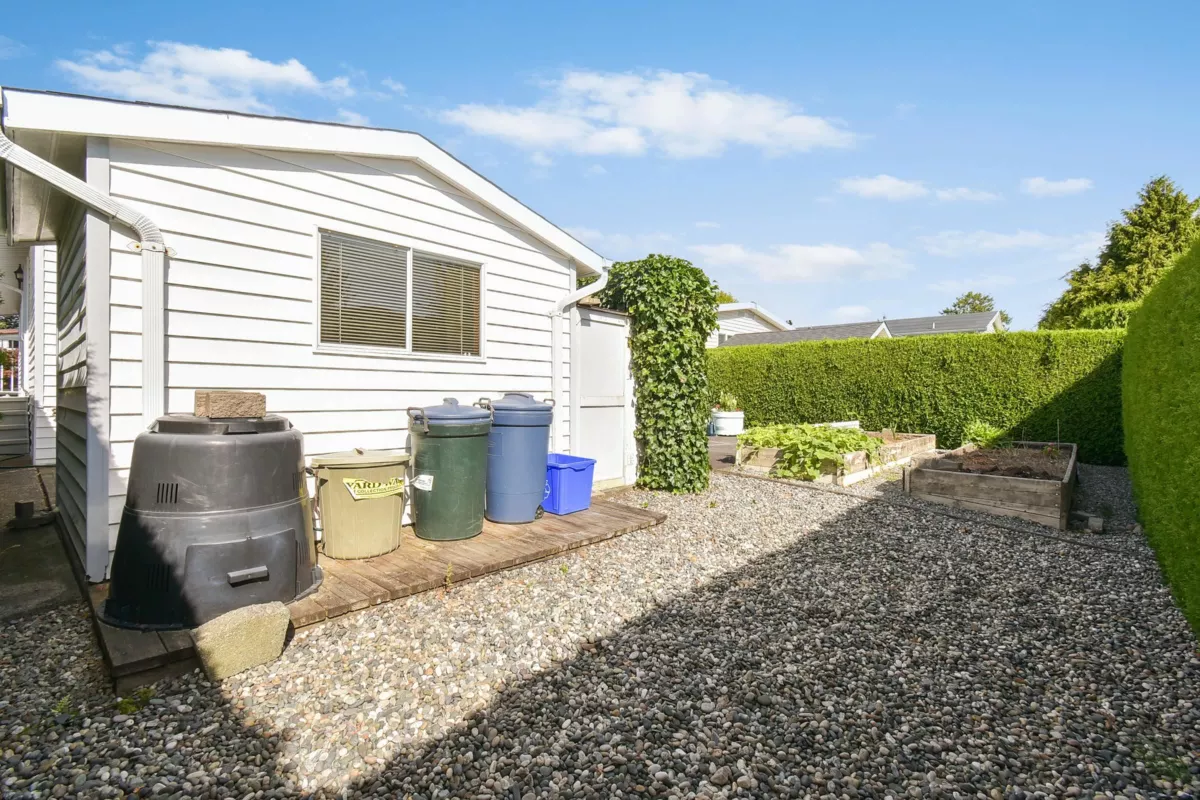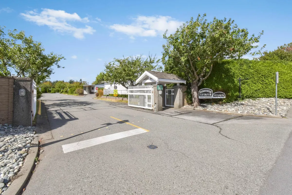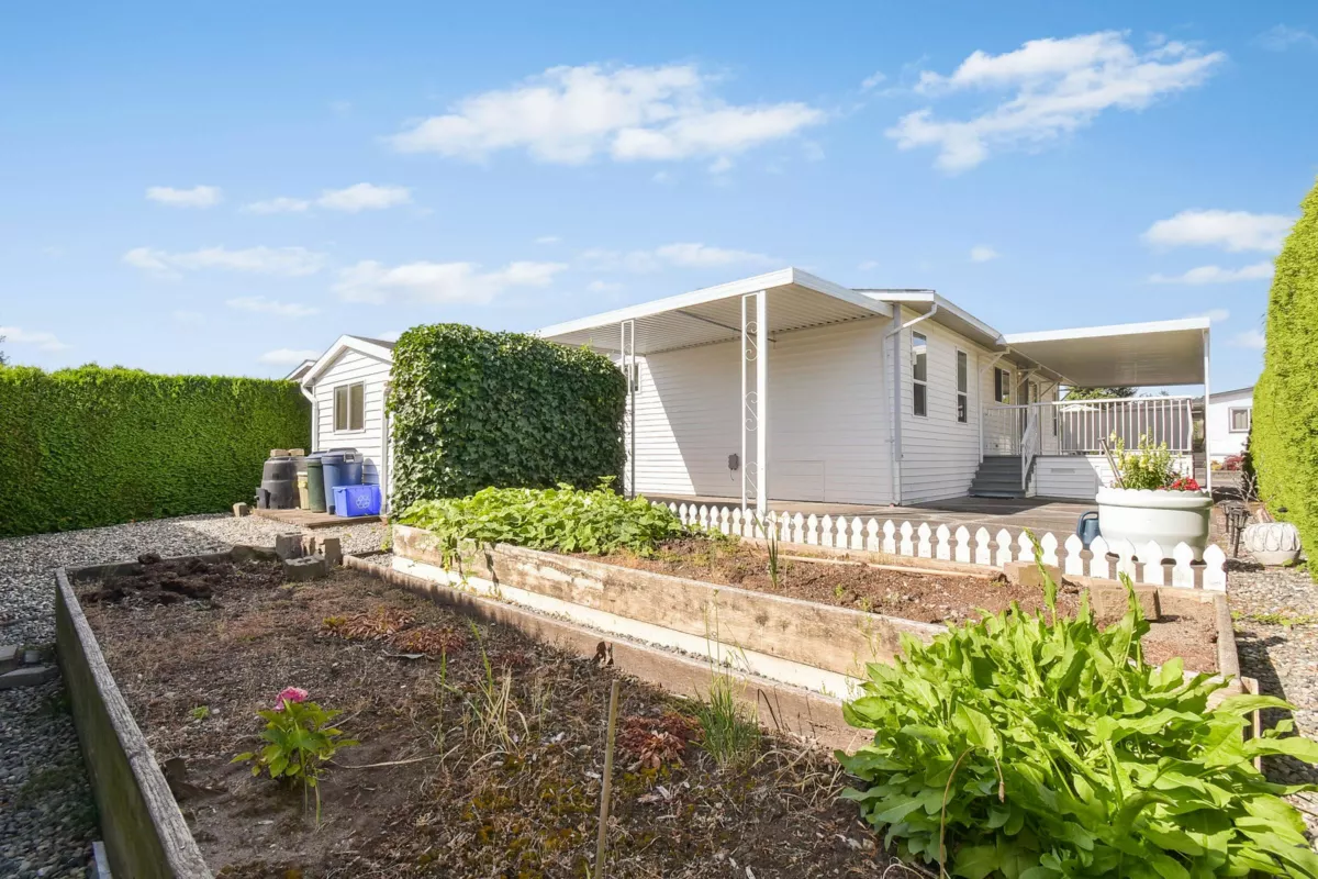 Desirable Sunnyside Estates! Bright, immaculate, move-in ready 2-bed, 2-bath manufactured home on a 4,068 sq ft owned lot with low strata fees. Features covered deck, large concrete patio, private yard with mature cedar hedge, and vegetable garden. Inside: newer vinyl windows, luxury vinyl flooring, spacious laundry room with deep freeze, window blinds, Murphy bed in guest room, and gas fireplace. Updates include: Brand new roof 2025, newer furnace & hot water tank. Perimeter skirting is fully insulated and dry for storage and energy efficiency. Pride of ownership shines! Workshop, pet-friendly, no age restrictions. Central to shopping, transit & more.