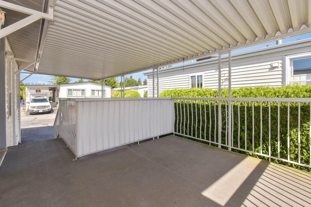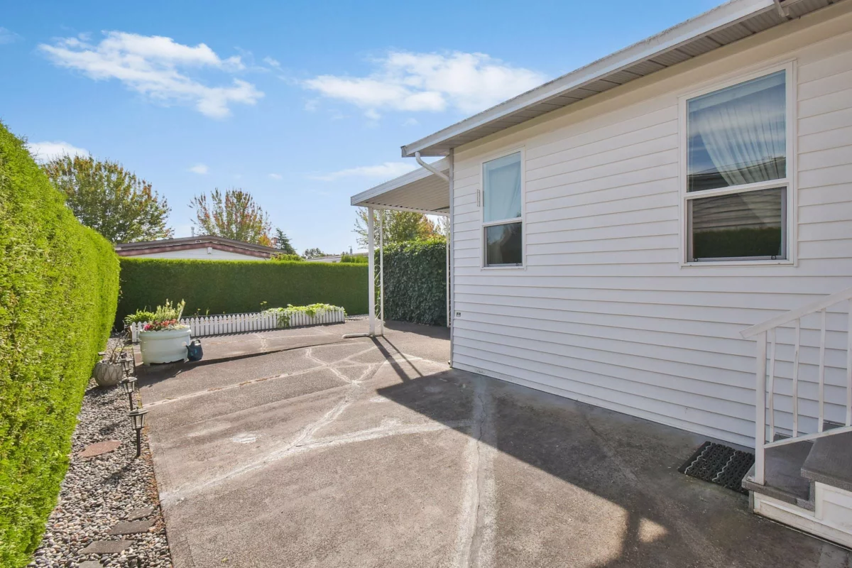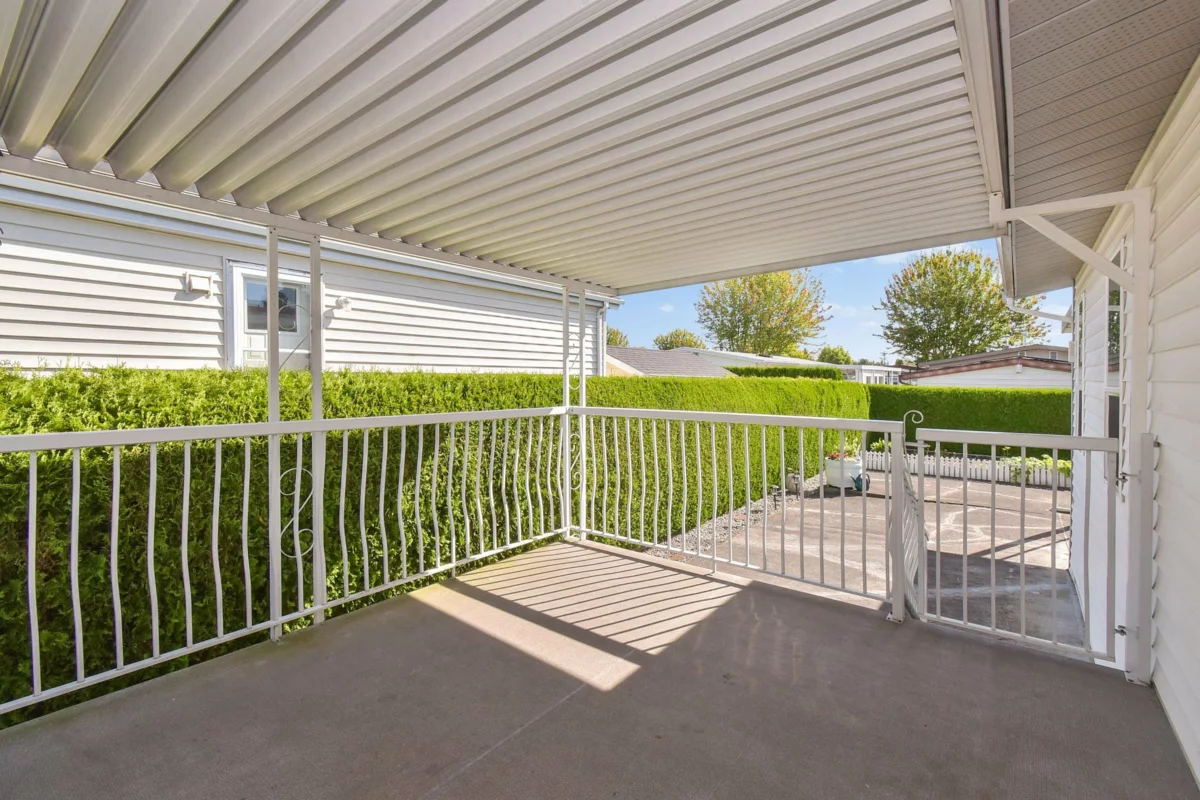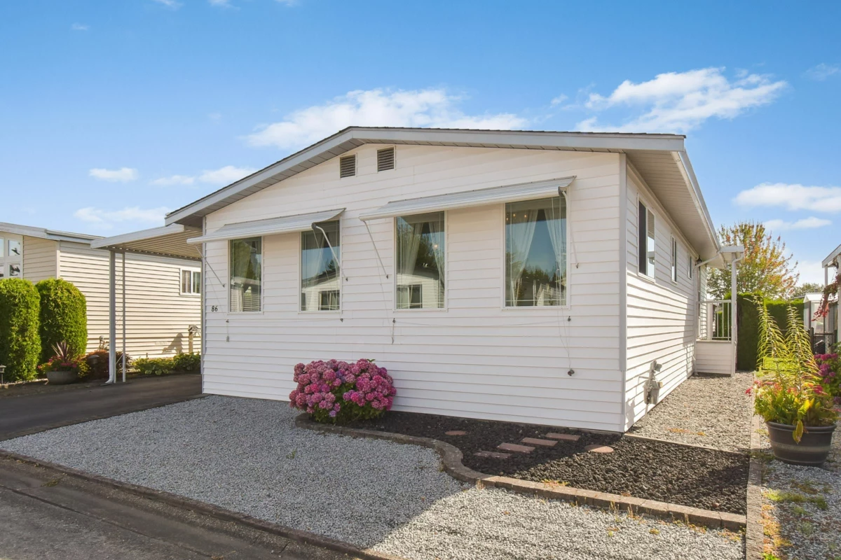 Desirable Sunnyside Estates! Bright, immaculate, move-in ready 2-bed, 2-bath manufactured home on a 4,068 sq ft owned lot with low strata fees. Features covered deck, large concrete patio, private yard with mature cedar hedge, and vegetable garden. Inside: newer vinyl windows, luxury vinyl flooring, spacious laundry room with deep freeze, window blinds, Murphy bed in guest room, and gas fireplace. Updates include: Brand new roof 2025, newer furnace & hot water tank. Perimeter skirting is fully insulated and dry for storage and energy efficiency. Pride of ownership shines! Workshop, pet-friendly, no age restrictions. Central to shopping, transit & more.