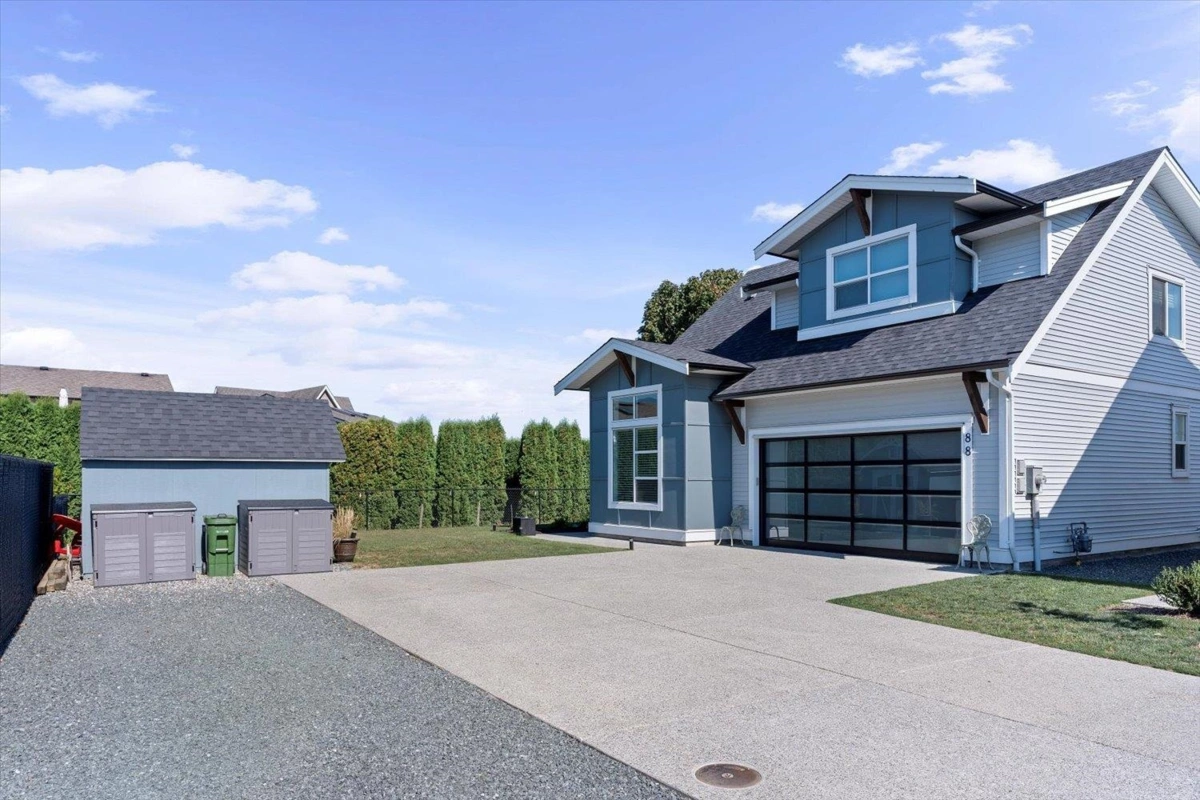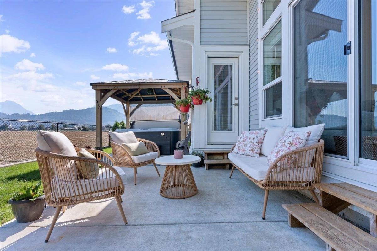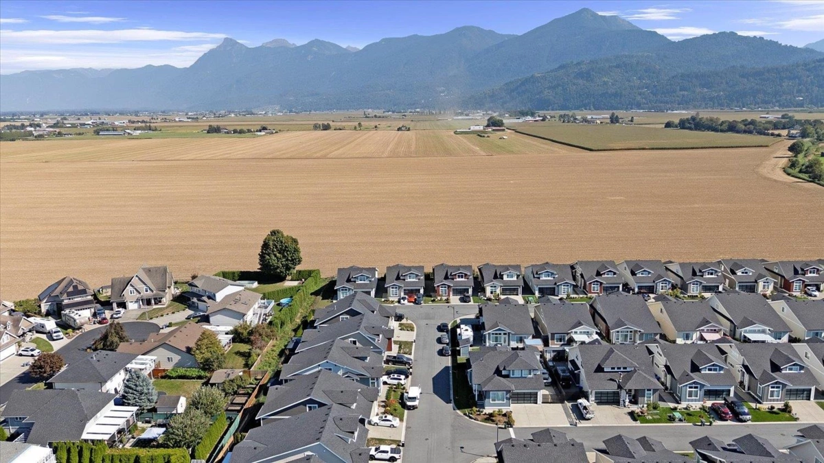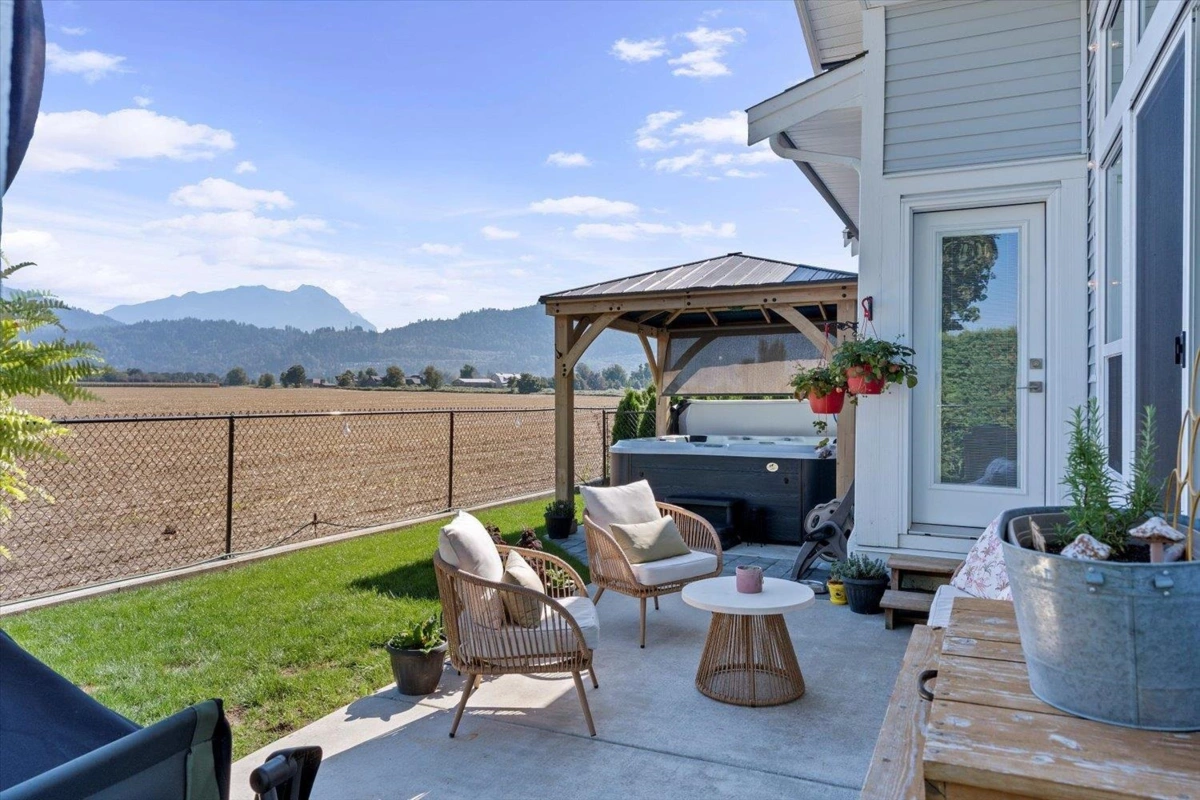 Welcome to Elysian Village! This spacious 3-bedroom rancher with loft is set on one of the largest corner lots in the community. The thoughtfully designed floor plan offers a primary bedroom and den on the main level, plus two additional bedrooms and a generous open loft upstairs. Enjoy high-end finishes throughout, including quartz countertops, a chef’s kitchen with gas range, and built-in cabinets in the laundry room. Relax in your fully fenced yard featuring a covered patio, natural gas BBQ hookup, and hot tub—all with unobstructed views of Mt. Cheam. Additional highlights include air conditioning, a full 5' crawl space for storage, a double garage, and driveway parking for up to eight vehicles. This home combines luxury, comfort, and functionality in a prime setting.