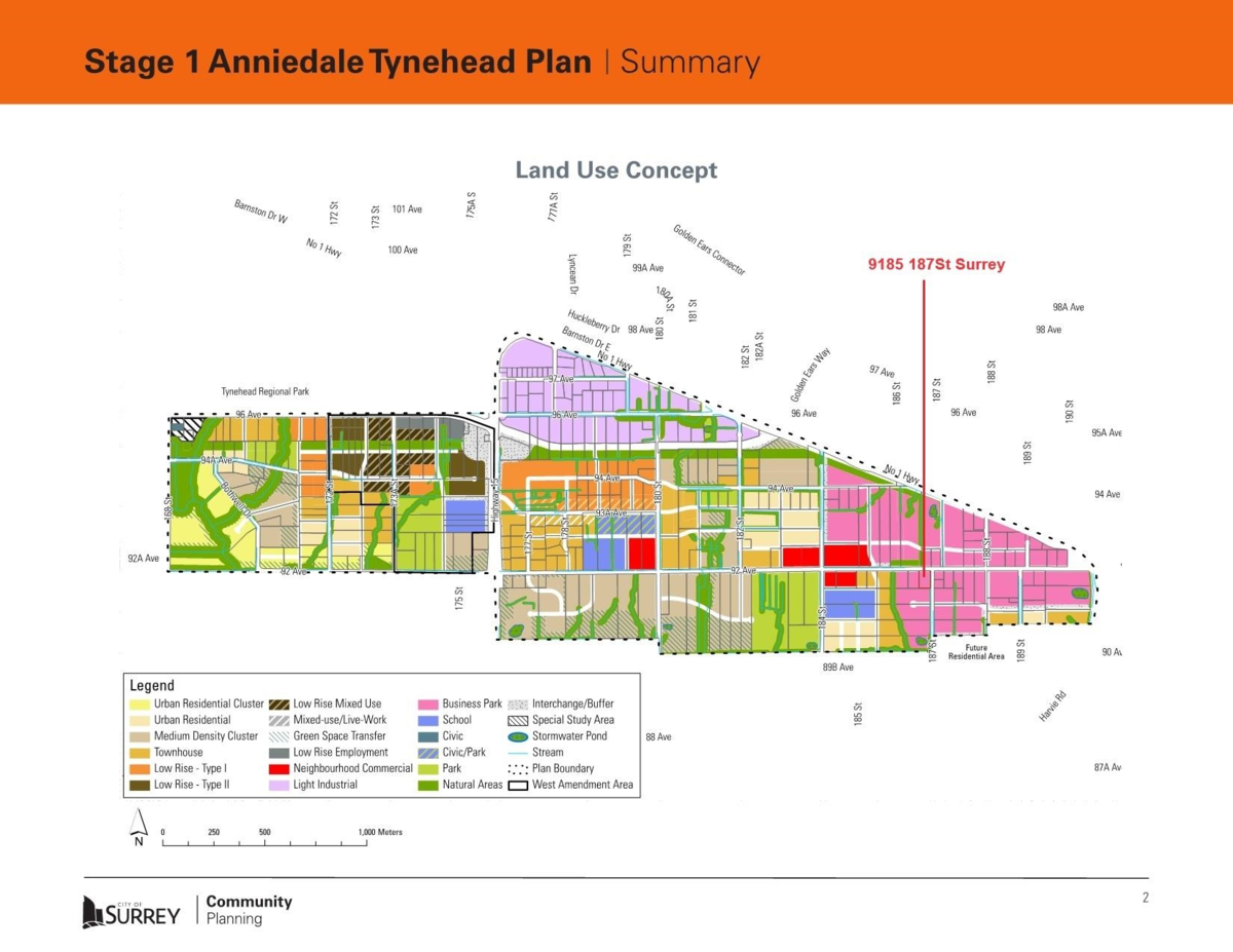 Over $700,000 below the assessment value!!!! 2 separated BUILDINGS + big storage shed on this 1.142 acre CORNER LOT with 2 entrances to the properties, designated for business park in Anniedale-Tynehead Stage 2 NCP. Extremely private and central location. Main house includes: 2 bedroom 2 full bathroom, huge livingroom, family room and den. Second cottage house include: kitchen, dining area, living room and 2 bedroom 1 bathroom. Huge Storage shed. Listing price is based on land value, house/cottage needs TLC but have huge potential. Corner Lot permit easy access to the property from 92 ave or 187 st. Quick access to highway 17 & highway 1. Minutes to freeway and all amenities. Floor Plan shows building A (1,446 sqft) & building B (528 sqft) & Storage (217 sqft). LOTS OF POTENTIAL!!