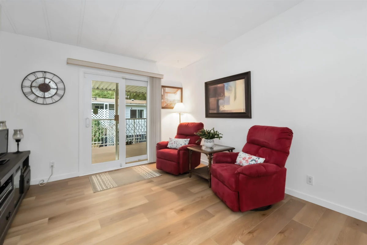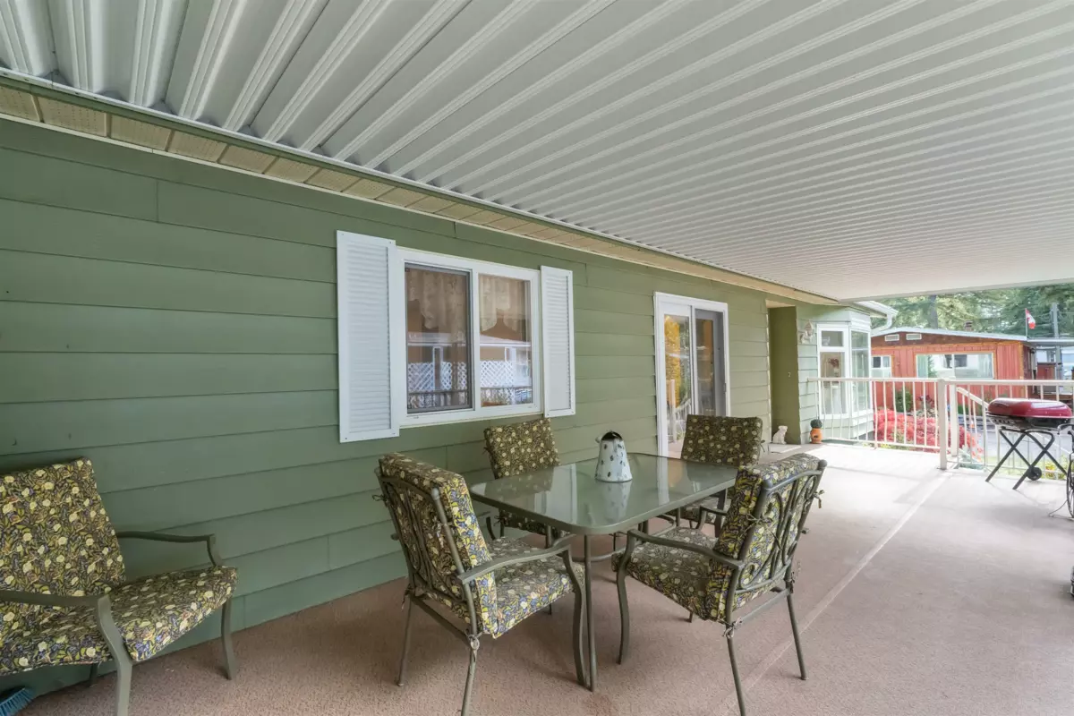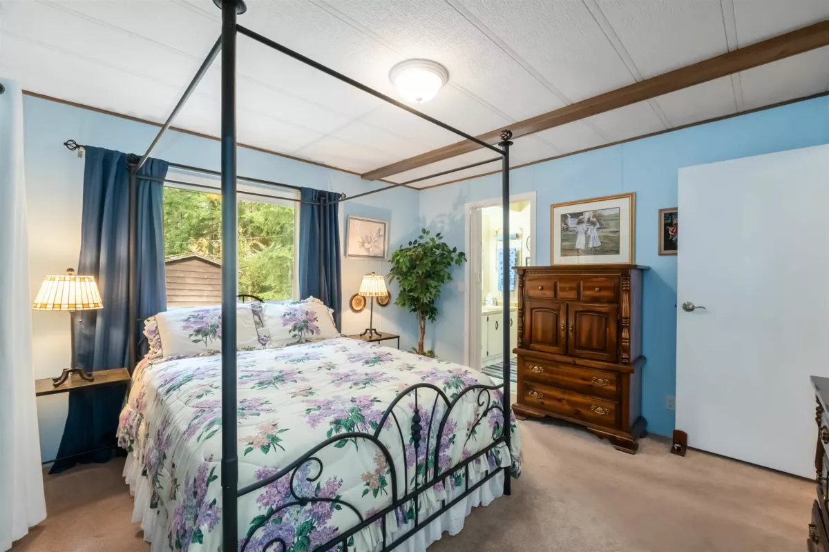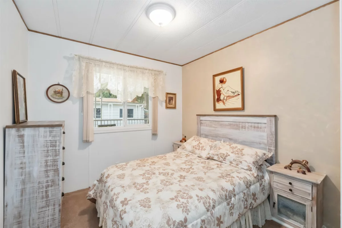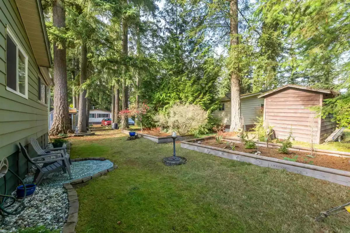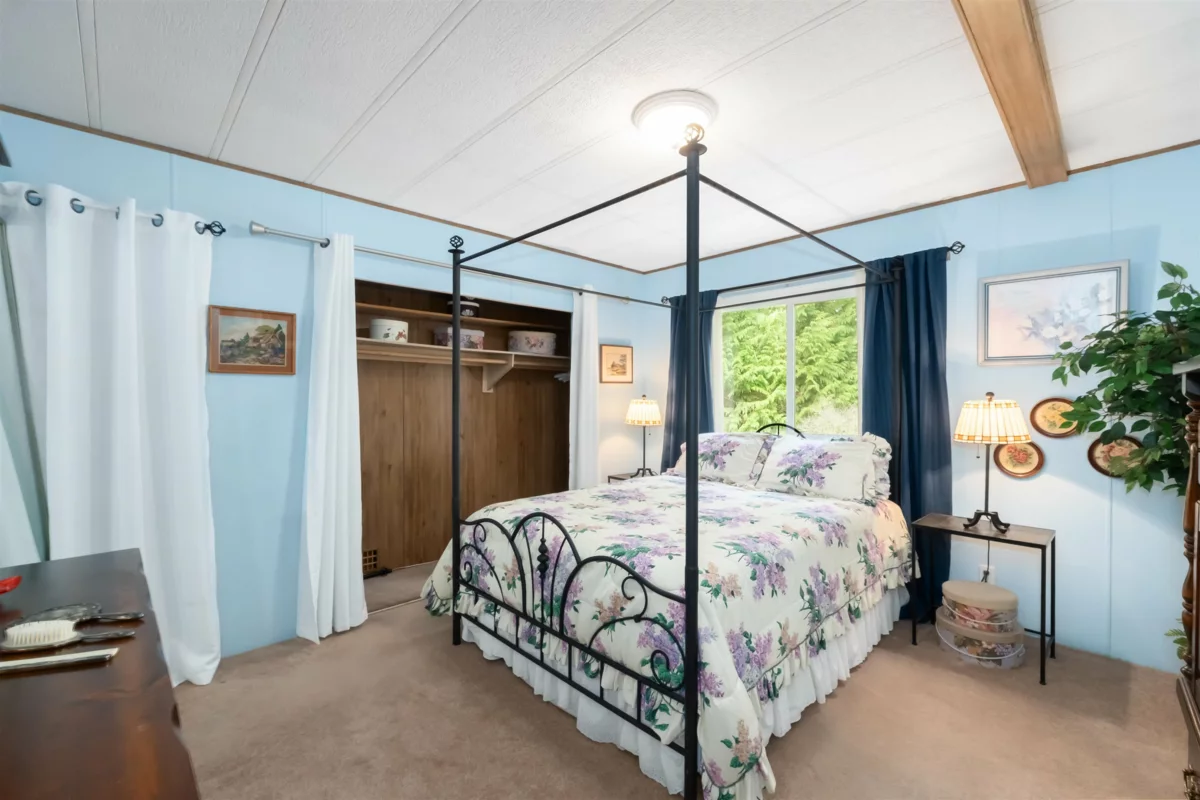 This spacious double-wide home is move-in ready and perfectly situated in a great location in the park. Features include a new roof, vaulted ceilings, updated plumbing, kitchen and bathroom with walk in shower. Newer washer/dryer & fridge. Nestled among mature trees, it offers a peaceful setting with two covered decks for year-round BBQs, entertaining and also has covered parking. There's loads of space for your gardening desires, two large sheds for storage or create a workshop. The bonus room off the deck has its own entrance and could be a studio, or hobby space. Enjoy the community clubhouse & welcoming neighbours in this well-run community. RV parking available, and walking distance to IGA, The Artful Dodger Pub, and other local amenities. 55+ community and sorry no pets allowed.