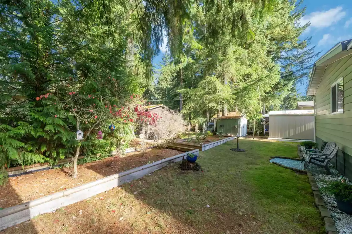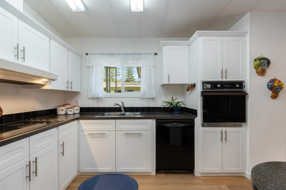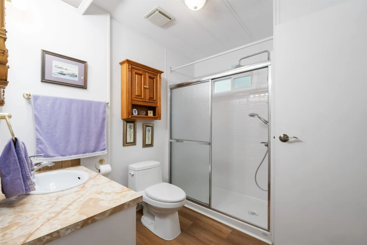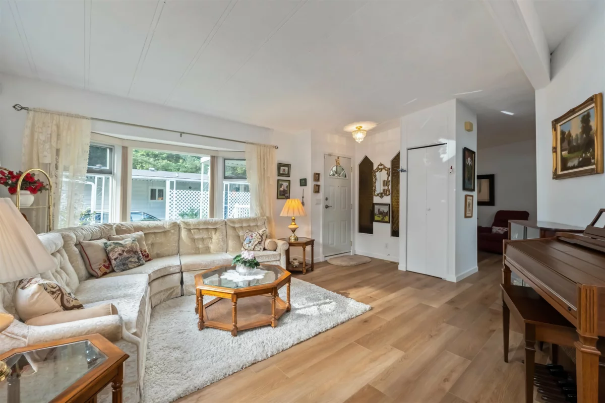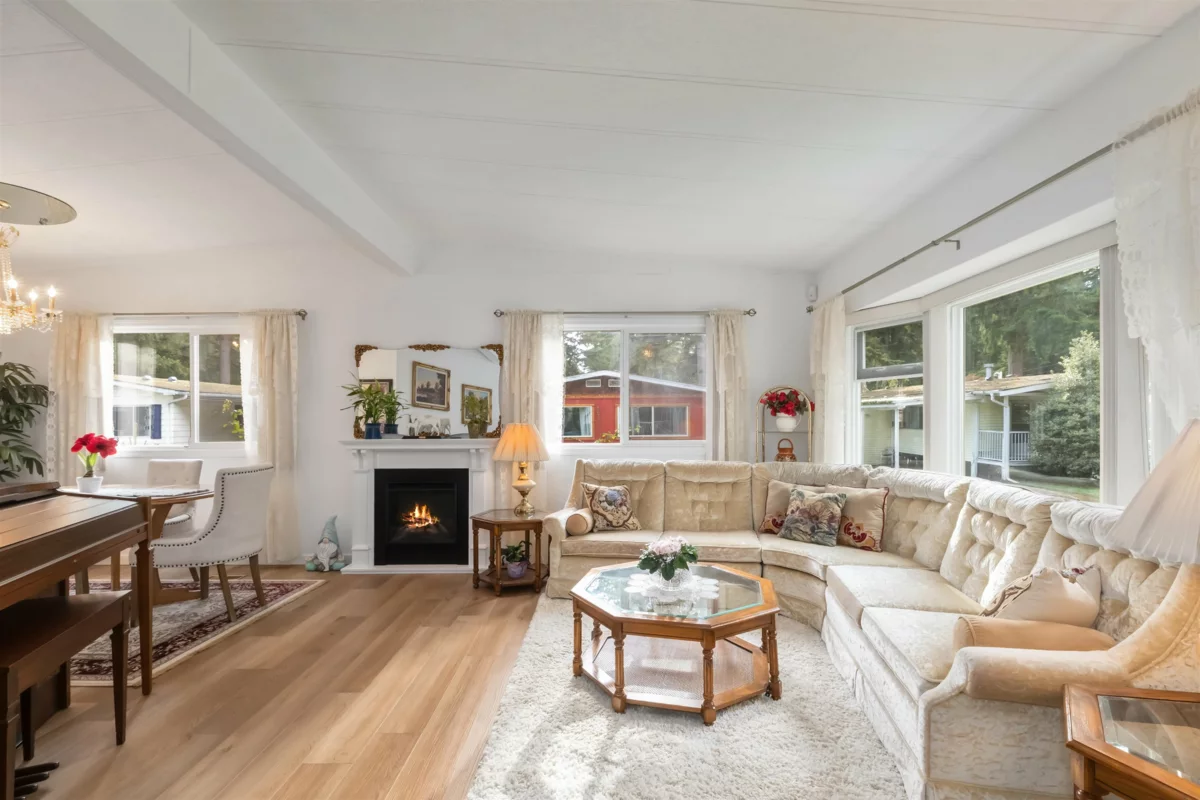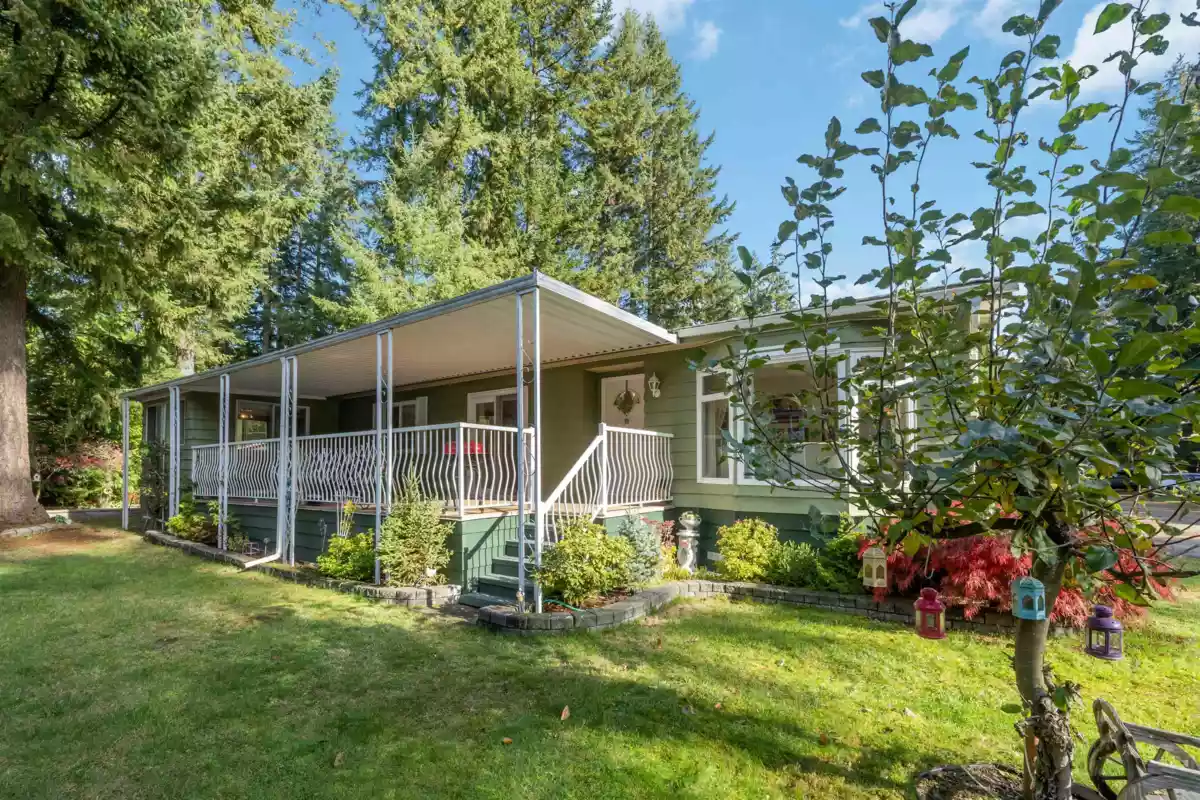 This spacious double-wide home is move-in ready and perfectly situated in a great location in the park. Features include a new roof, vaulted ceilings, updated plumbing, kitchen and bathroom with walk in shower. Newer washer/dryer & fridge. Nestled among mature trees, it offers a peaceful setting with two covered decks for year-round BBQs, entertaining and also has covered parking. There's loads of space for your gardening desires, two large sheds for storage or create a workshop. The bonus room off the deck has its own entrance and could be a studio, or hobby space. Enjoy the community clubhouse & welcoming neighbours in this well-run community. RV parking available, and walking distance to IGA, The Artful Dodger Pub, and other local amenities. 55+ community and sorry no pets allowed.