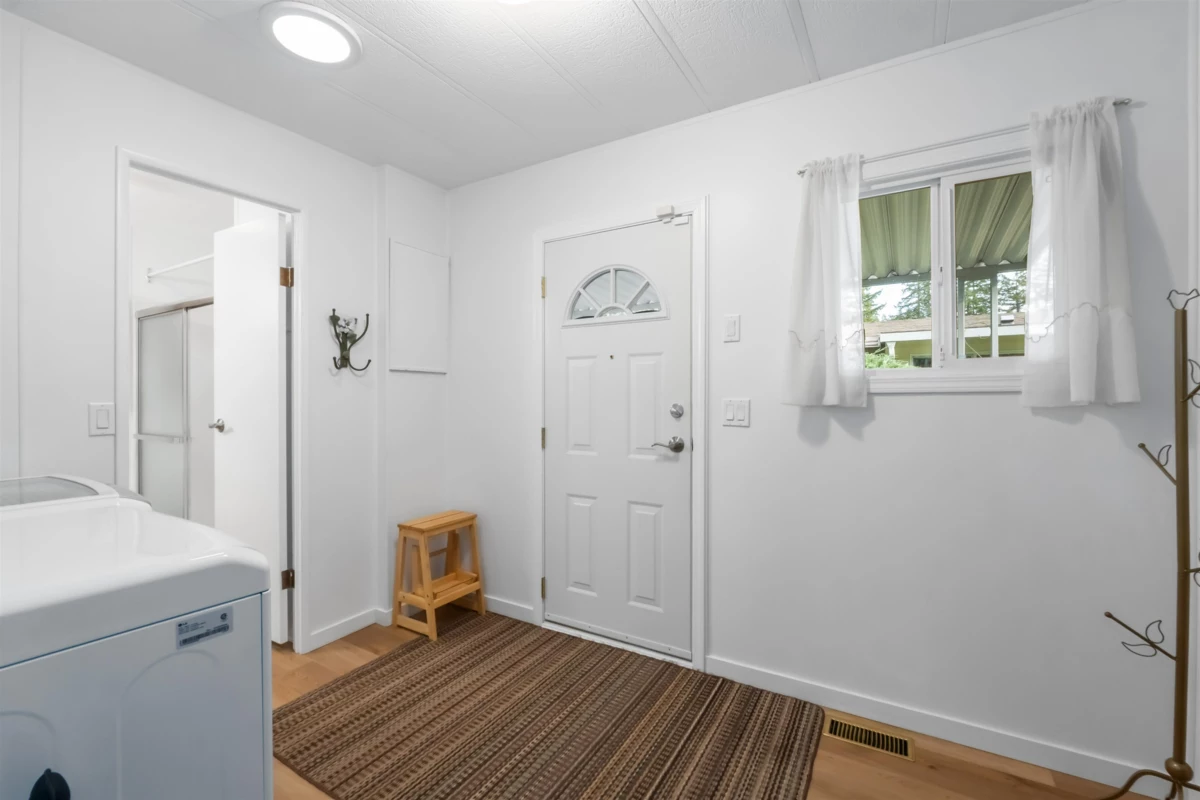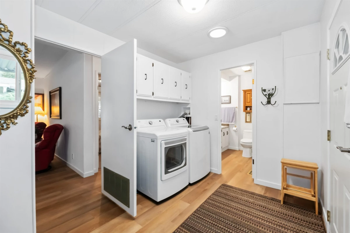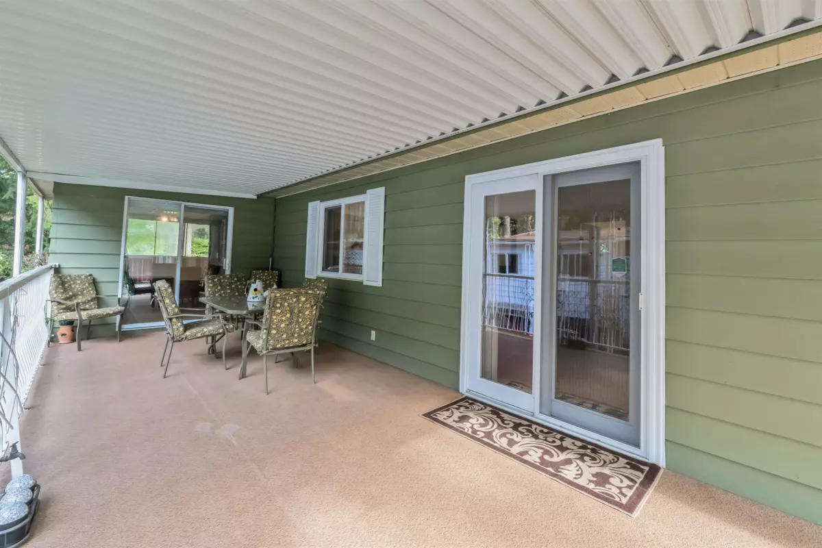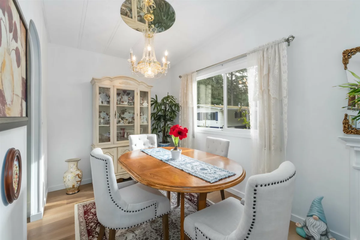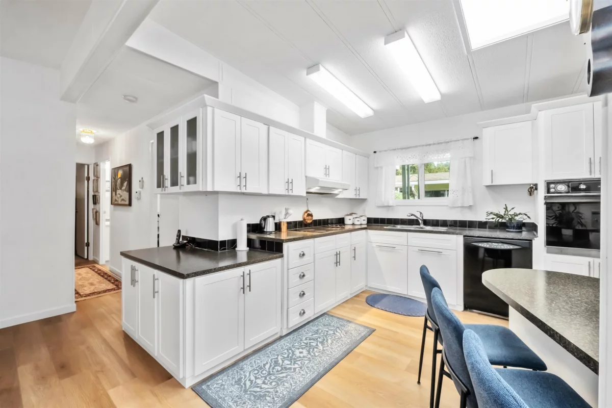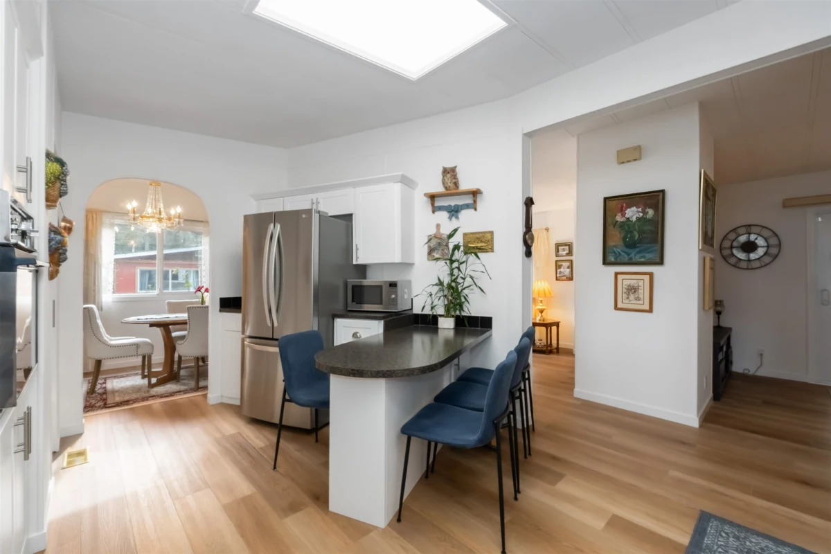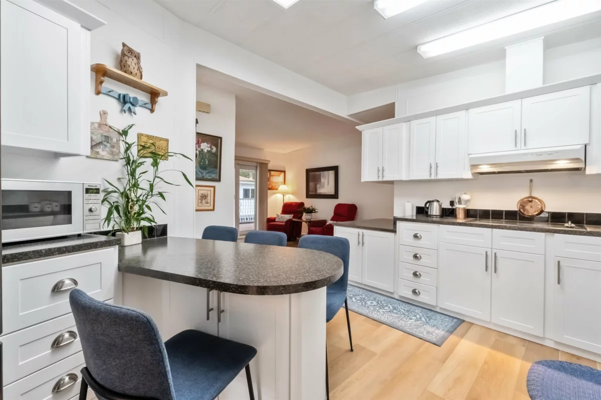 This spacious double-wide home is move-in ready and perfectly situated in a great location in the park. Features include a new roof, vaulted ceilings, updated plumbing, kitchen and bathroom with walk in shower. Newer washer/dryer & fridge. Nestled among mature trees, it offers a peaceful setting with two covered decks for year-round BBQs, entertaining and also has covered parking. There's loads of space for your gardening desires, two large sheds for storage or create a workshop. The bonus room off the deck has its own entrance and could be a studio, or hobby space. Enjoy the community clubhouse & welcoming neighbours in this well-run community. RV parking available, and walking distance to IGA, The Artful Dodger Pub, and other local amenities. 55+ community and sorry no pets allowed.