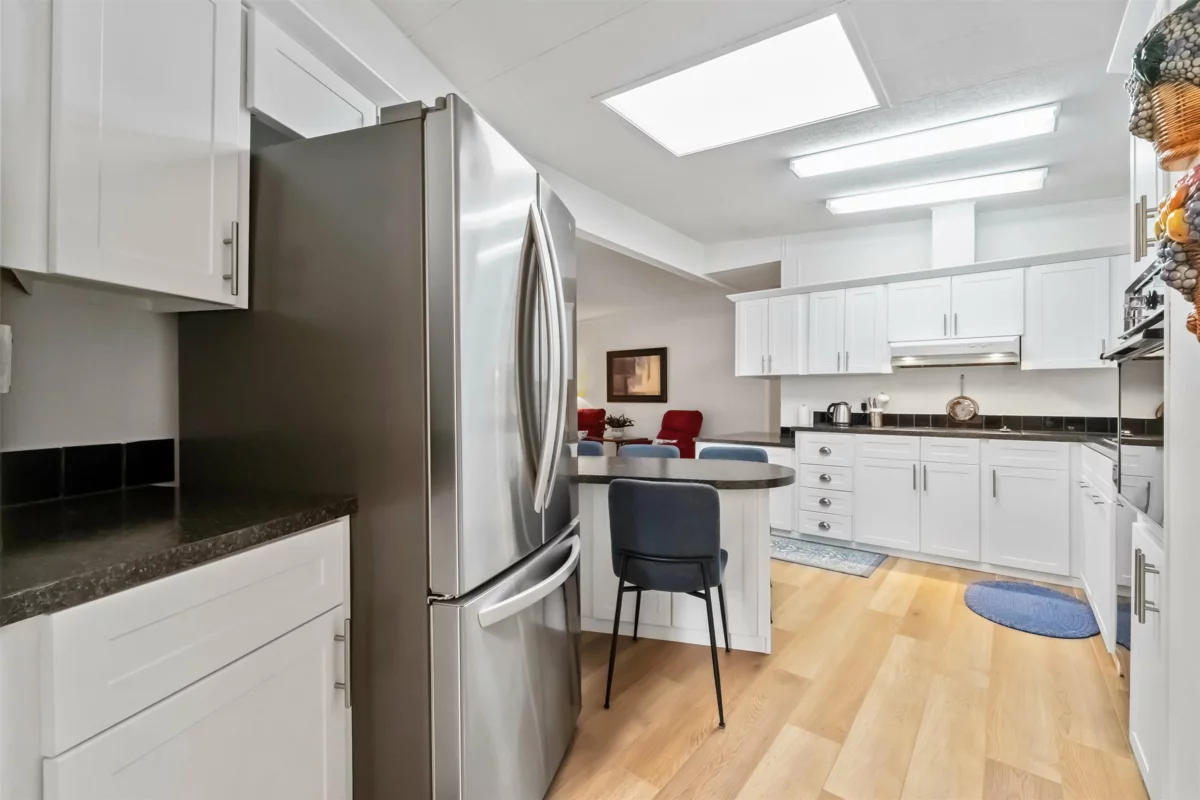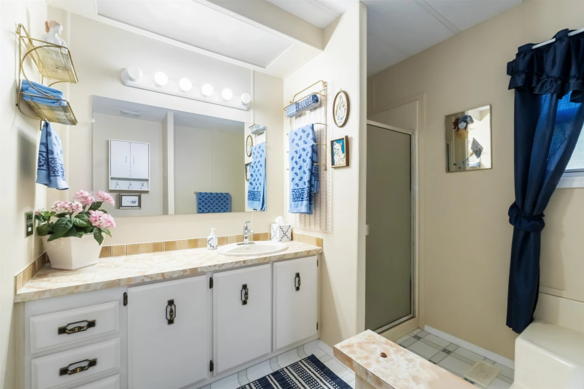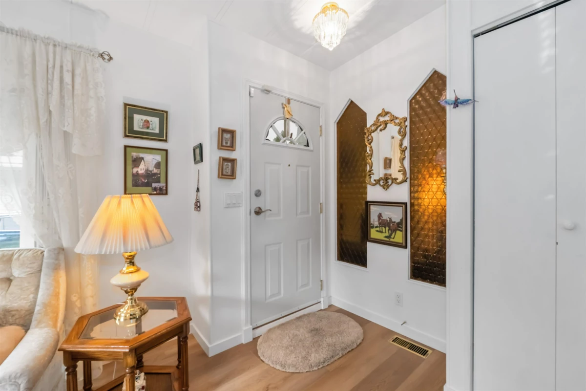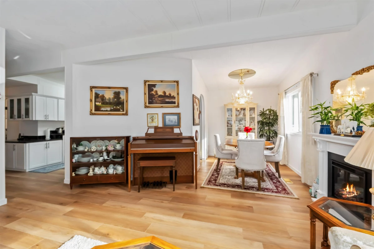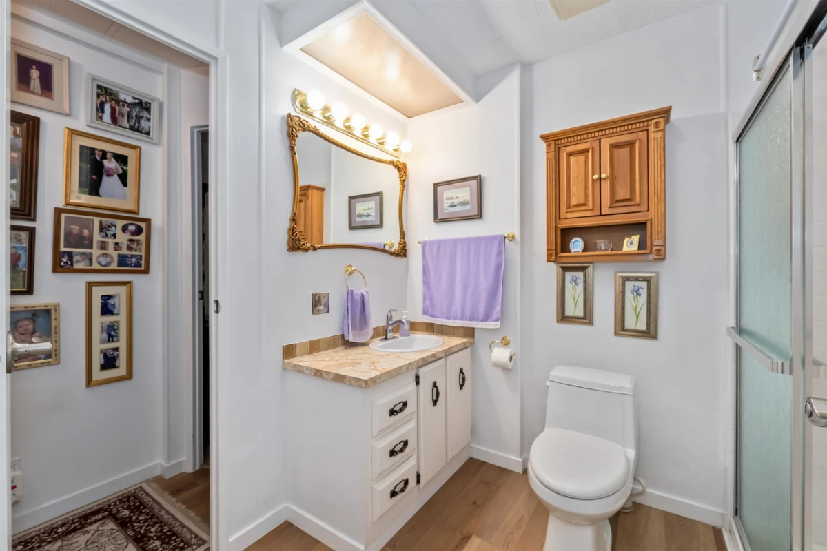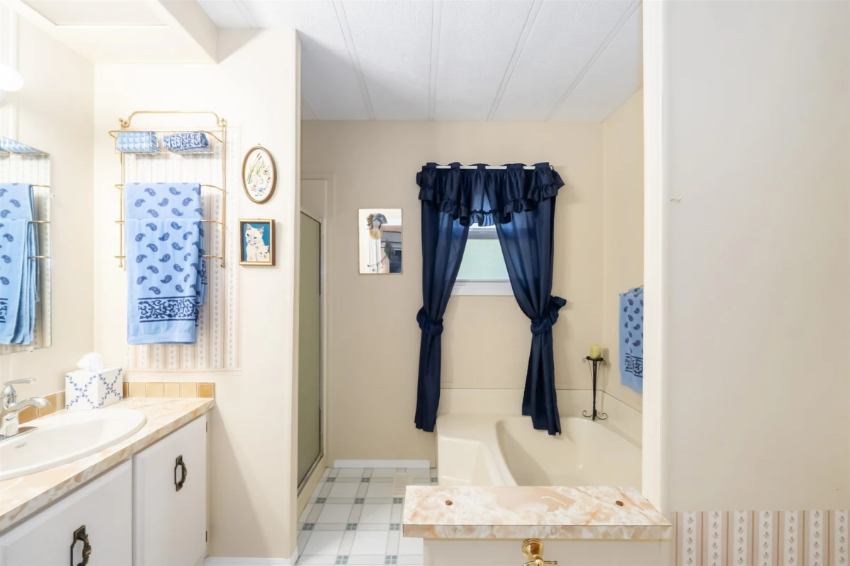 This spacious double-wide home is move-in ready and perfectly situated in a great location in the park. Features include a new roof, vaulted ceilings, updated plumbing, kitchen and bathroom with walk in shower. Newer washer/dryer & fridge. Nestled among mature trees, it offers a peaceful setting with two covered decks for year-round BBQs, entertaining and also has covered parking. There's loads of space for your gardening desires, two large sheds for storage or create a workshop. The bonus room off the deck has its own entrance and could be a studio, or hobby space. Enjoy the community clubhouse & welcoming neighbours in this well-run community. RV parking available, and walking distance to IGA, The Artful Dodger Pub, and other local amenities. 55+ community and sorry no pets allowed.
