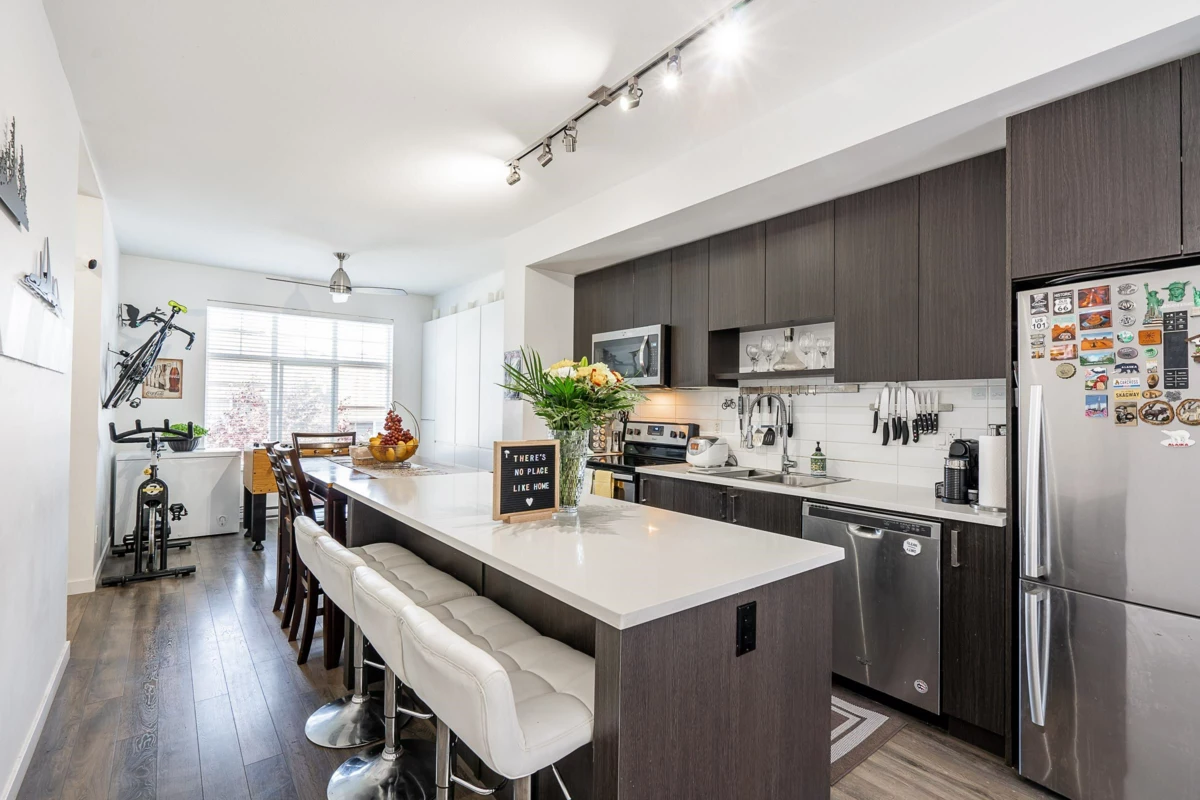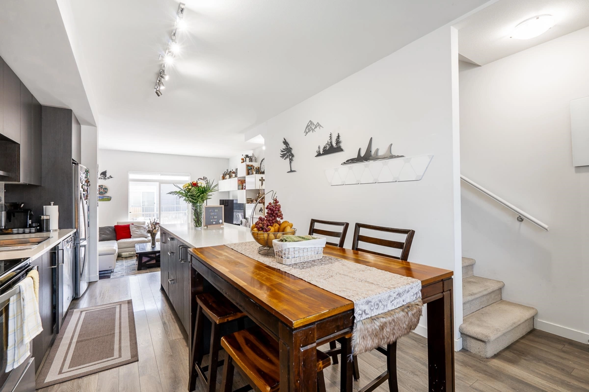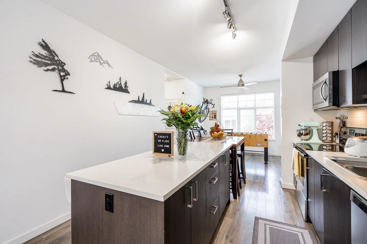 Your search is over! The main level of this beautiful 4-bedroom townhouse by Dawson and Sawyer offers an open concept layout, a gourmet kitchen with stainless steel appliances, a good-sized kitchen island, a powder room, and a sunken living room with access to a large balcony. Upper level consists of Master's bedroom with mountain view, upgraded walk-through closet leading to in-suite bath, 2 bedrooms and a full bath. One bedroom with full bath, front yard and 2 side by side car garage completes the lower level. Other features include extra parking space, added more storage spaces in the kitchen and master's bedroom, updated washer/dryer and recently renovated stairs. Close to transit, shopping, schools and Surrey Memorial Hospital.